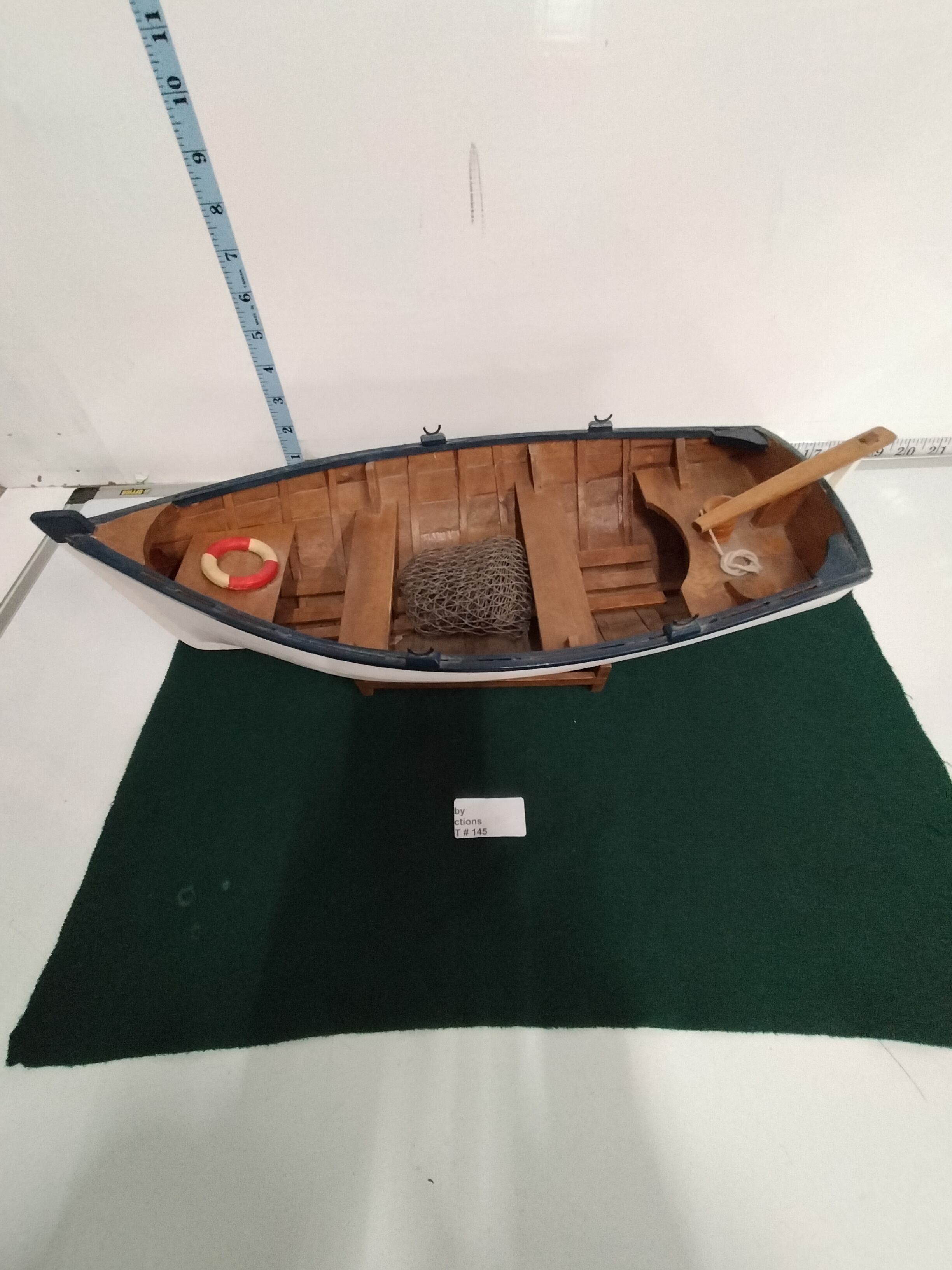 A wooden model rowboat featuring a white painted hull with blue trim, a natural wood interior, and miniature accessories including a life ring and netting, measuring approximately 19 inches in length.