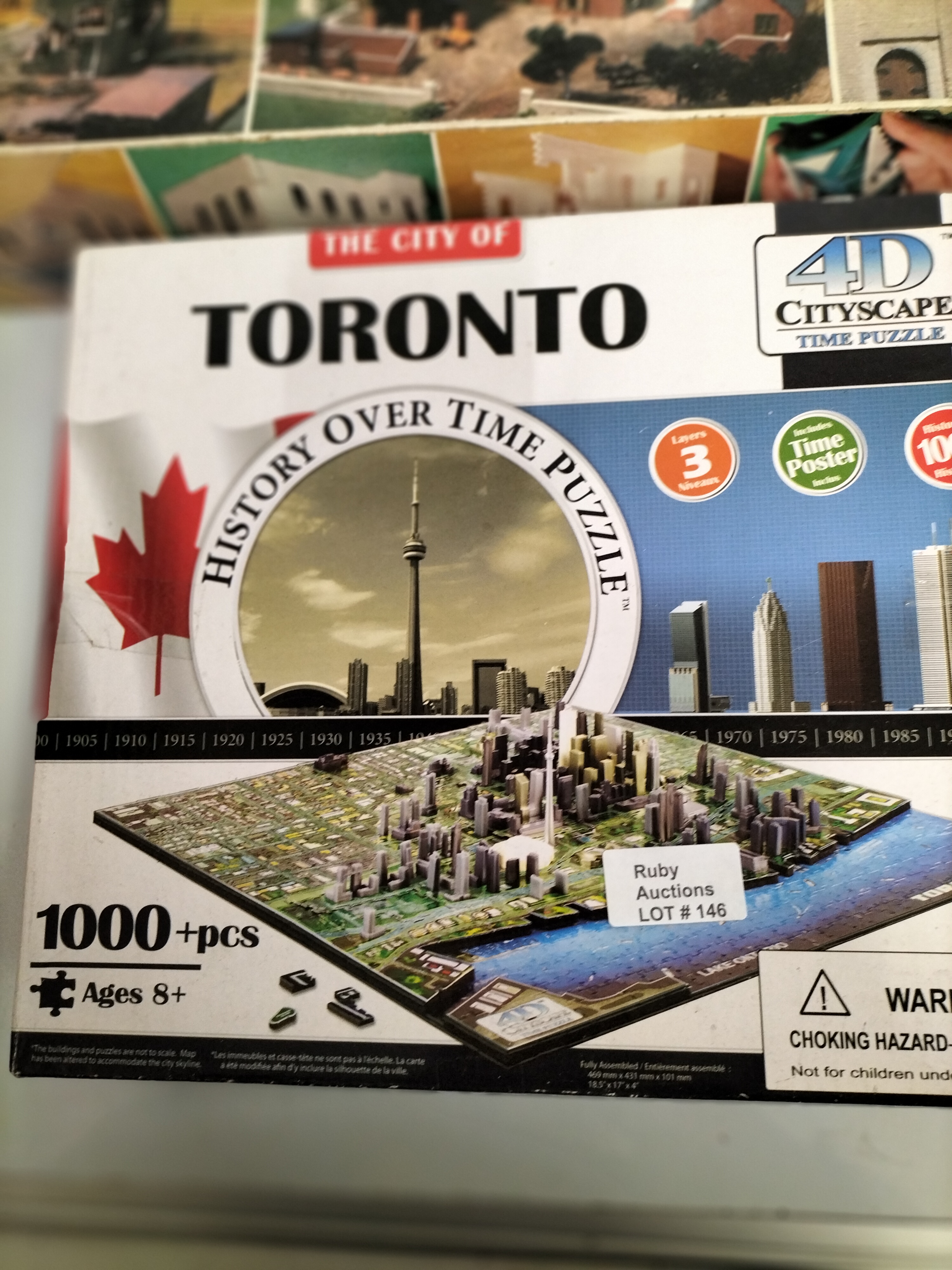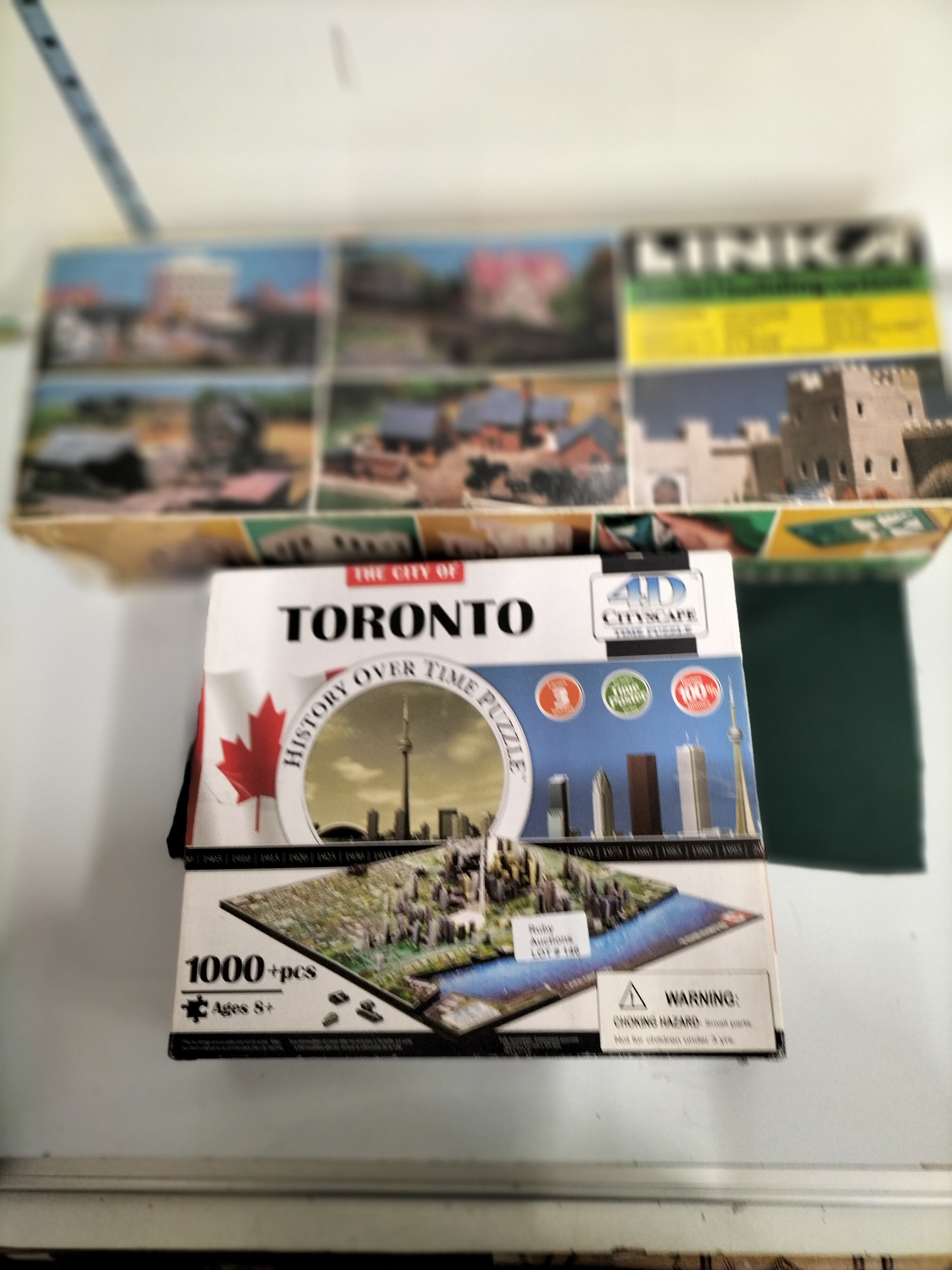 A collection of boxed building sets including a 4D Cityscape Toronto time puzzle with over 1000 pieces and a LINKA model building system kit.