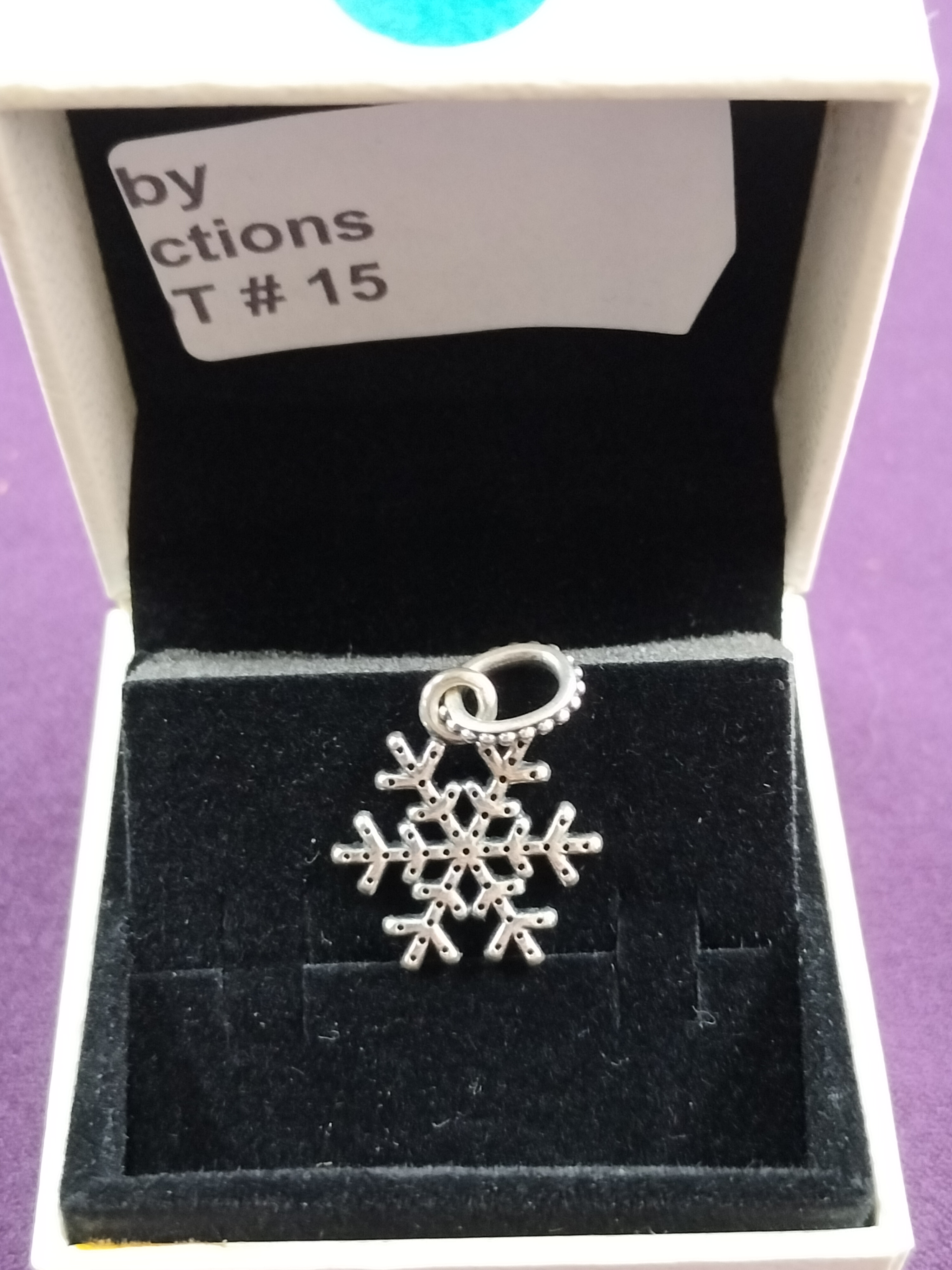 APandora silver snowflake jewellery charm presented in a white velvet-lined Pandora box
