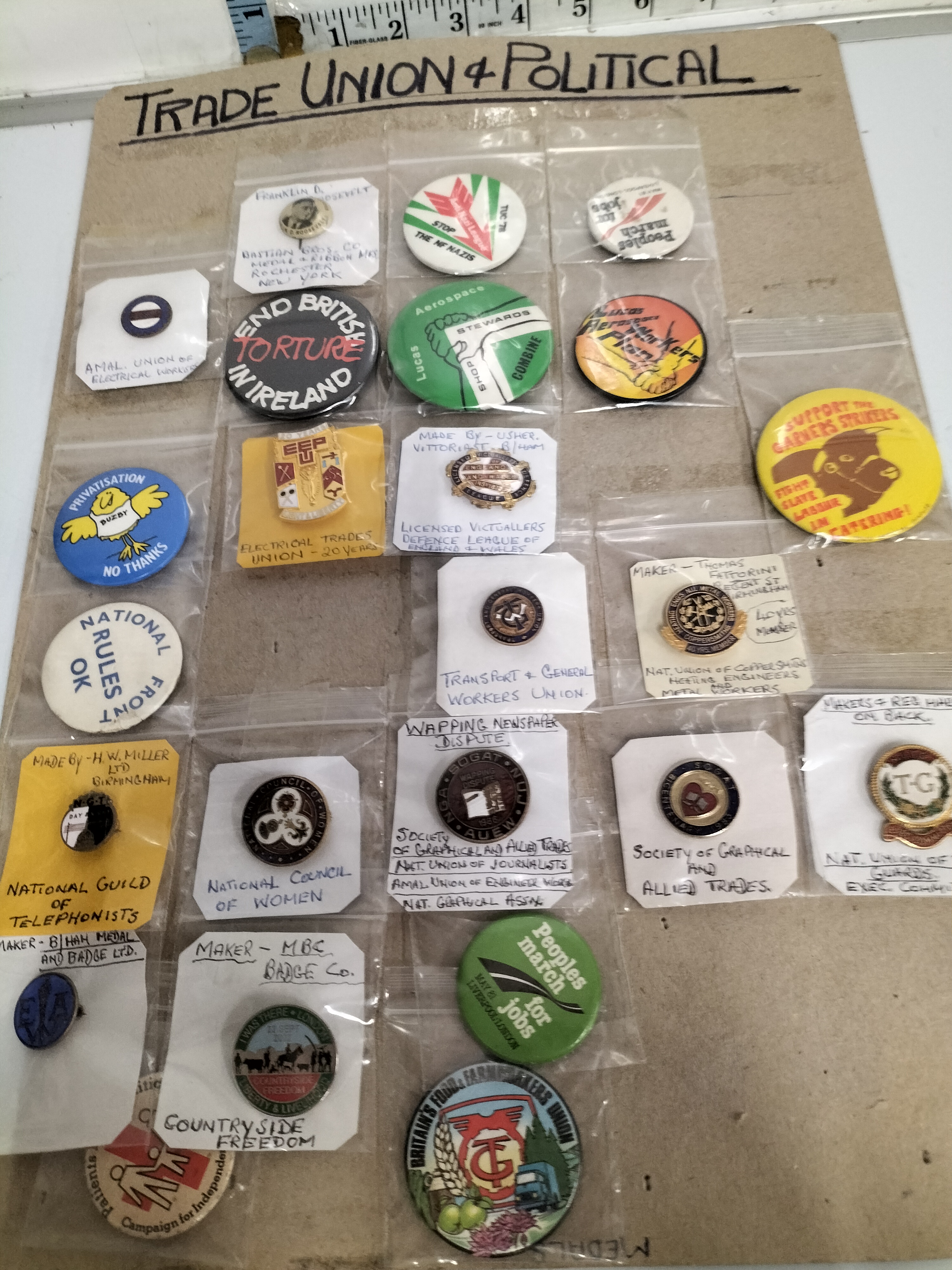 A collection of multicoloured trade union and political badges and pins, including examples from the Electrical Trades Union and Transport & General Workers Union, with individual items ranging from approximately 2cm to 5cm in diameter.