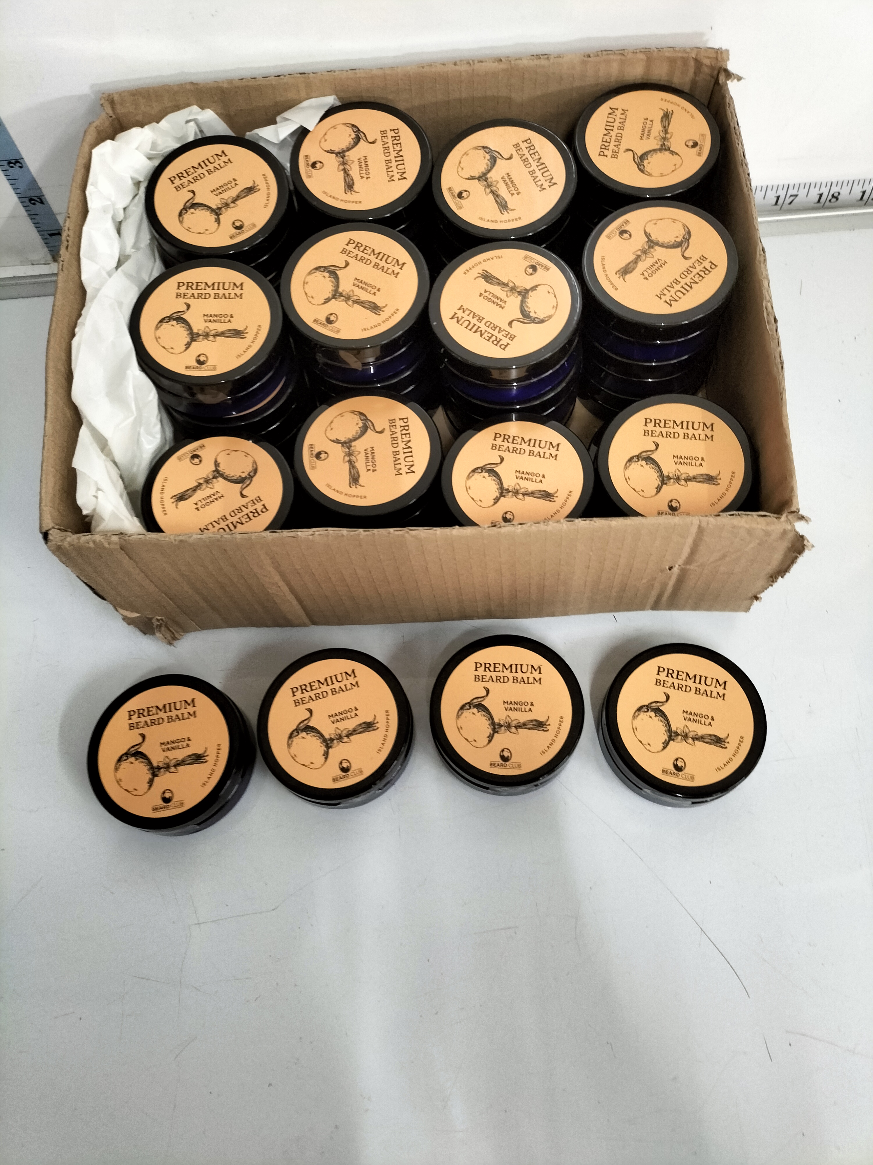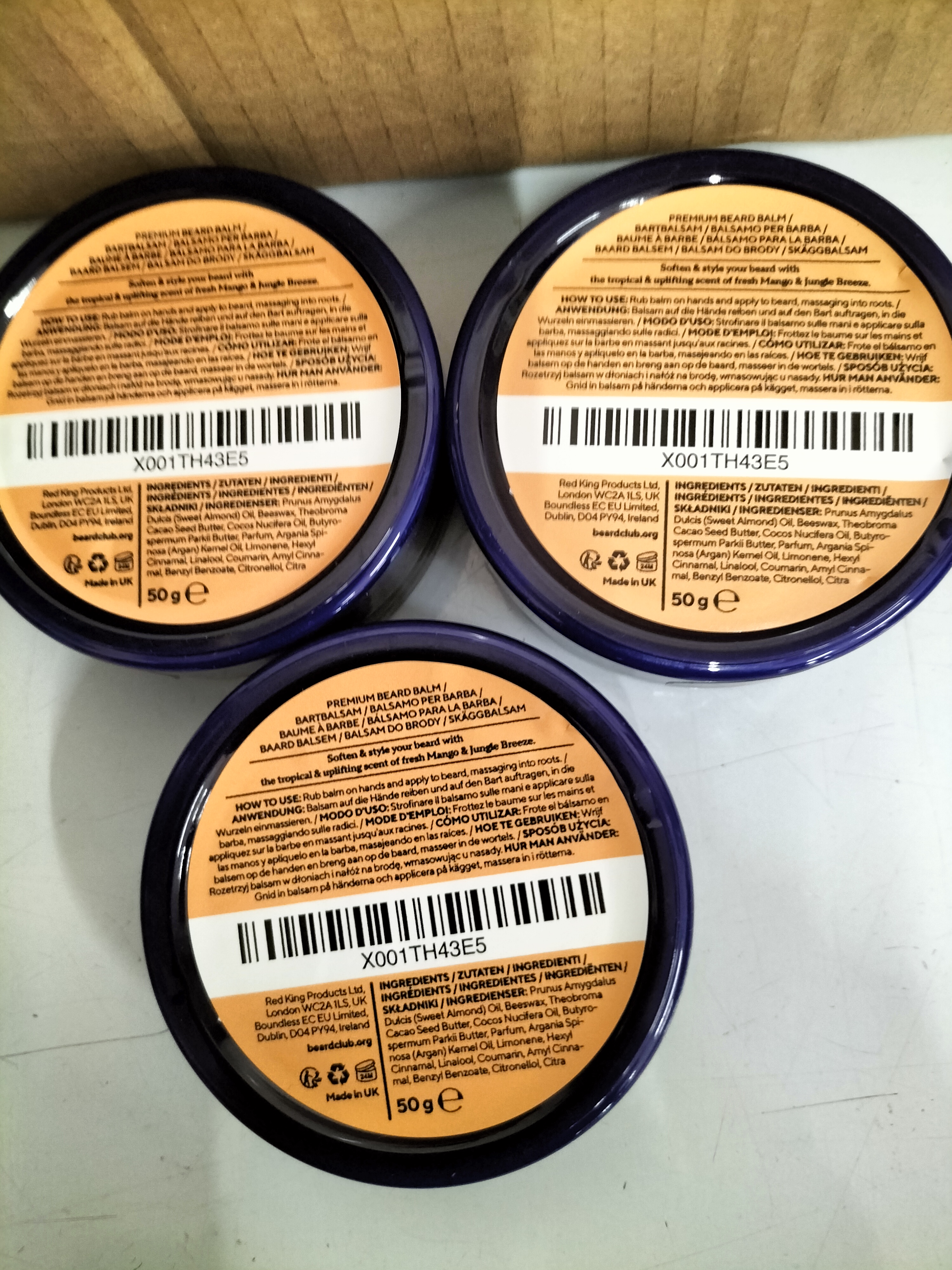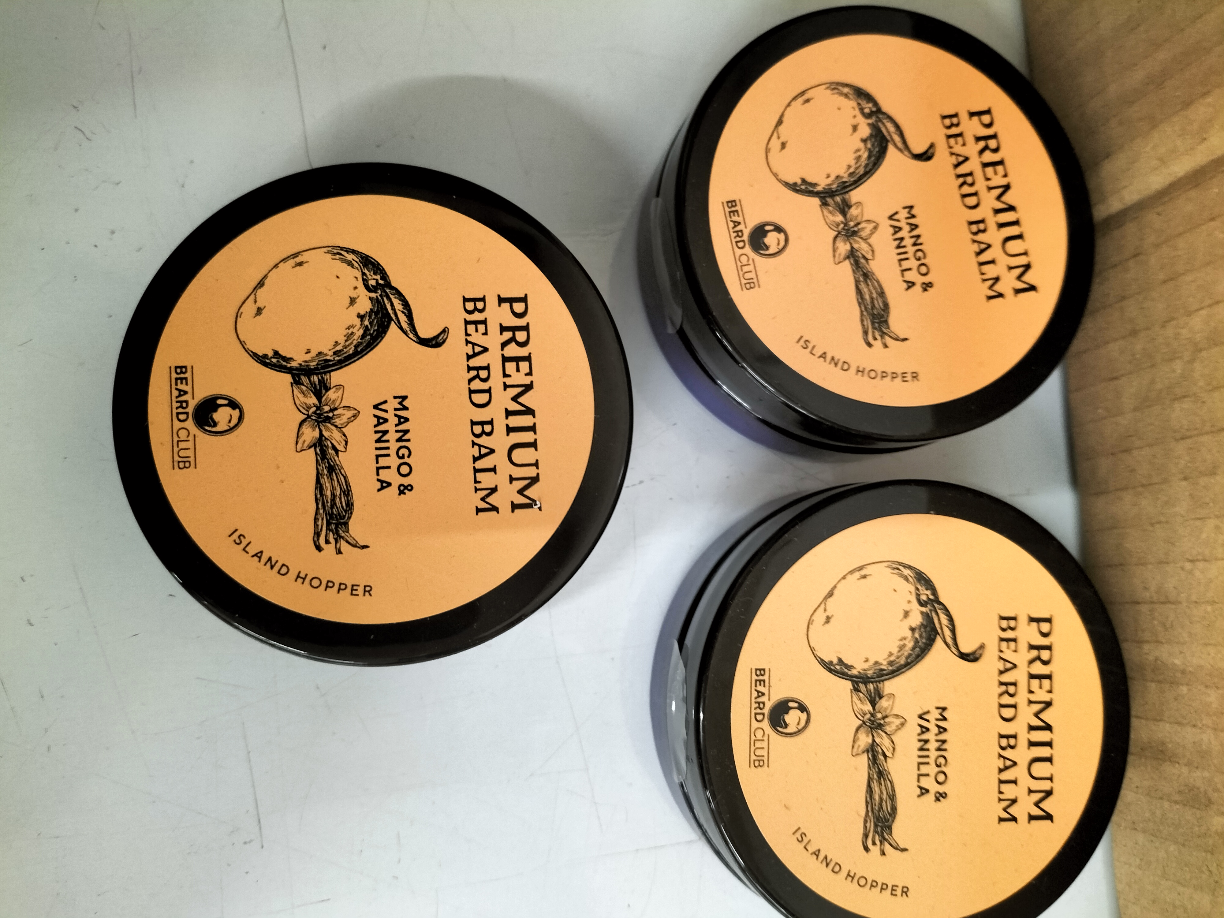 A collection of Beard Club Premium Beard Balm tins in Island Hopper Mango and Vanilla scent, each weighing 50g and manufactured by Red King Products Ltd in the UK.