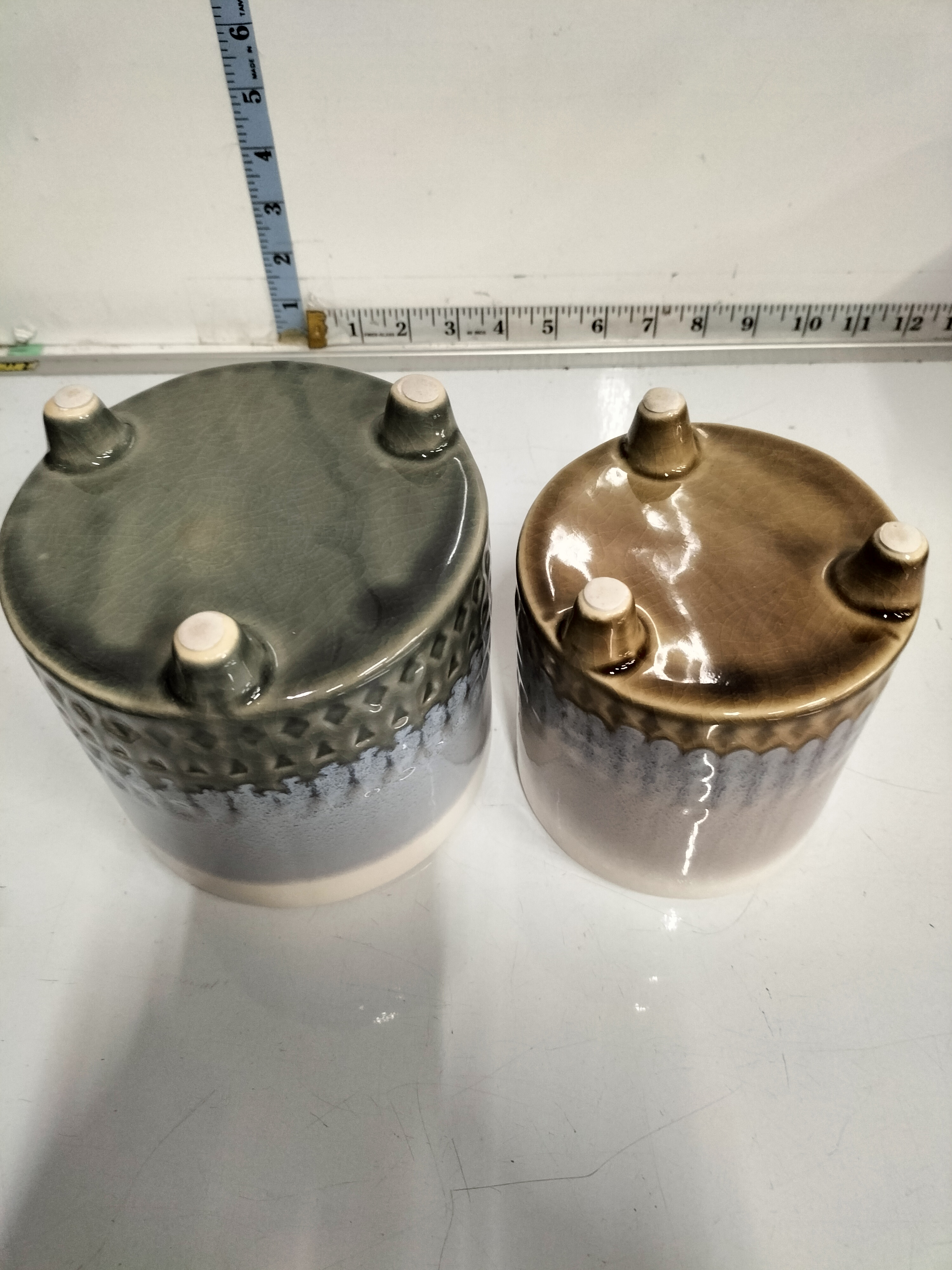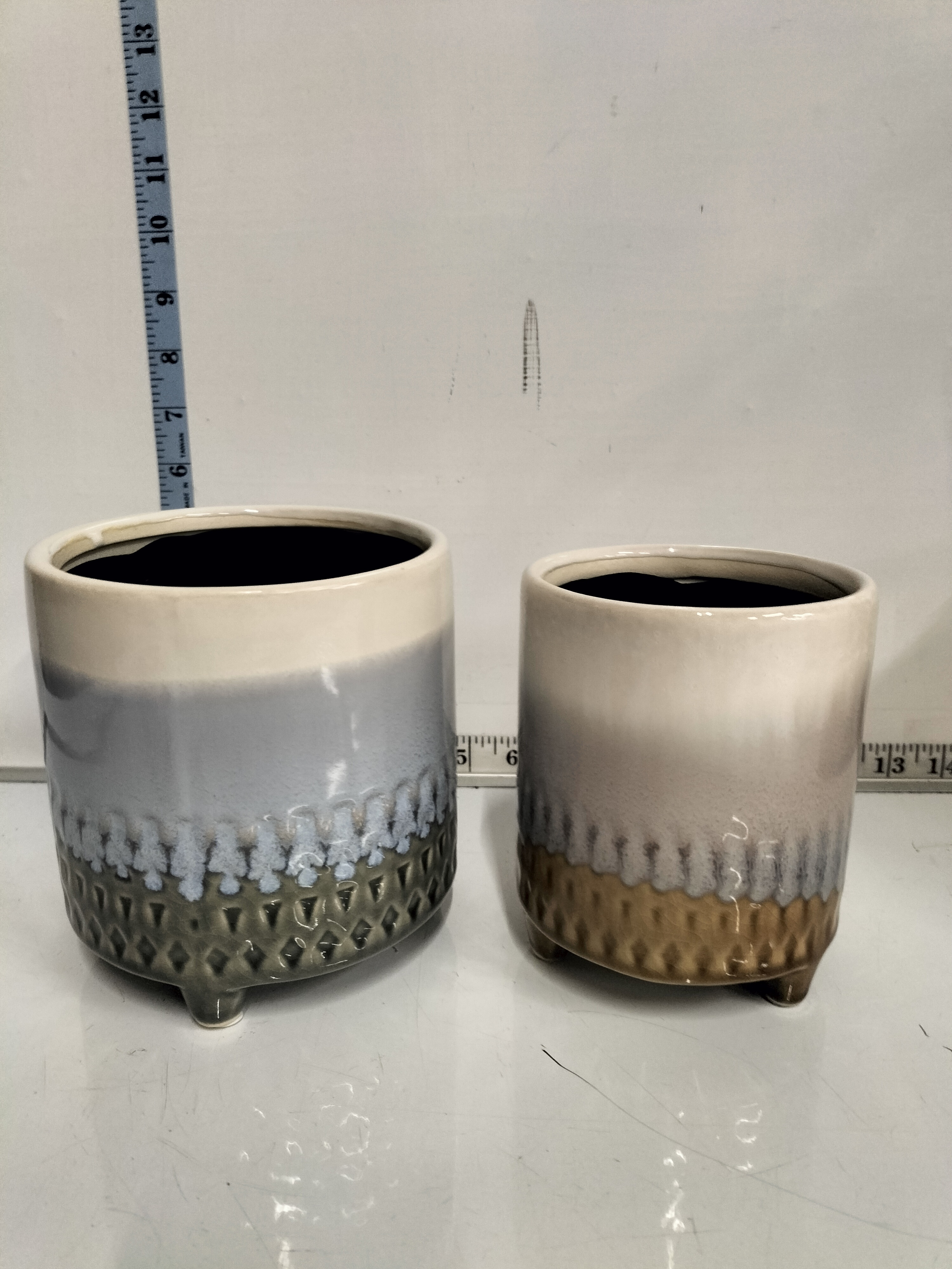 A pair of round ceramic planter sets featuring a textured tri-colour glaze in white, grey, and brown tones, measuring approximately 13cm to 15cm in height.