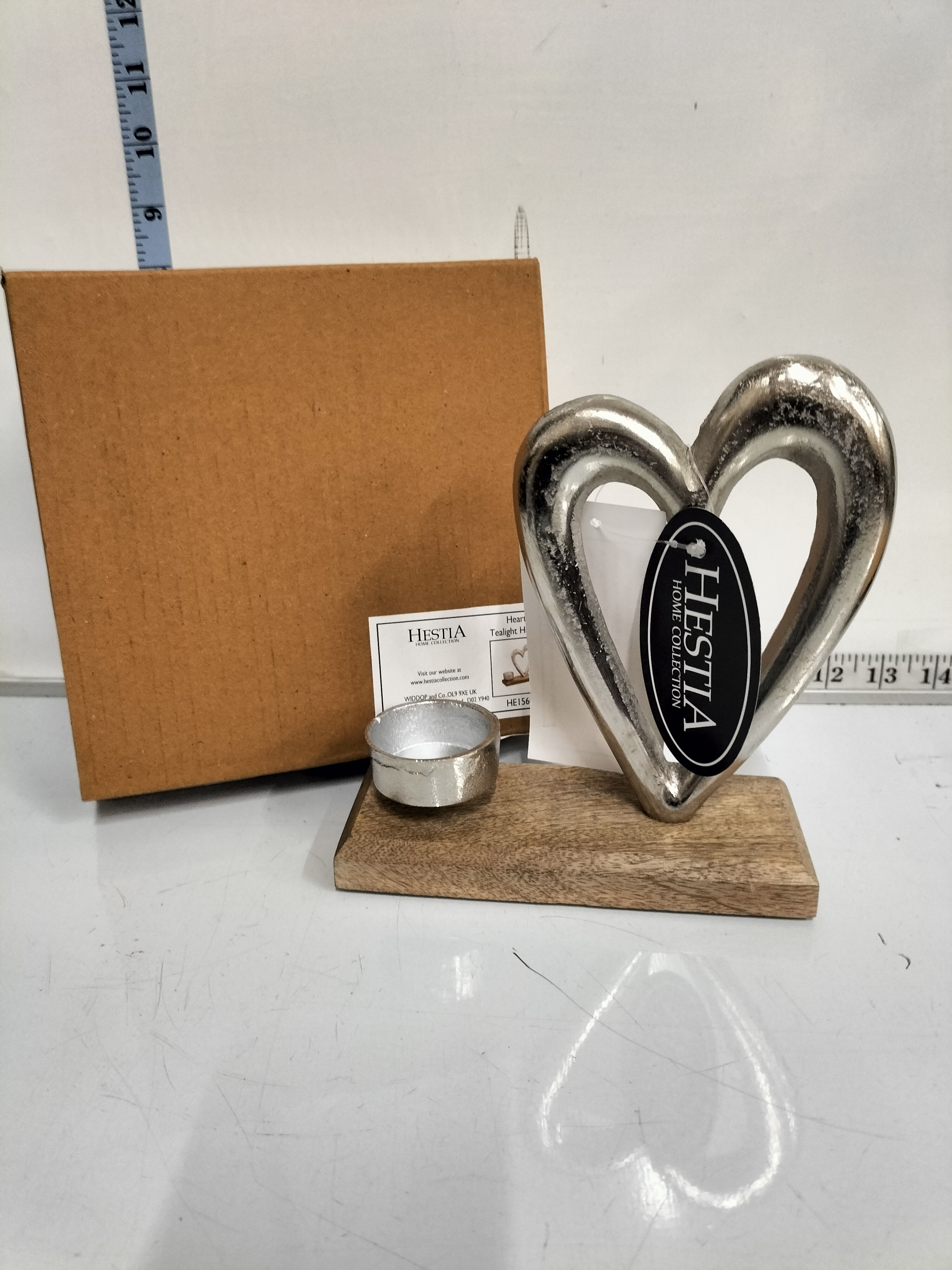 A silver coloured heart sculpture with a metal tealight holder mounted on a wooden base, measuring approximately 15cm in height, including original box and branding.