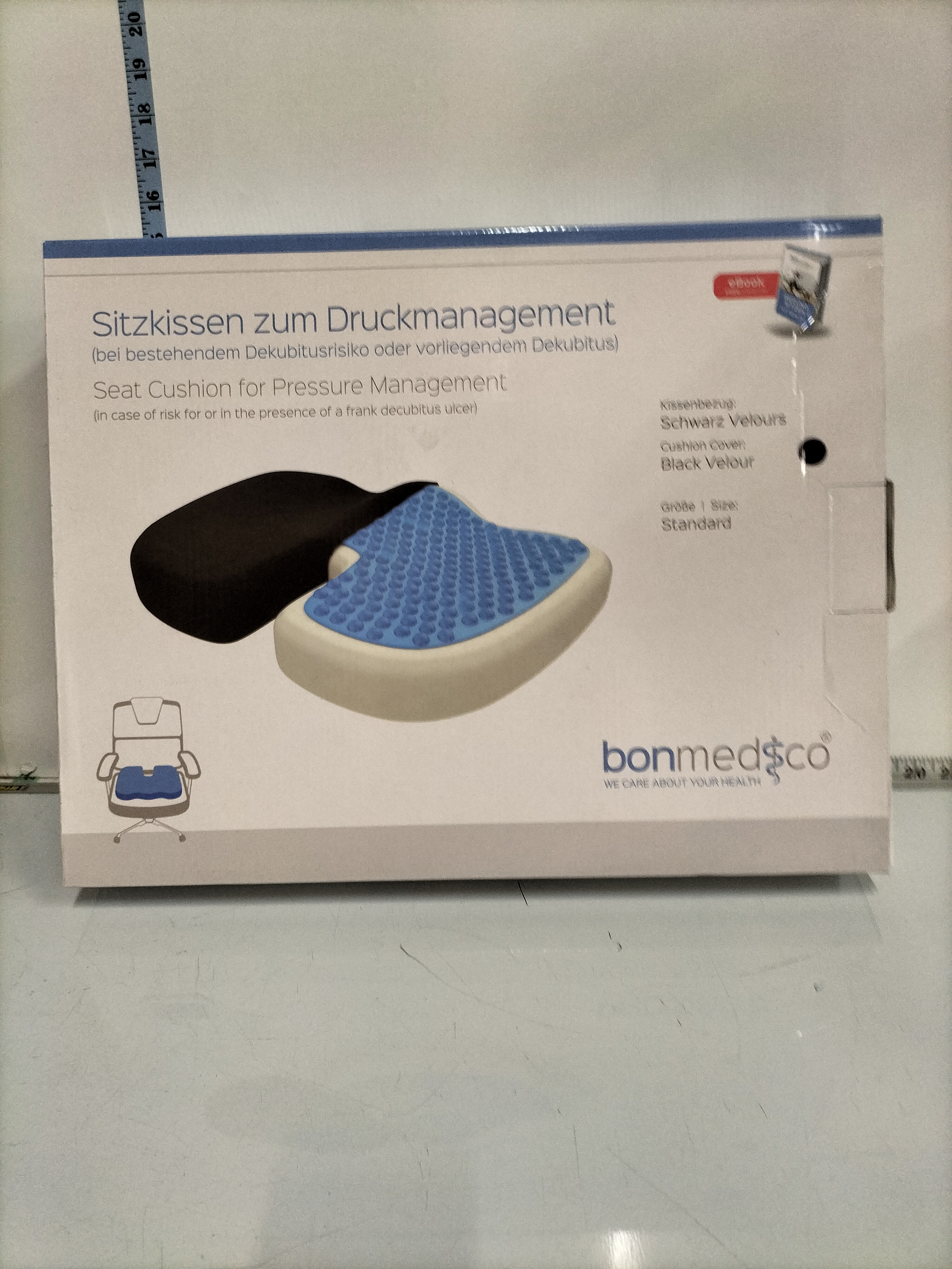 A packaged bonmedico brand seat cushion for pressure management featuring a standard-sized black velour cover, measuring approximately 45cm by 35cm.