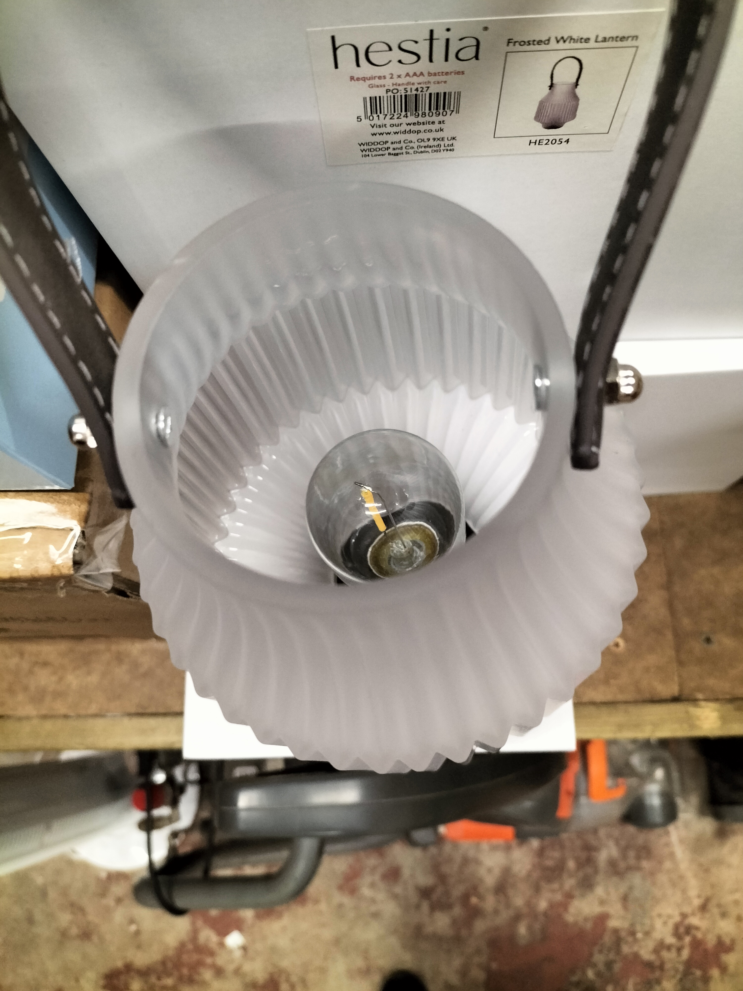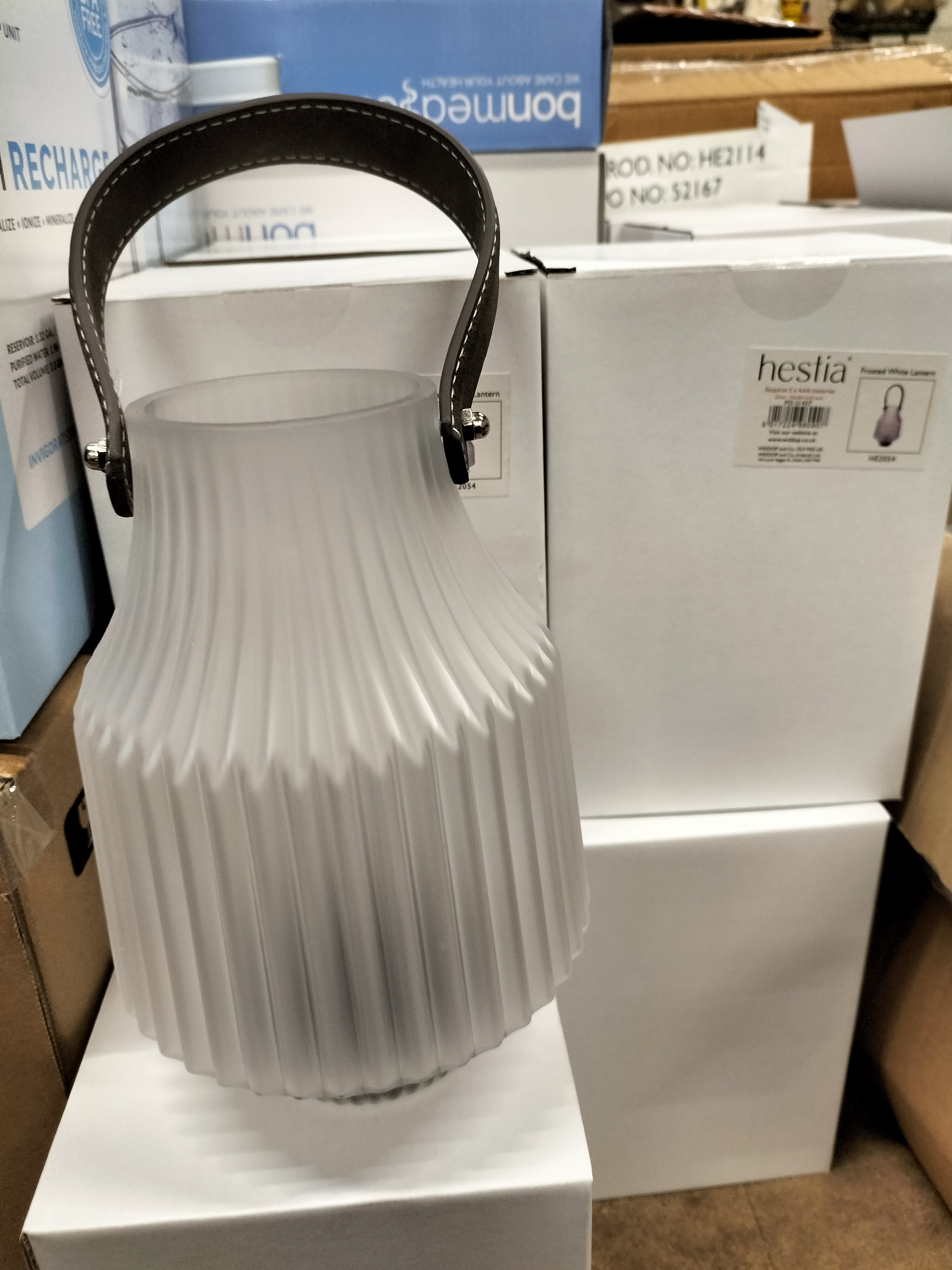 A Hestia brand frosted white ribbed glass lantern featuring a dark brown strap handle and requiring two AAA batteries.