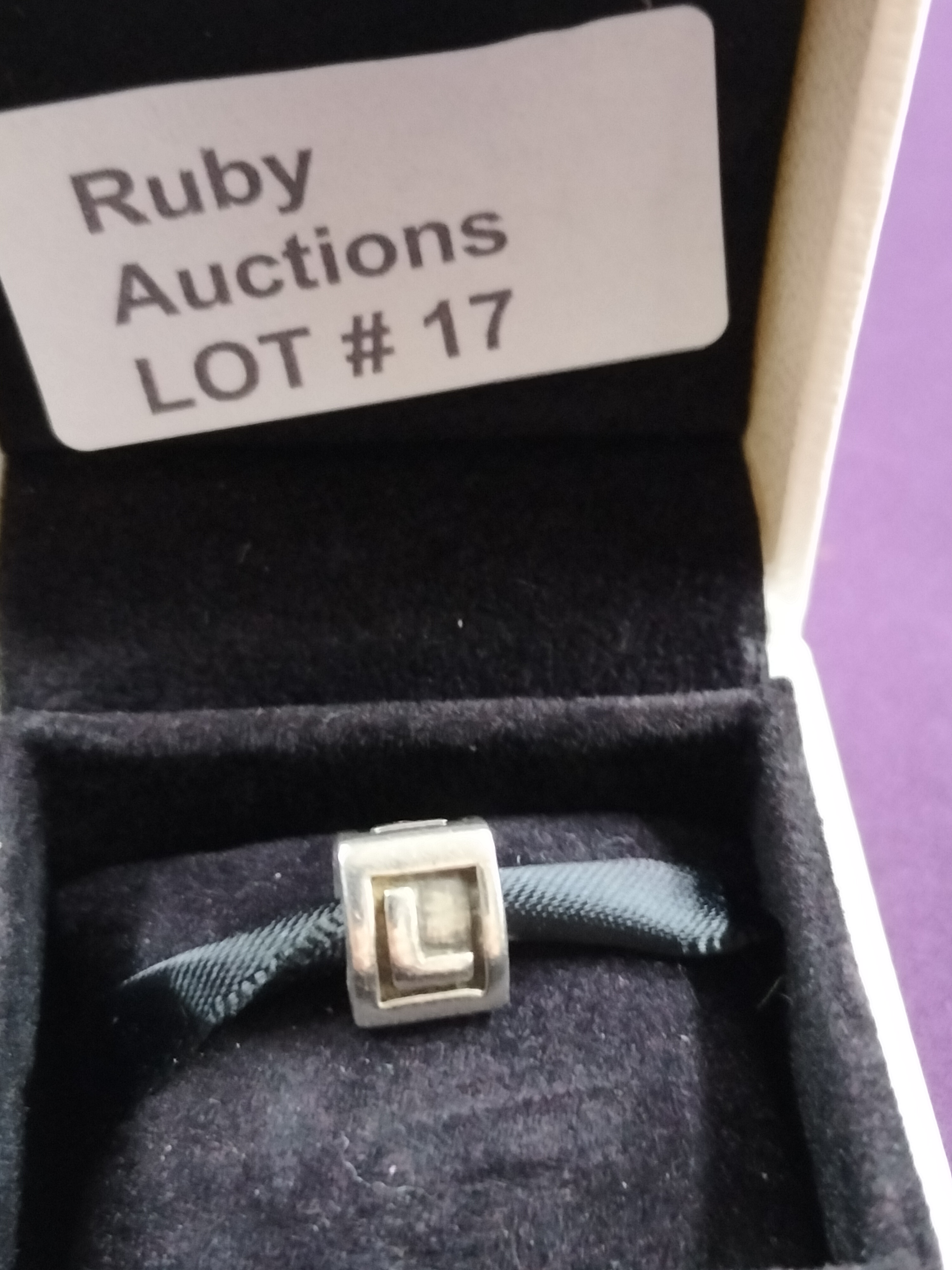A silver Pandora square slider bead featuring an embossed letter L on the face, In Pandora Box