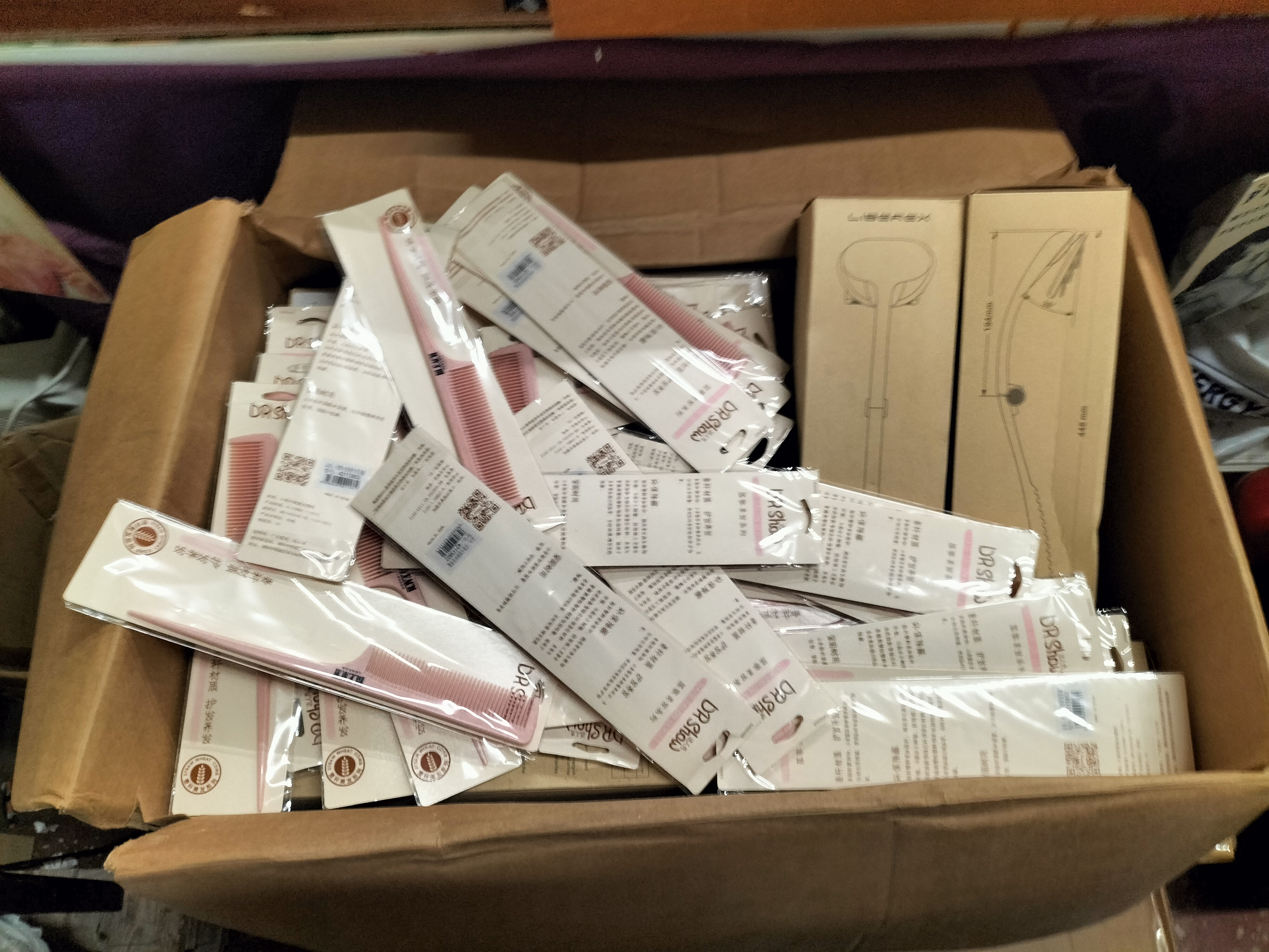 A collection of pink natural wheat hair combs by Dr. Show in original packaging together with two boxed Liberex items.