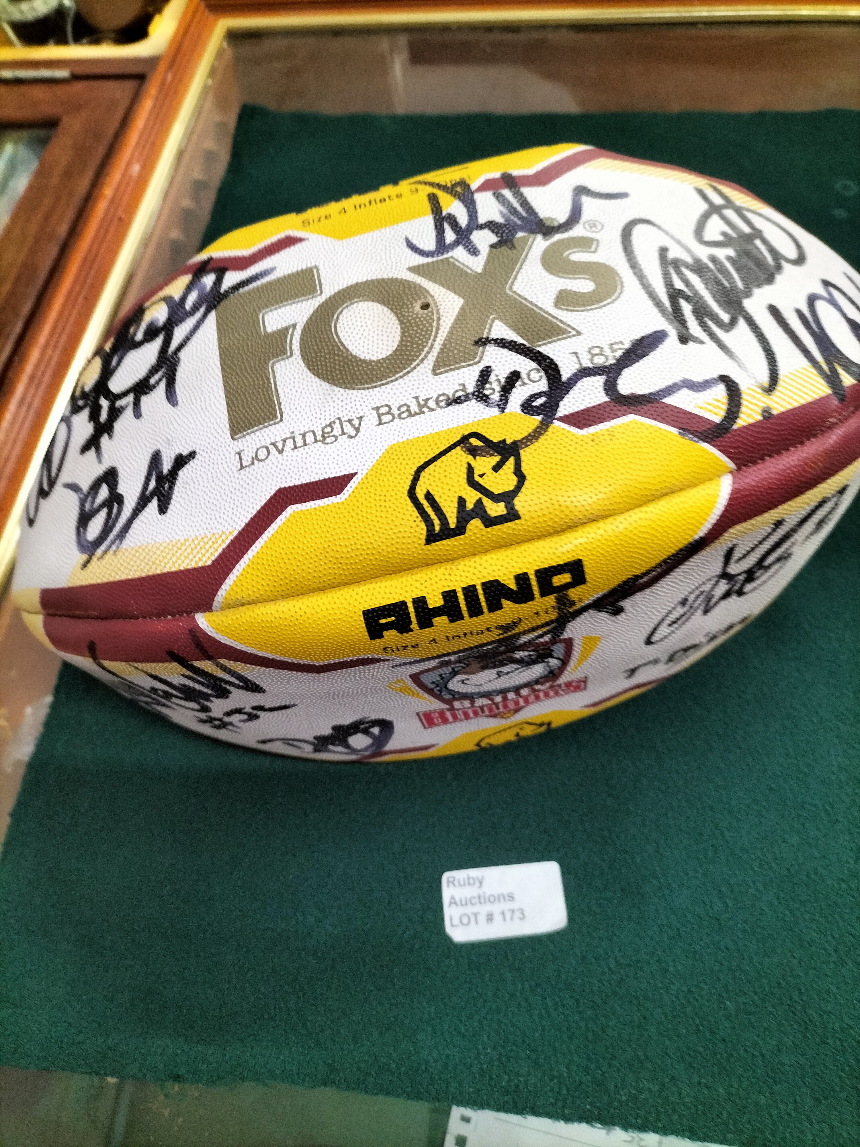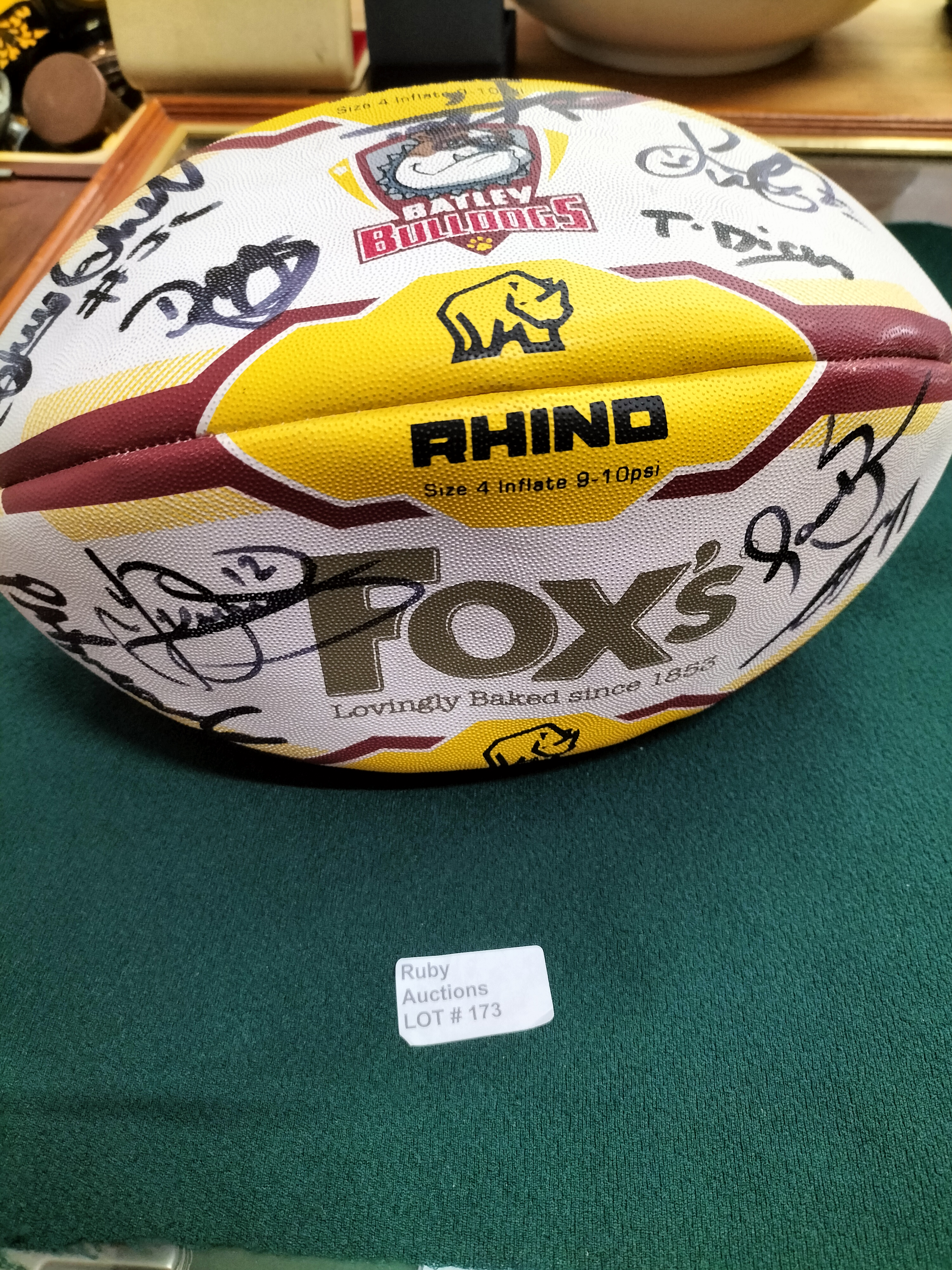 A white, yellow, and burgundy Rhino brand size 4 rugby ball featuring Batley Bulldogs and Fox’s logos, covered in multiple black marker signatures.