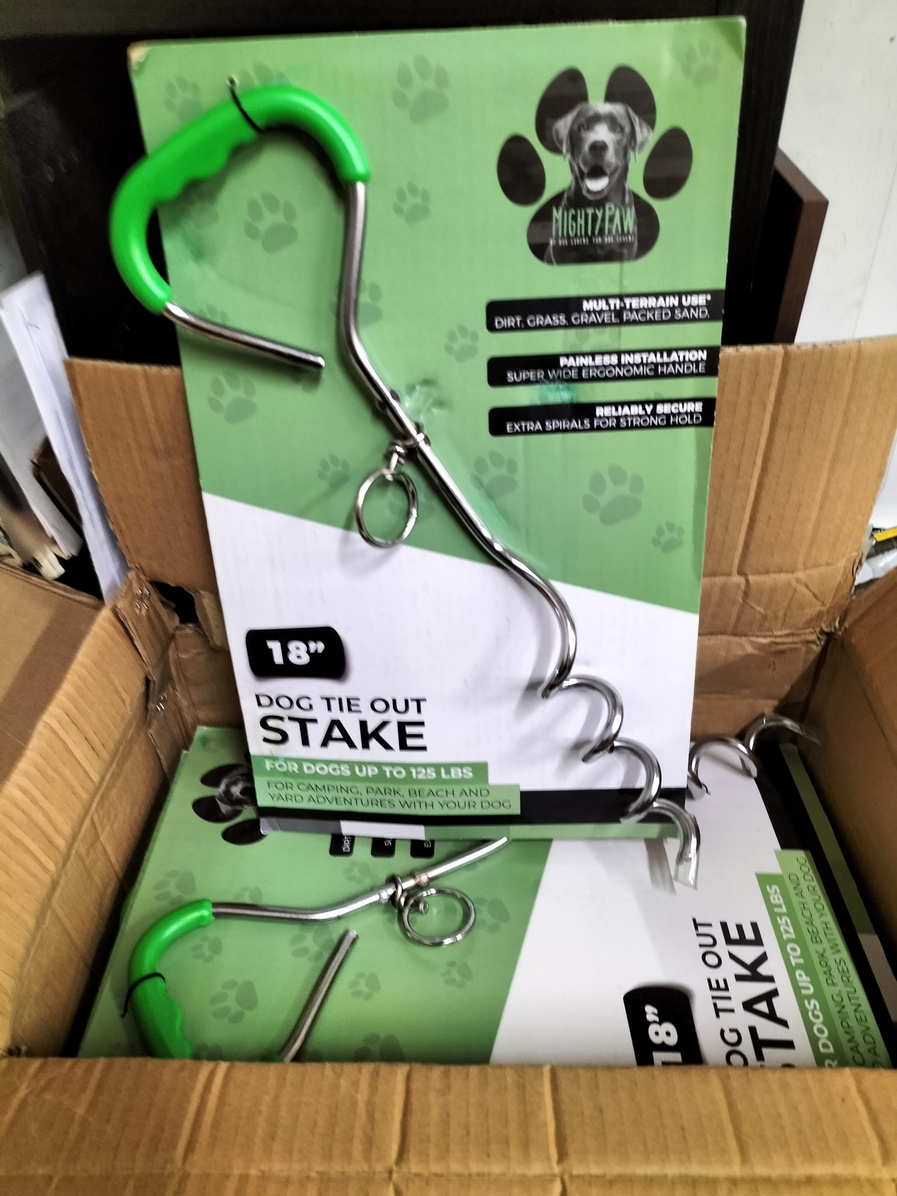 A collection of Mighty Paw 18 inch silver-tone metal dog tie out stakes featuring green ergonomic handles and extra spirals, each rated for dogs up to 125 lbs.