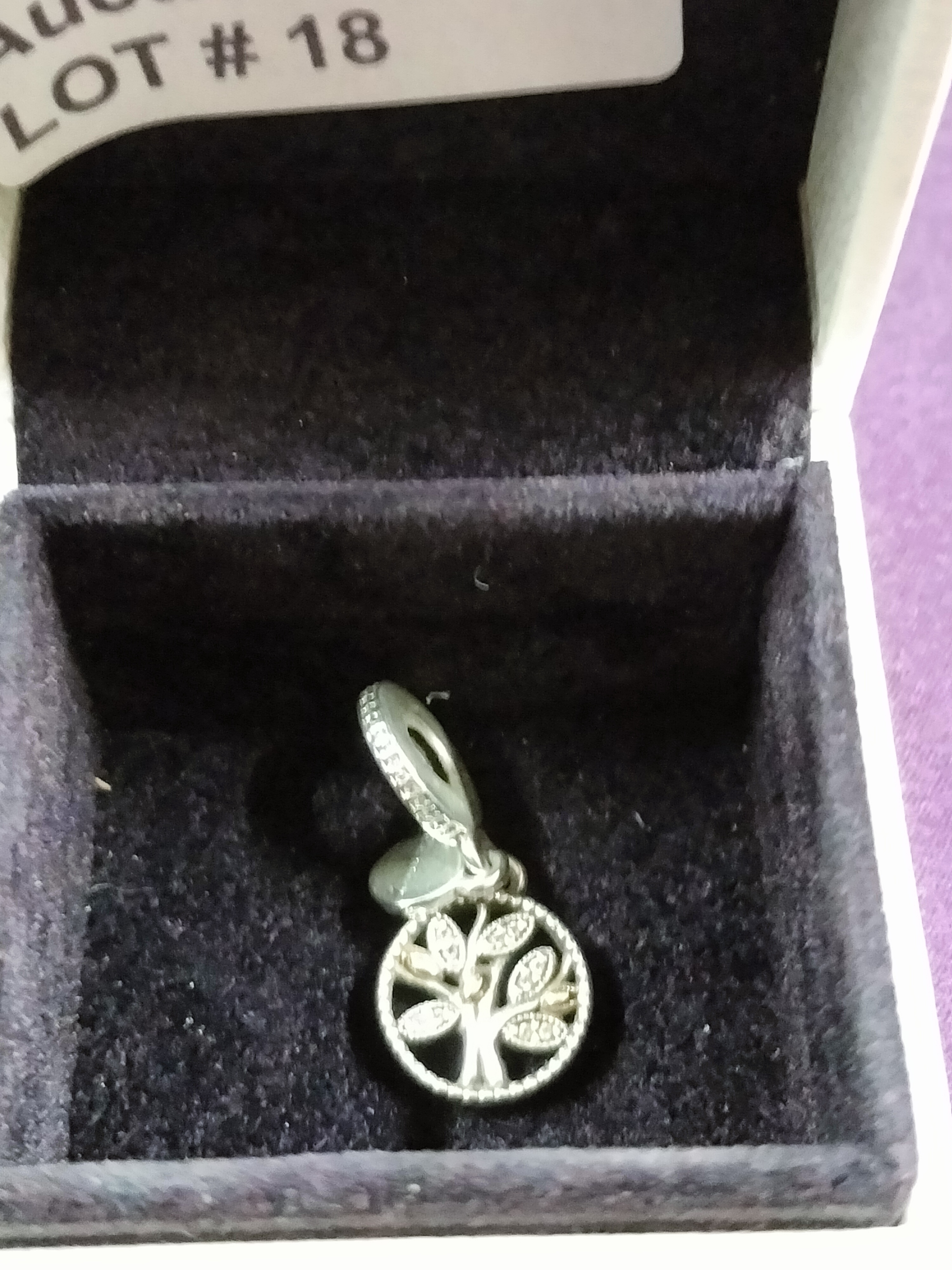 A silver Pandora spinning tree of life dangle charm accented with clear stones and a small heart pendant, presented in a Pandora box.