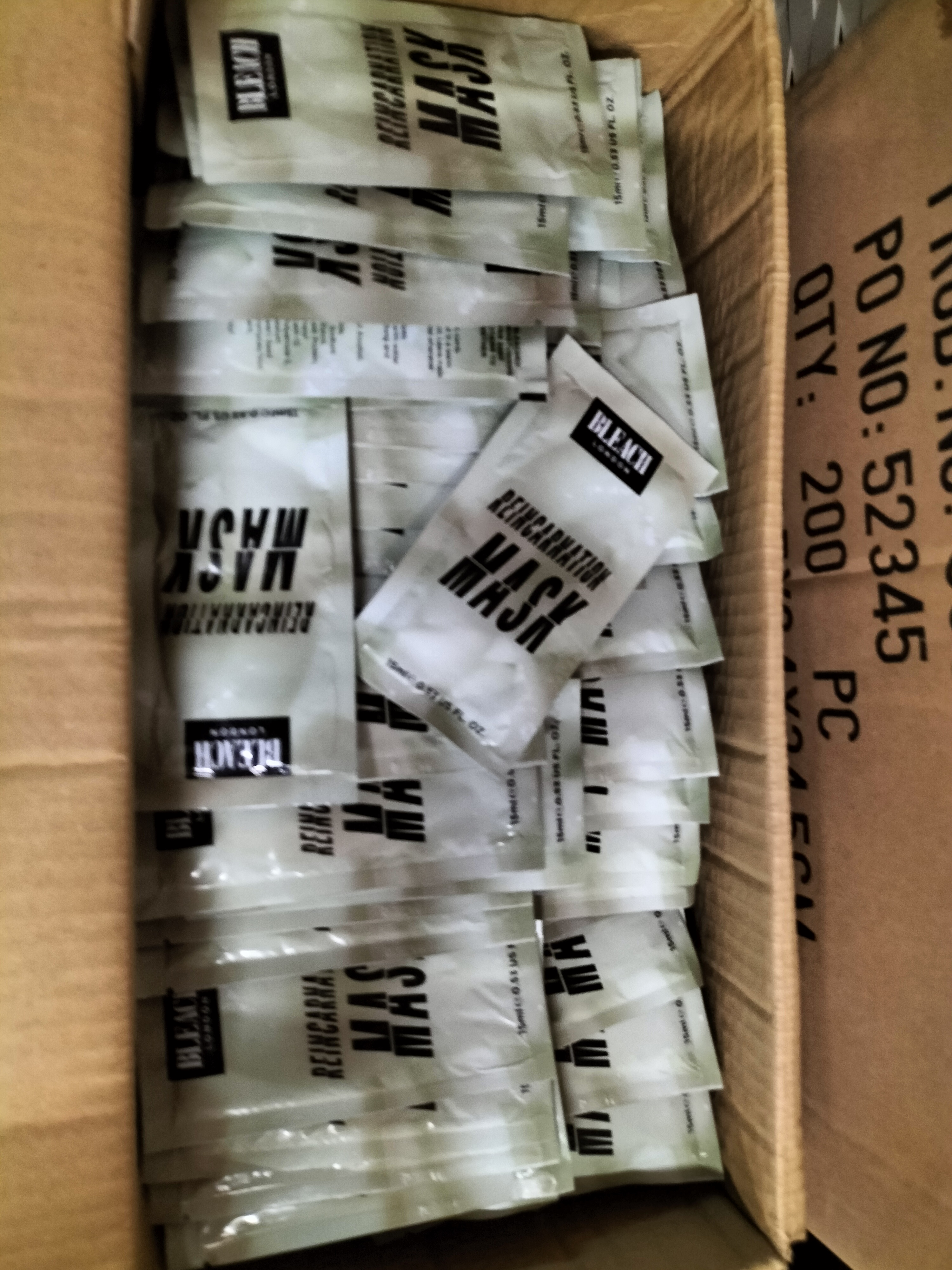 A collection of 200 Bleach London Reincarnation Mask hair treatment sachets, each containing 15ml of product, presented in a cardboard box.