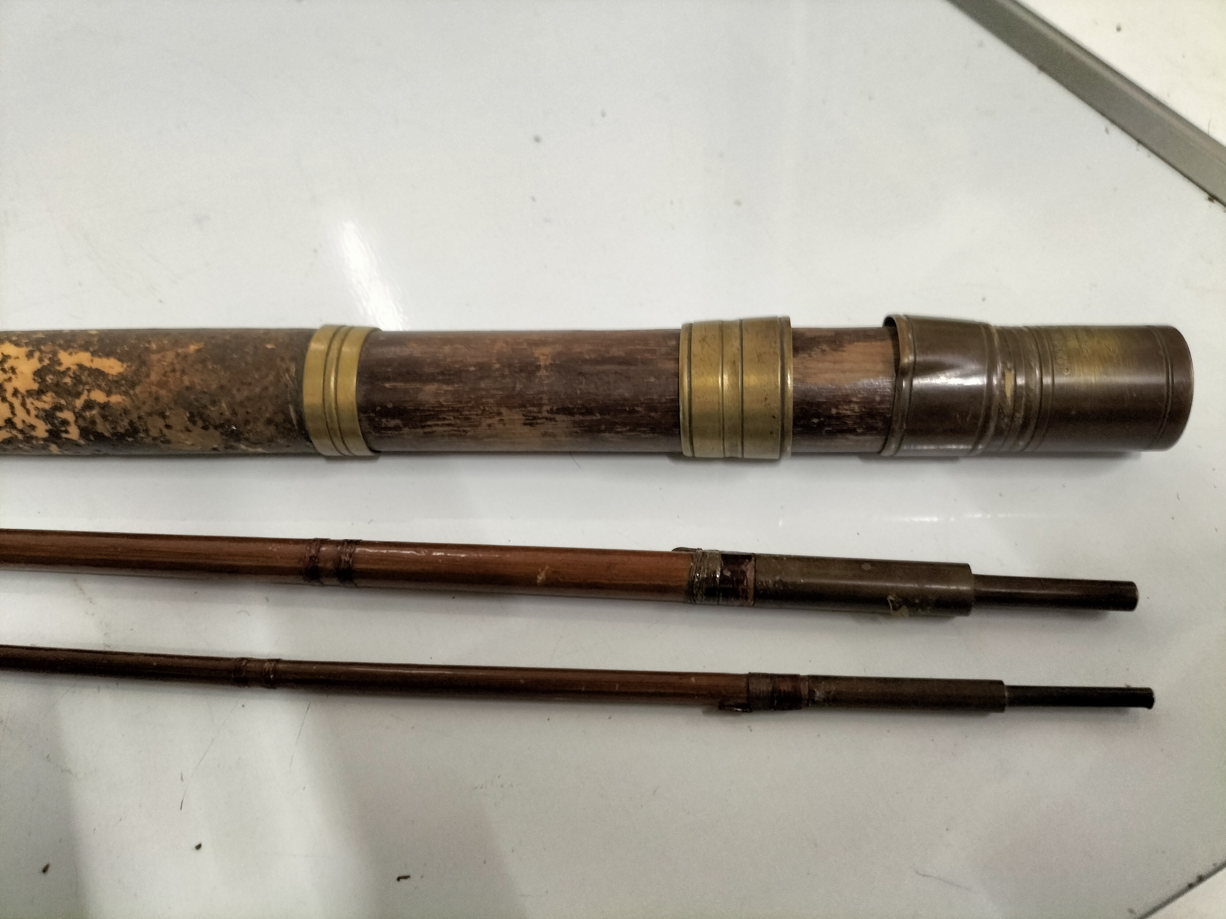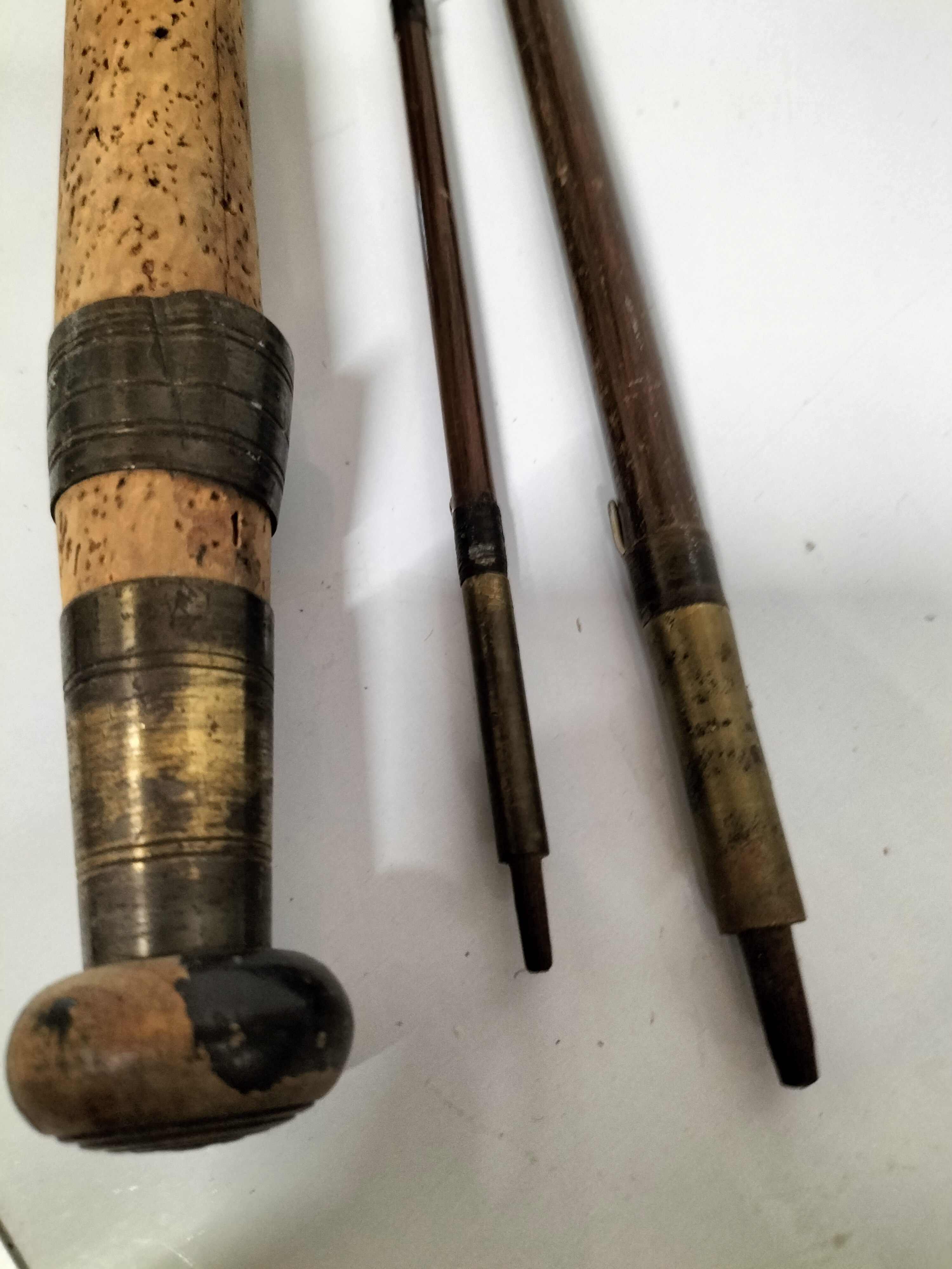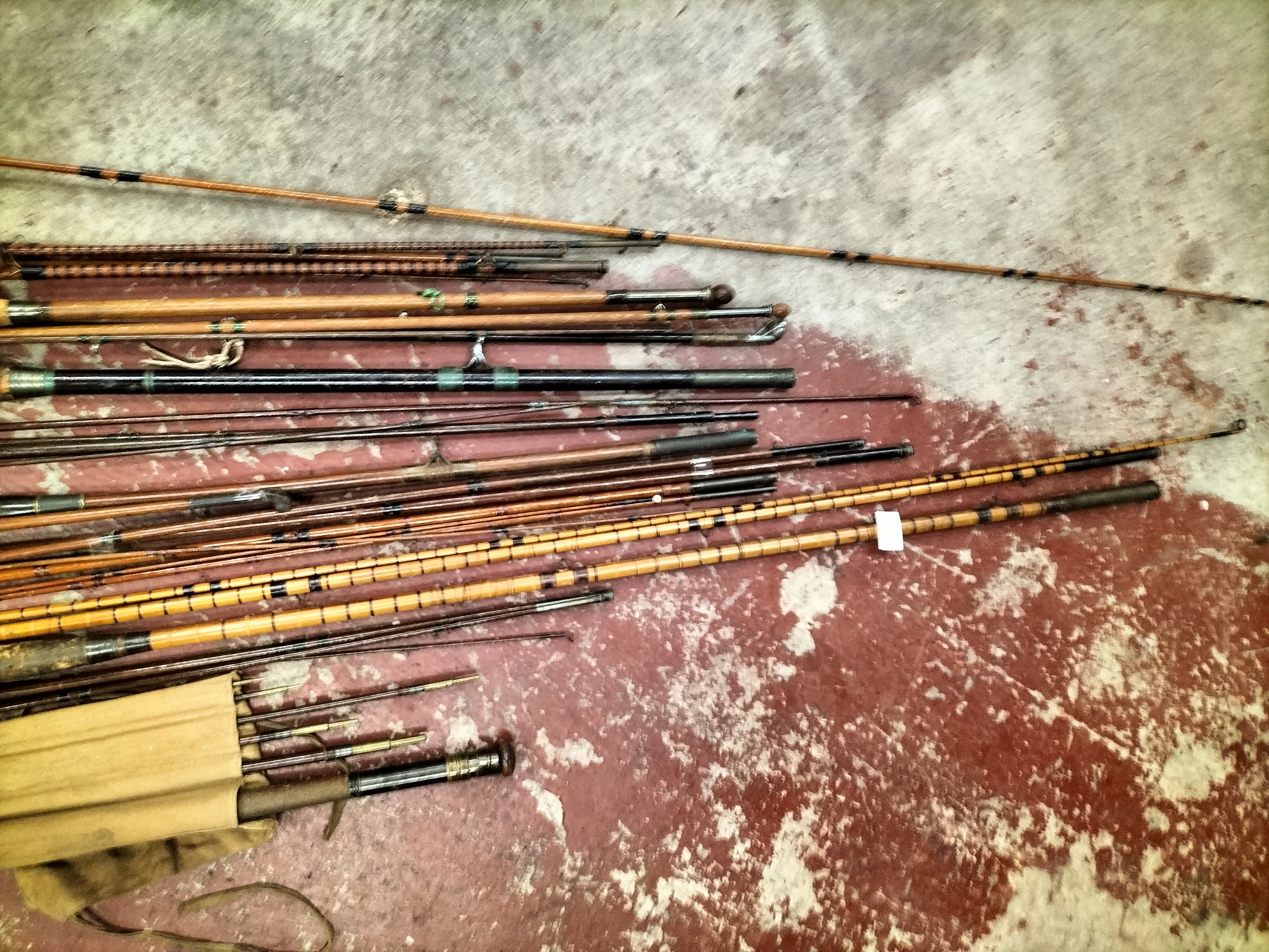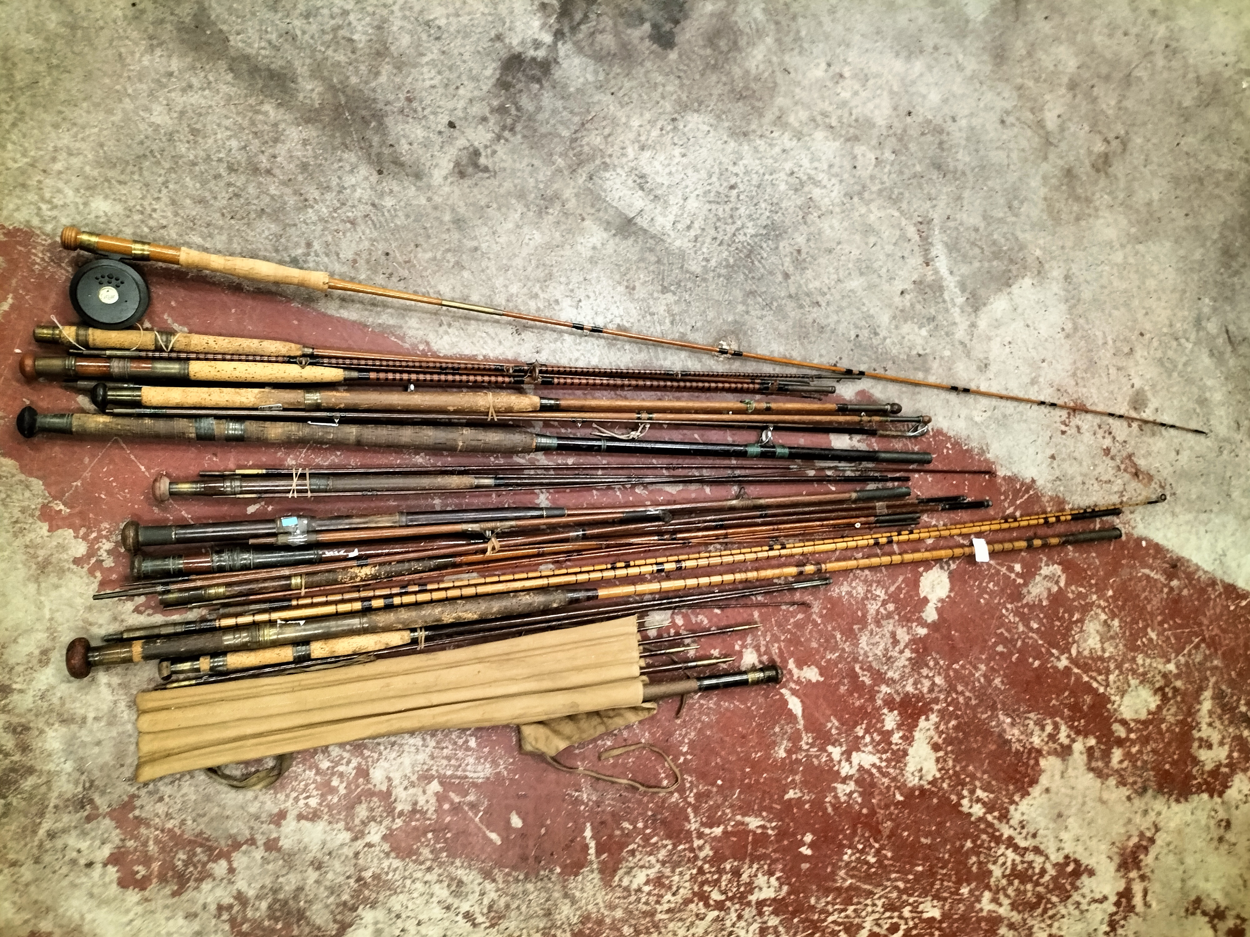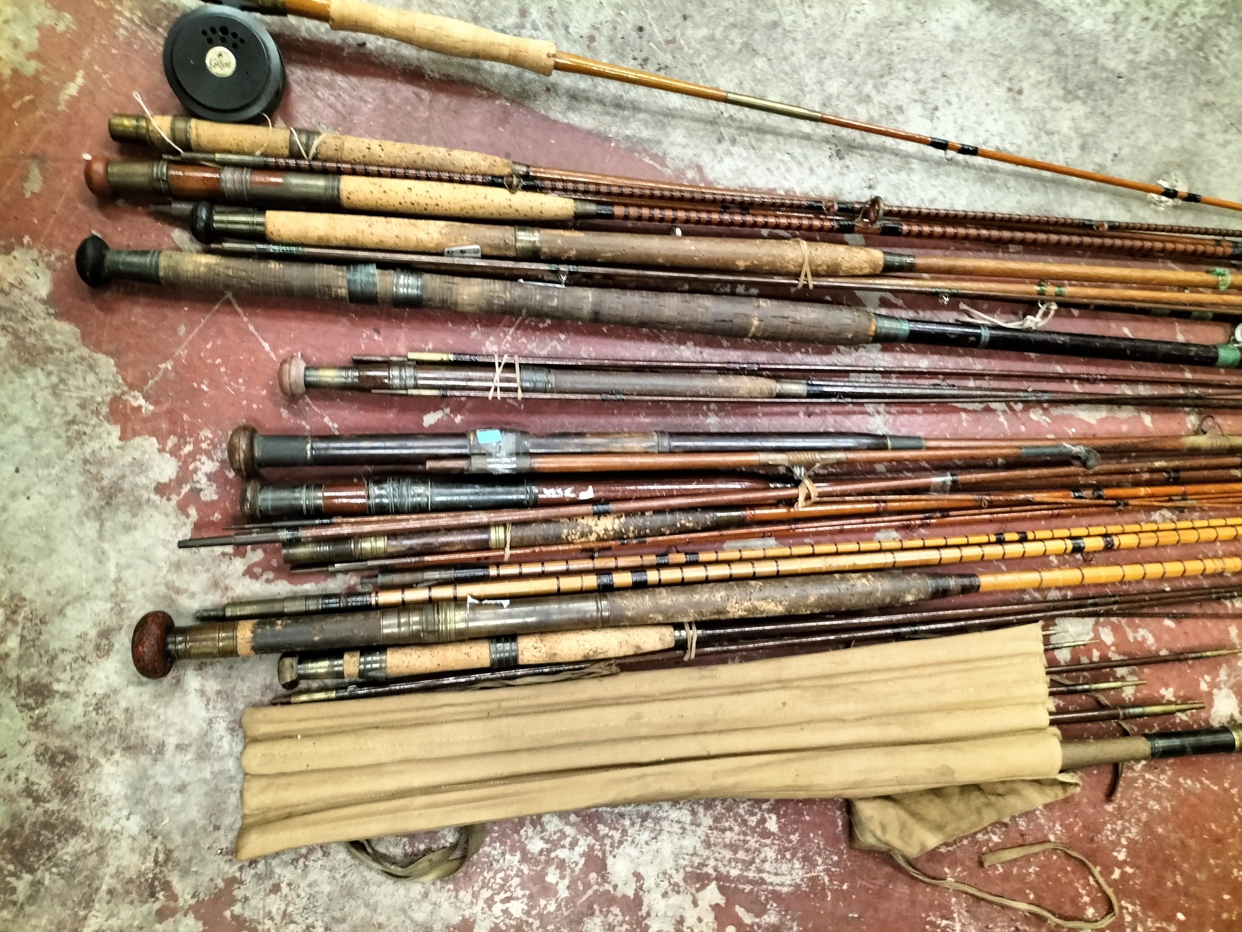 A collection of vintage and cane fishing rods featuring cork handles and brass fittings, including a reel and a canvas carry bag, with maker’s marks for Low & Co. Ltd and Frank Sugg Ltd.
