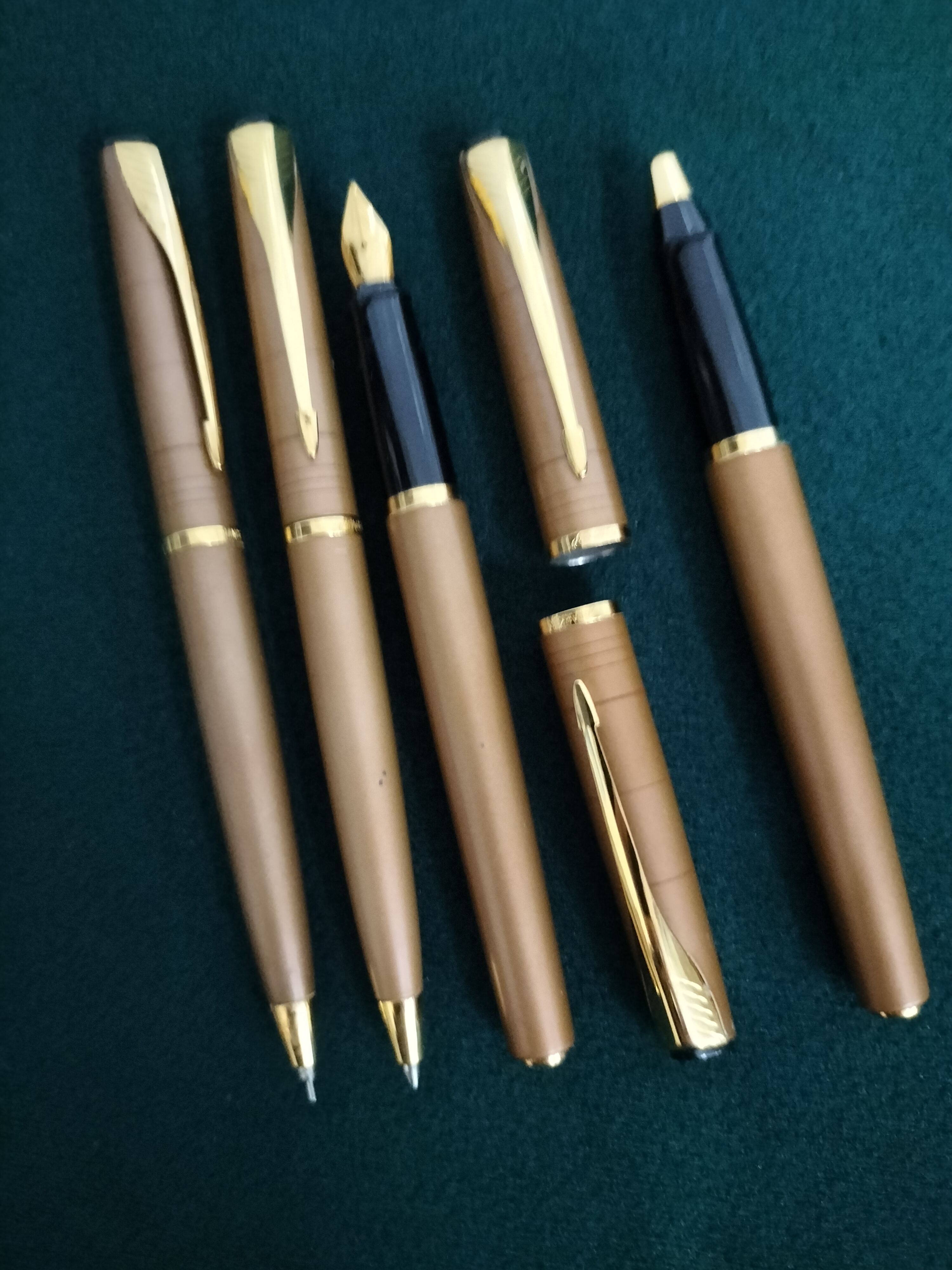 A collection of four tan-coloured writing instruments with gold-toned arrow clips and accents, attributed to the Parker Inflection range.