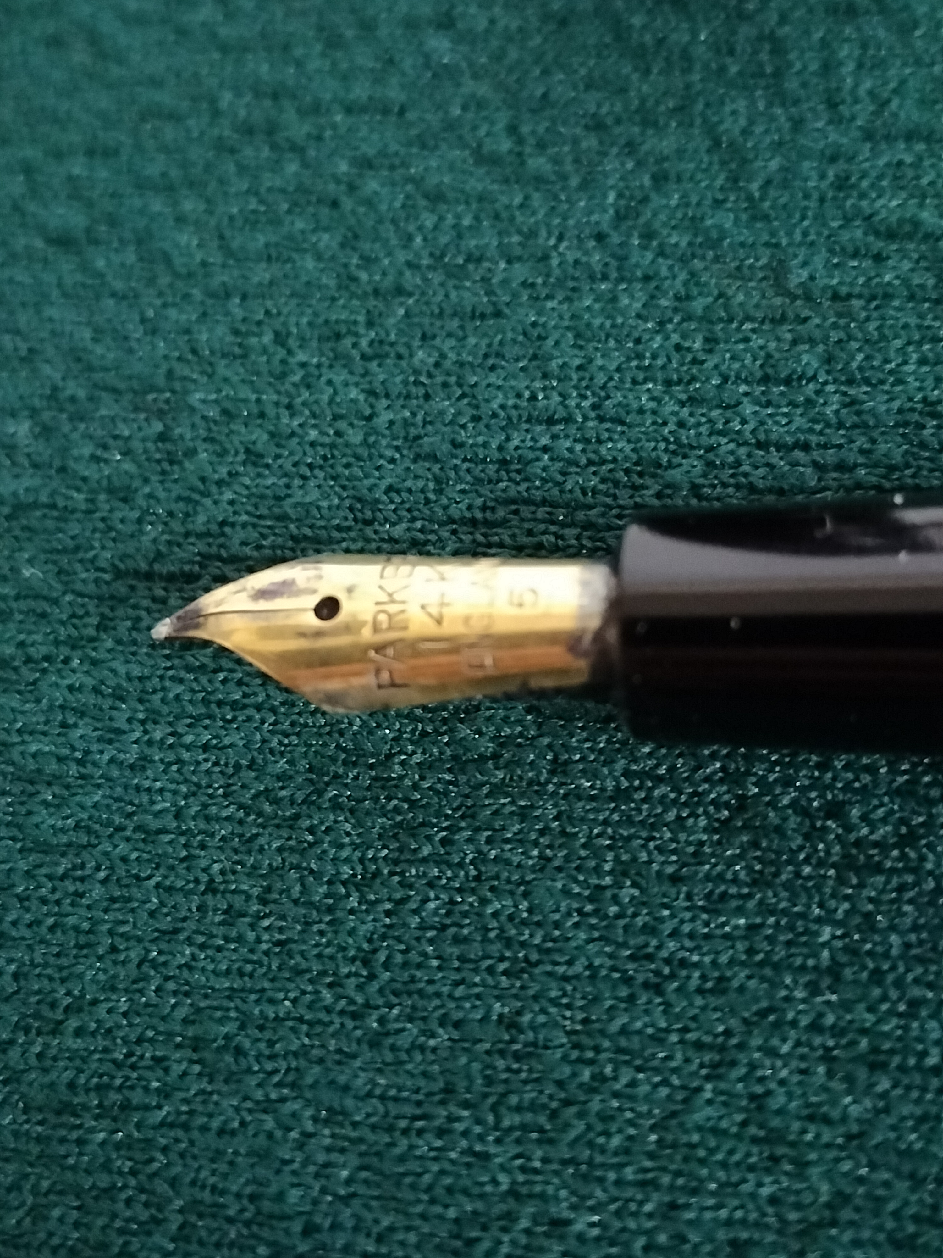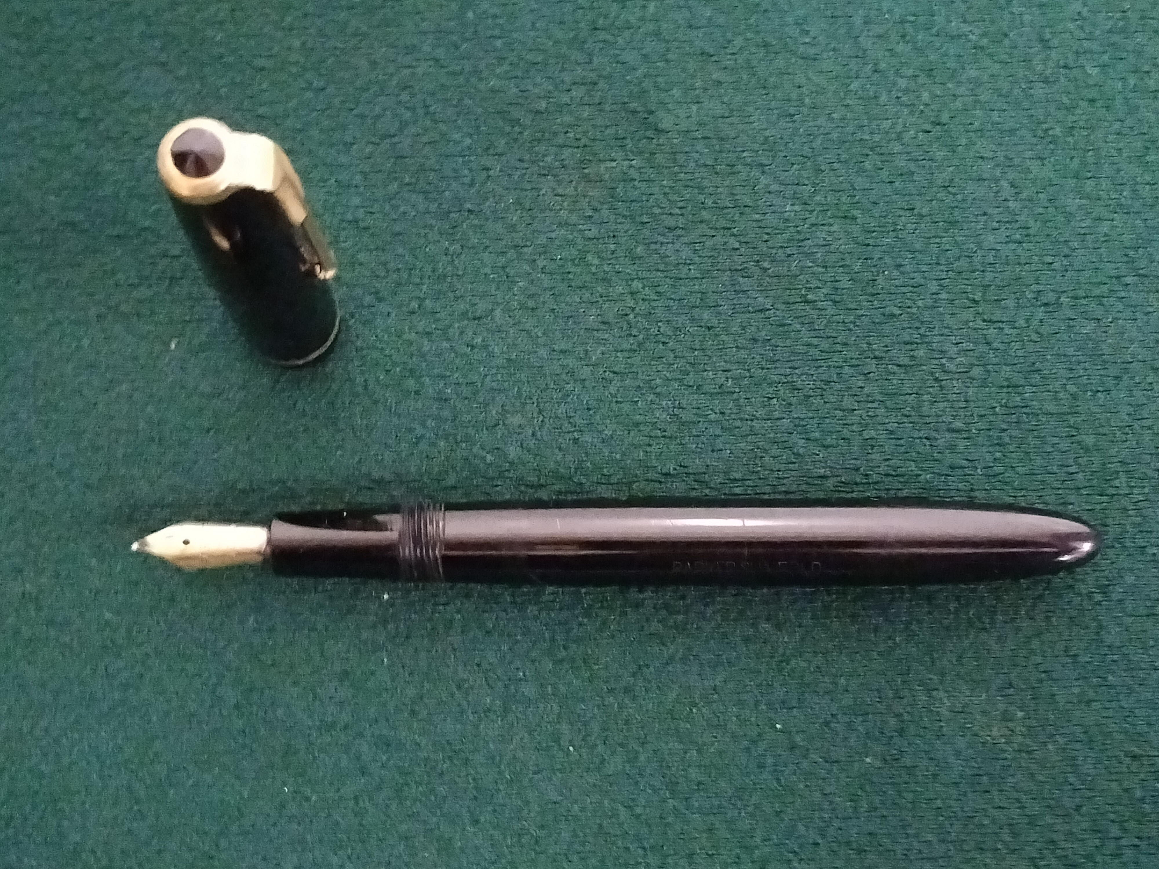 A black Parker Duofold fountain pen featuring gold tone trim and a 14 carat gold nib marked Parker England 5.