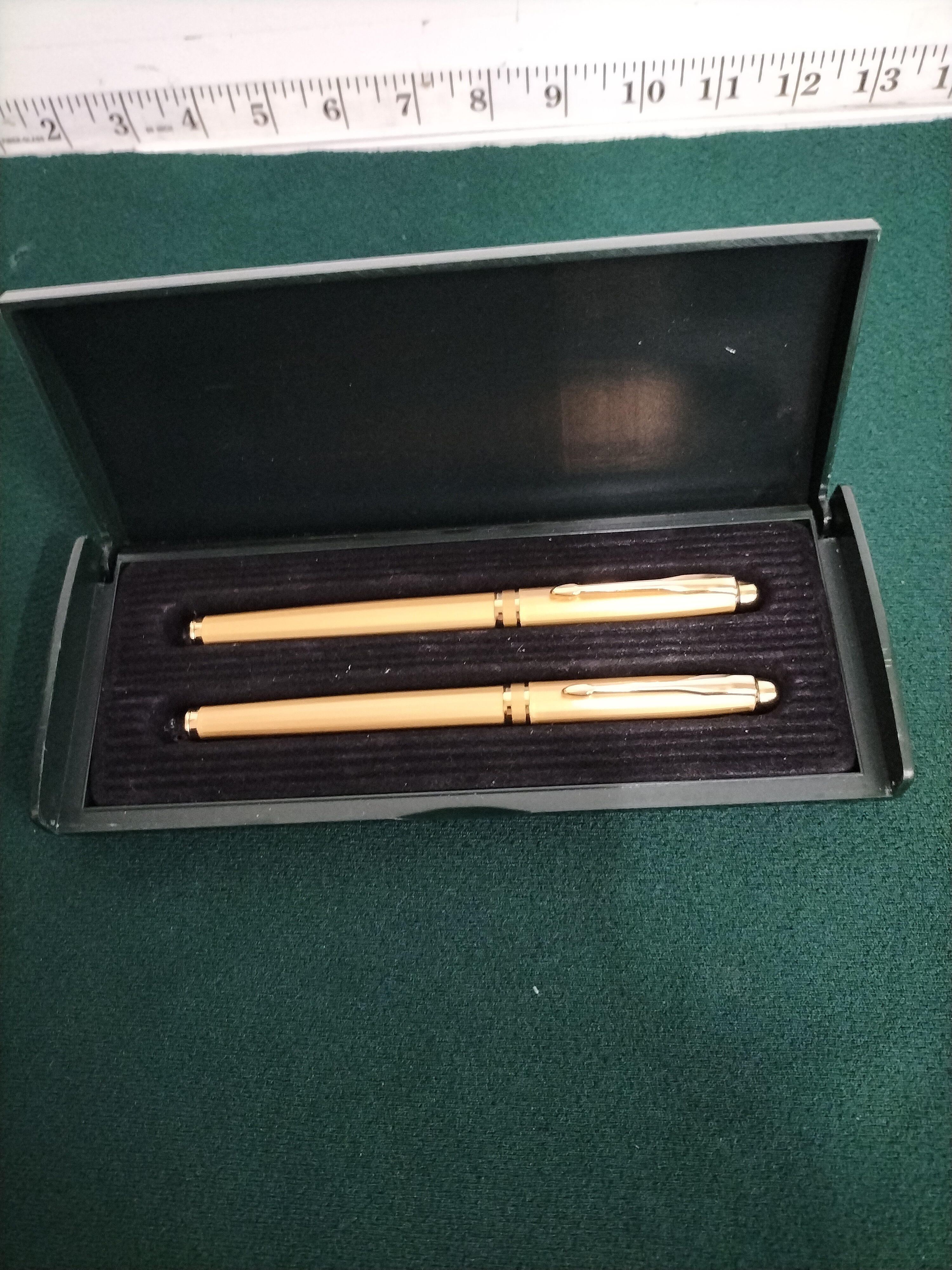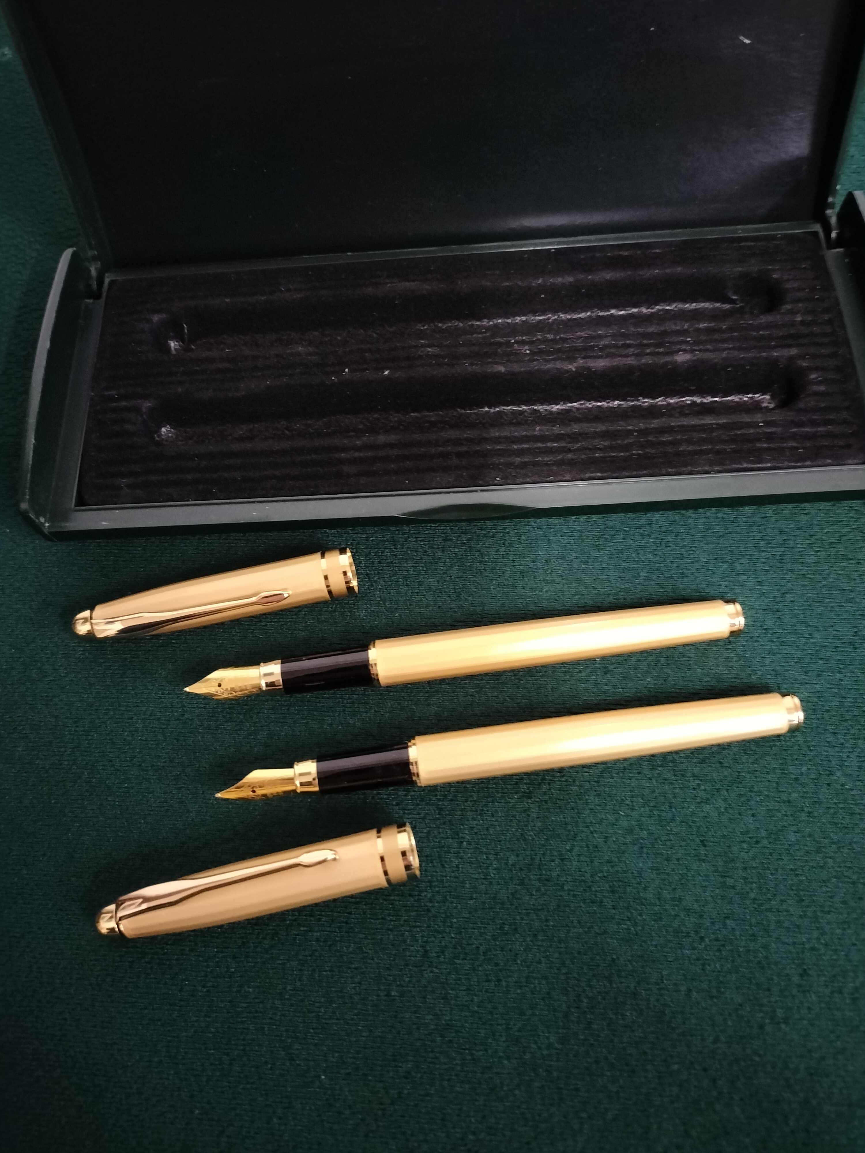A pair of gold-toned fountain pens featuring arrow-design clips and black grips, presented in a black case, with each pen measuring approximately 13.5cm in length.