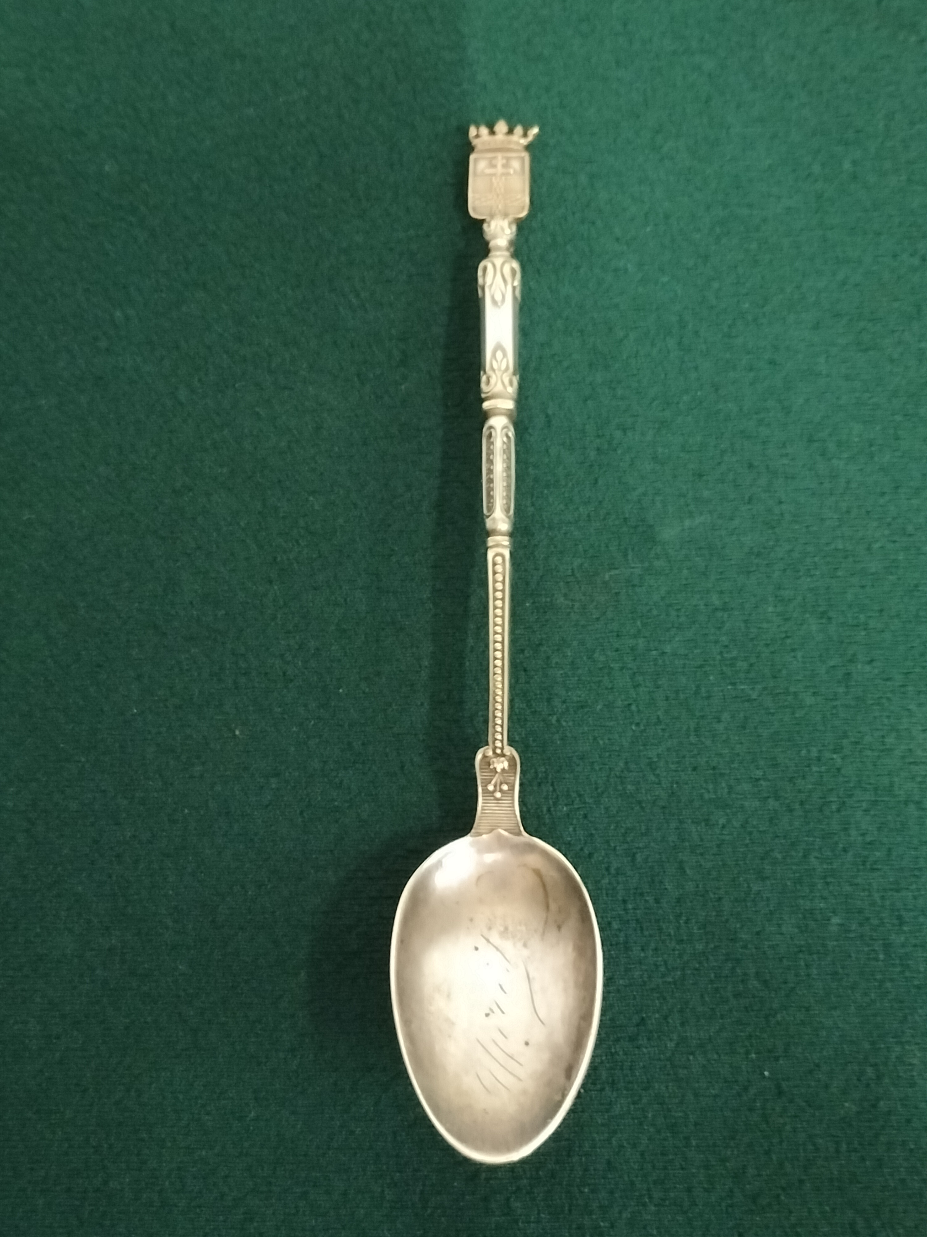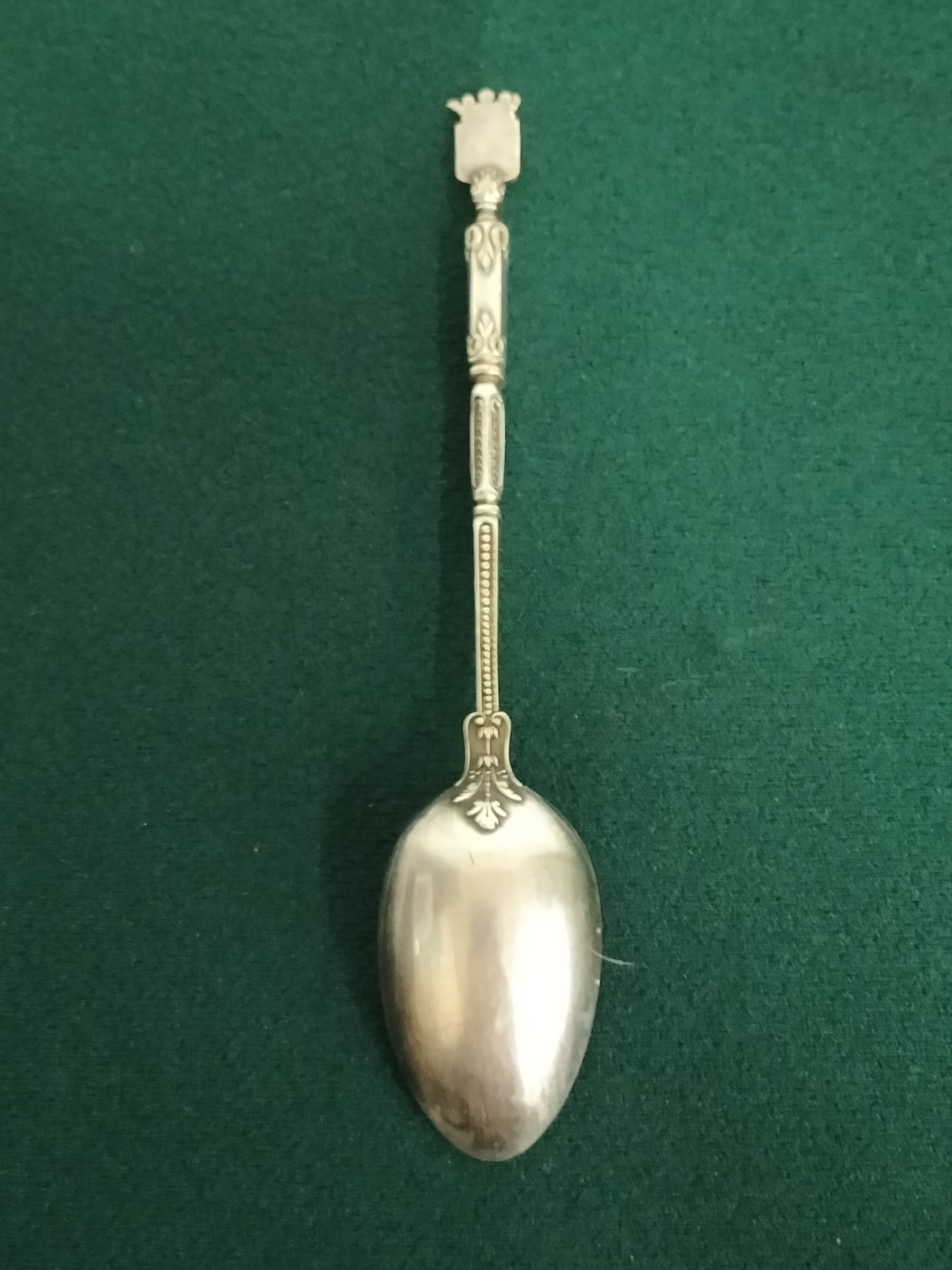 A silver decorative spoon featuring an ornate handle topped with a crowned shield crest and foliate motifs.stamped