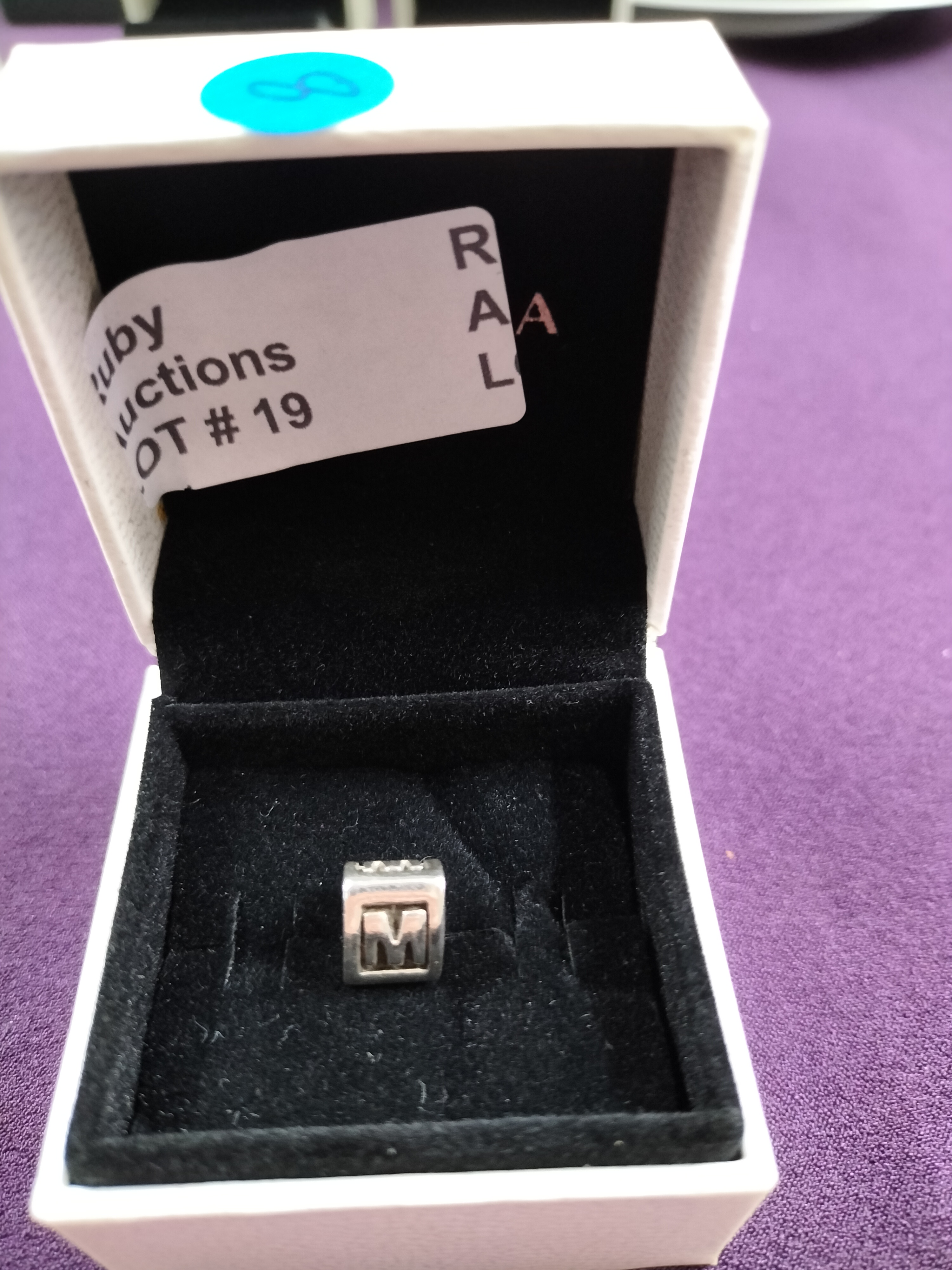 A silver Pandora charm bead featuring a raised letter M on its face, presented in a white Pandora box.