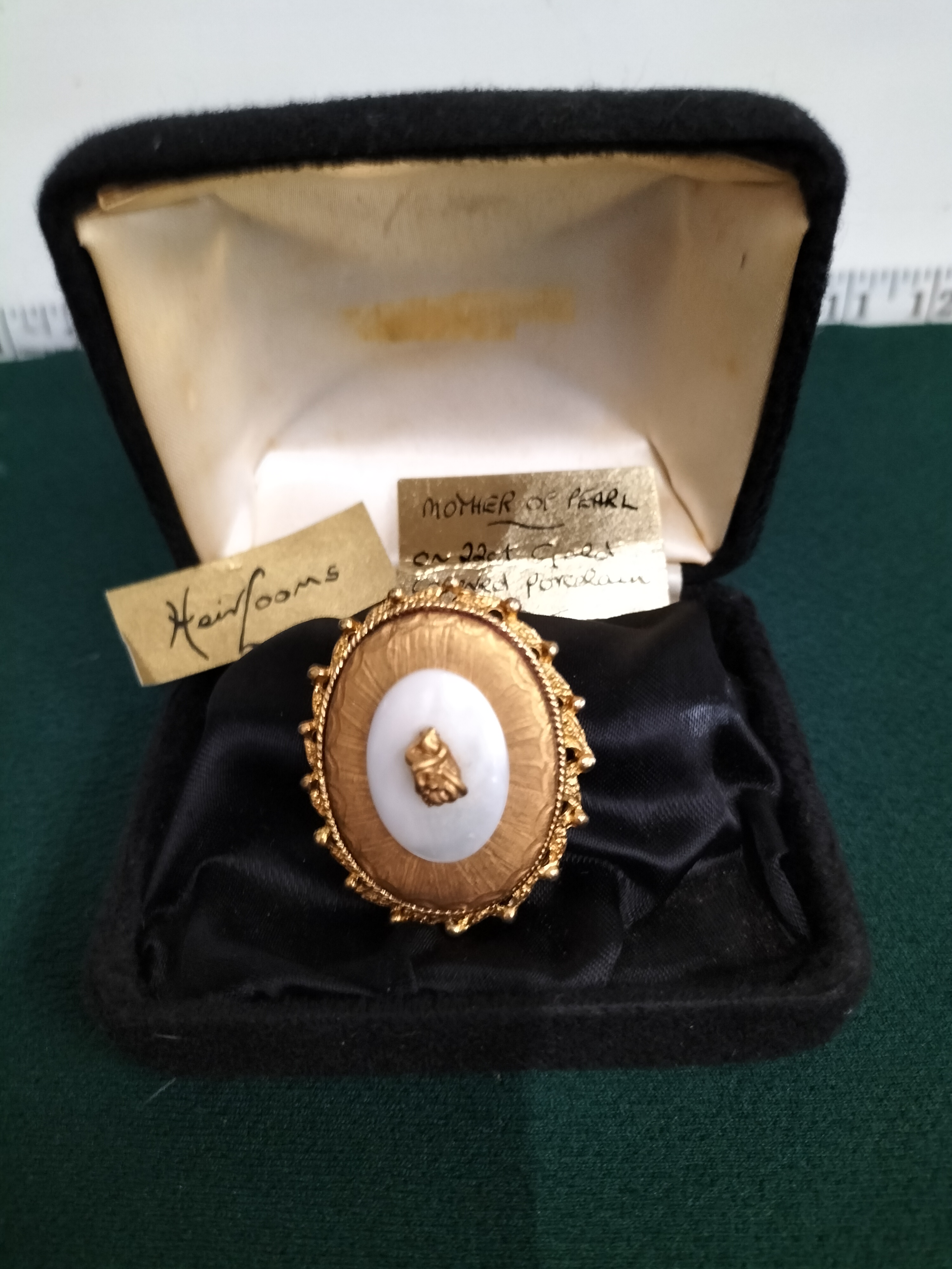 An oval brooch featuring mother of pearl set on 22ct gold plated fired porcelain within a gold-toned textured frame, presented in a fitted box.