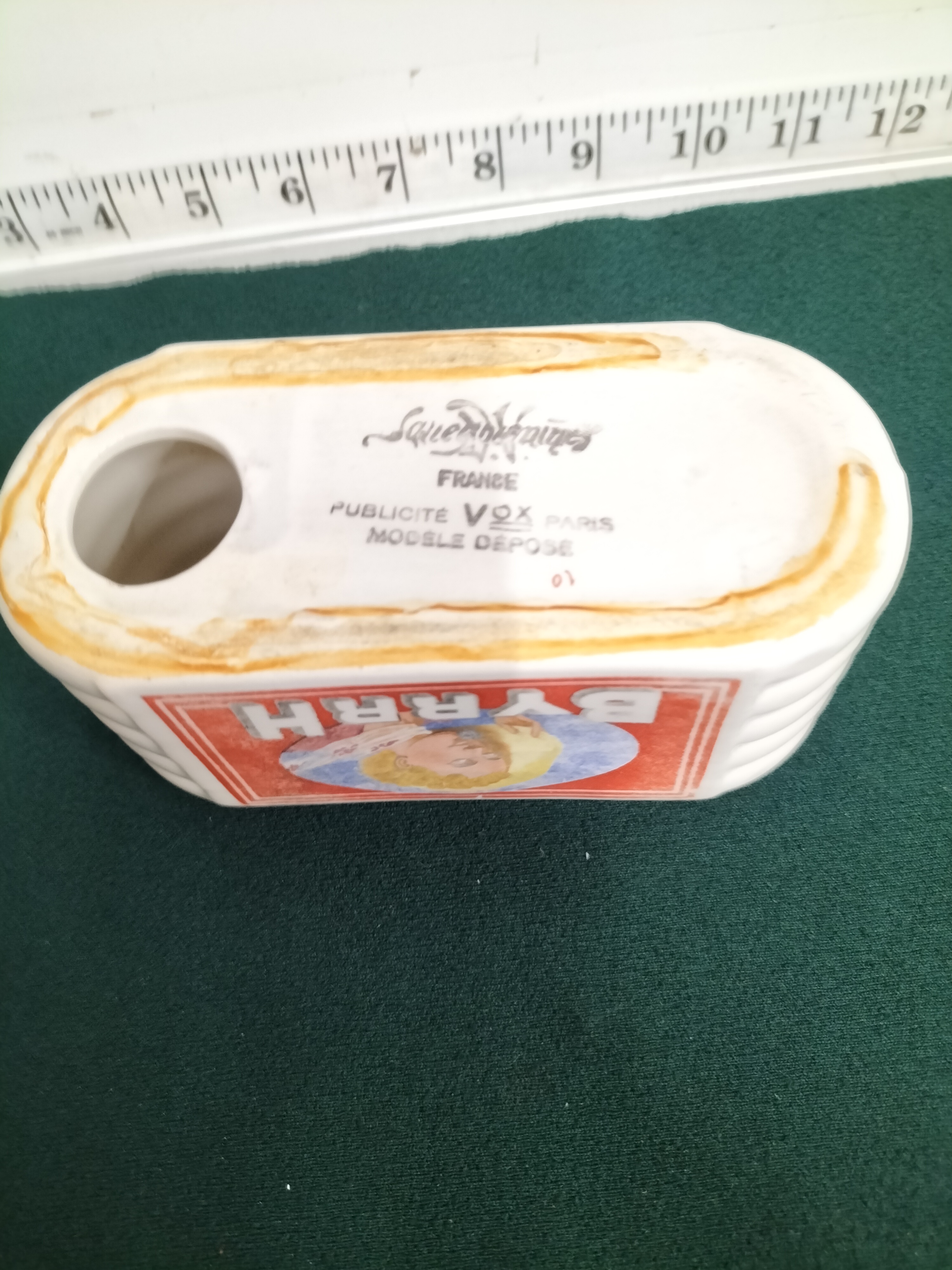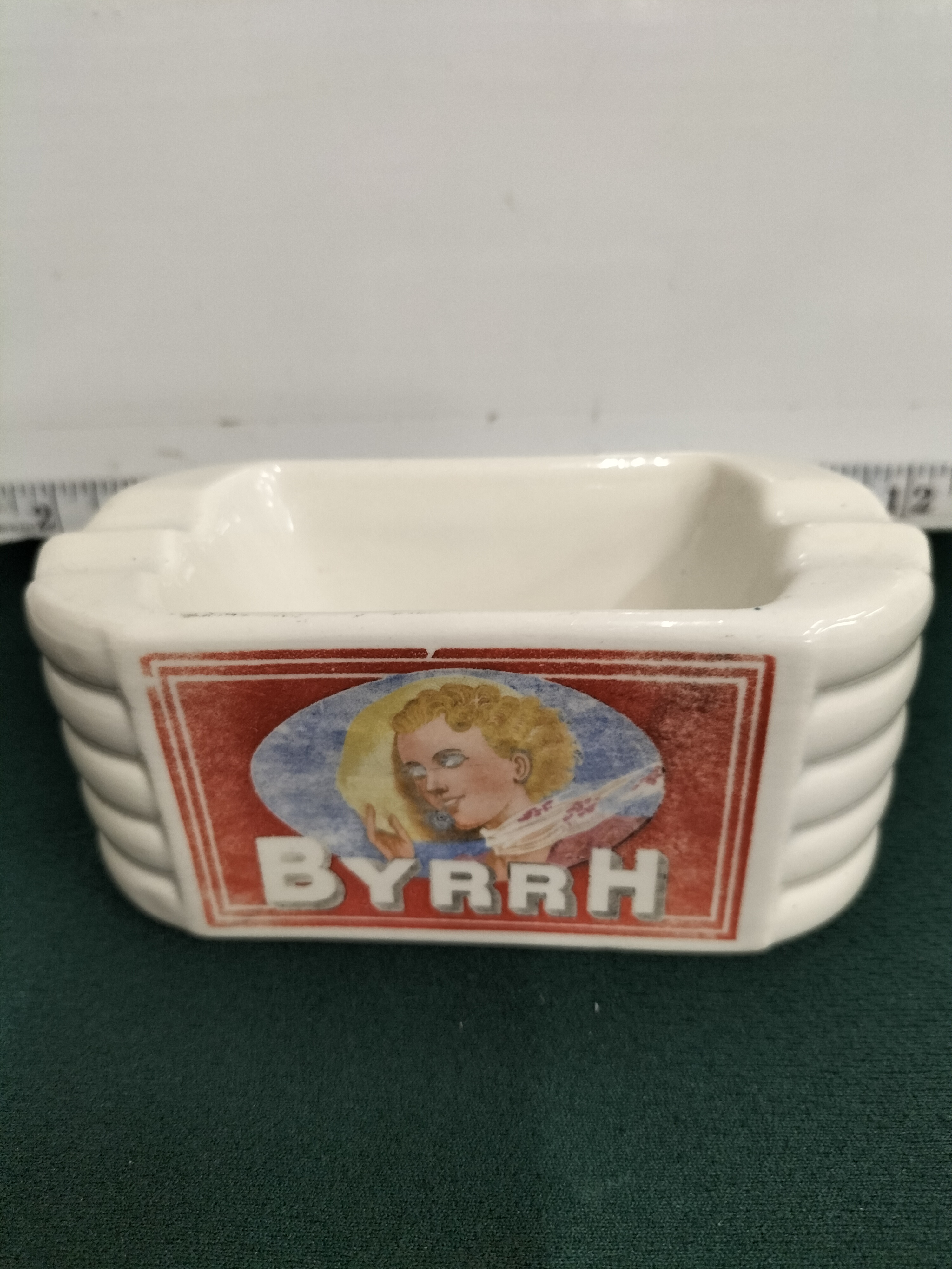A white ceramic advertising ashtray for Byrrh featuring a colourful graphic and ribbed sides, measuring approximately 12 cm in length.