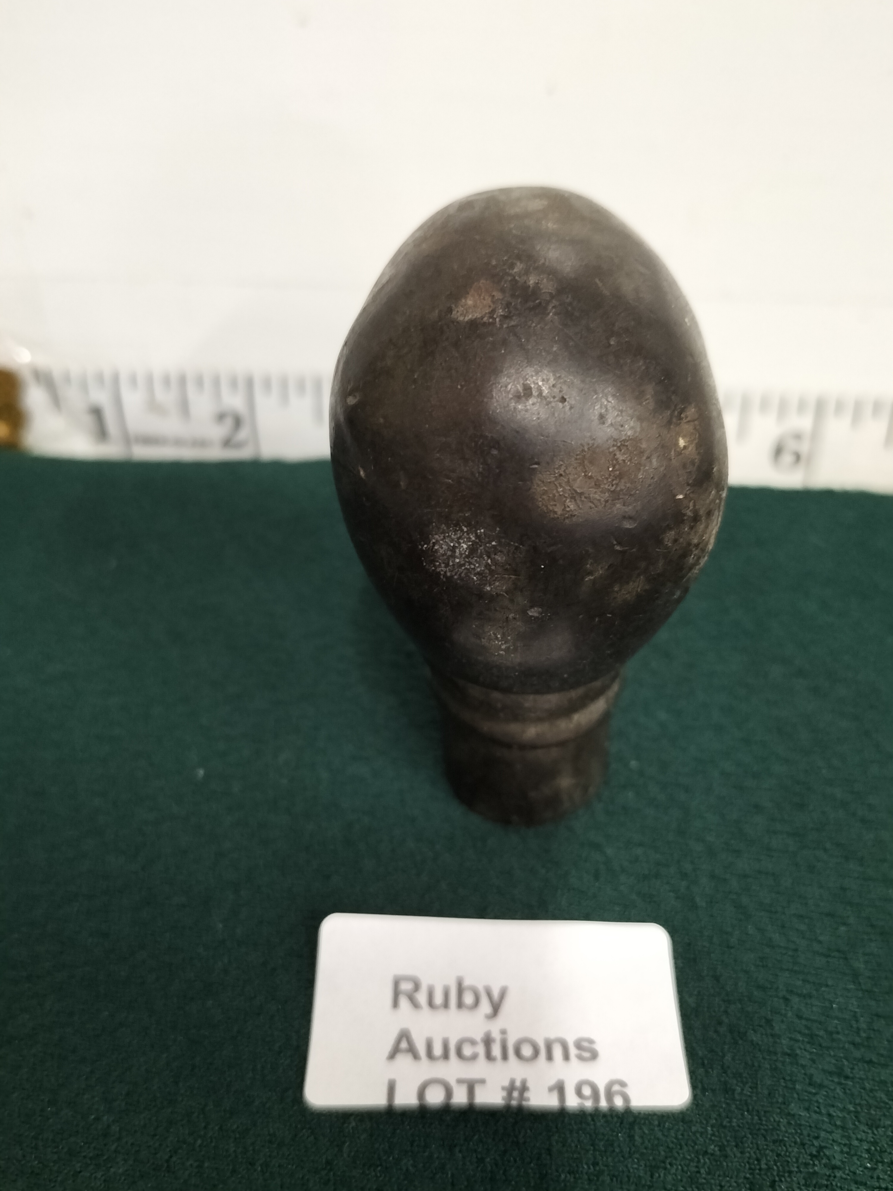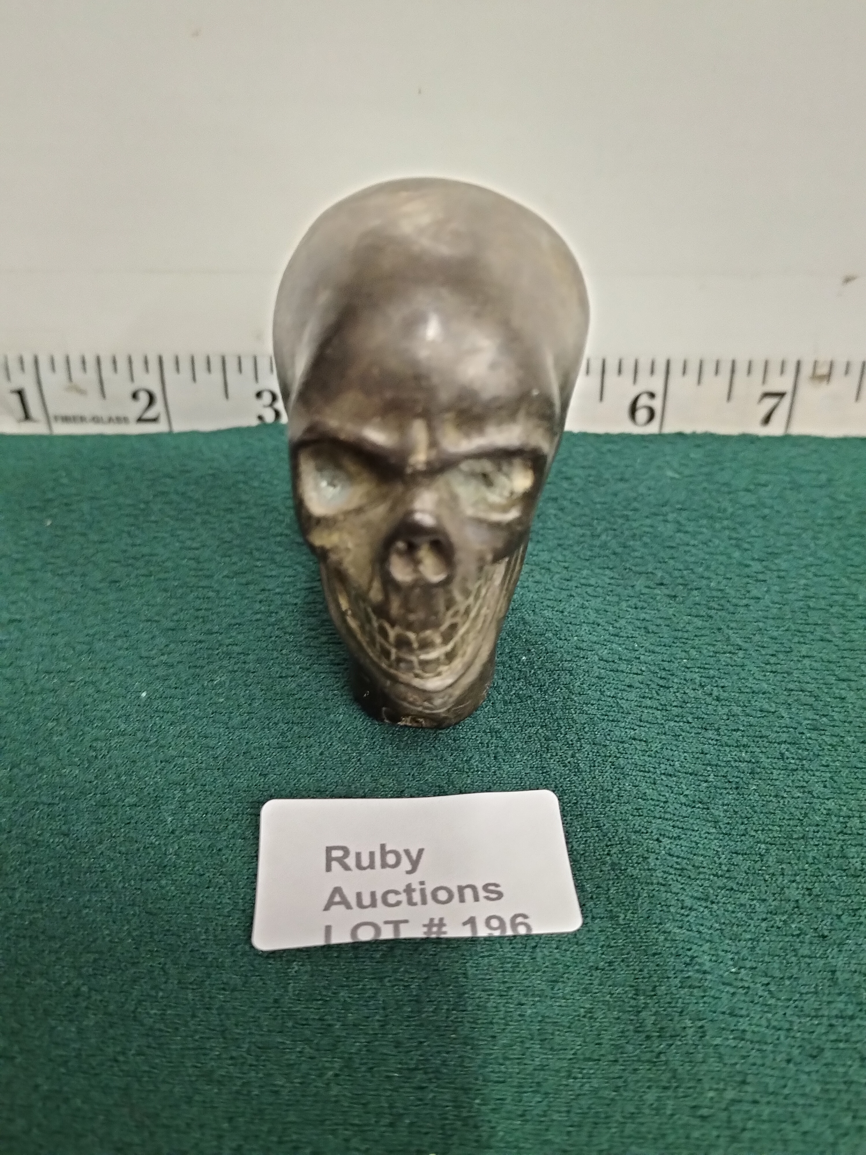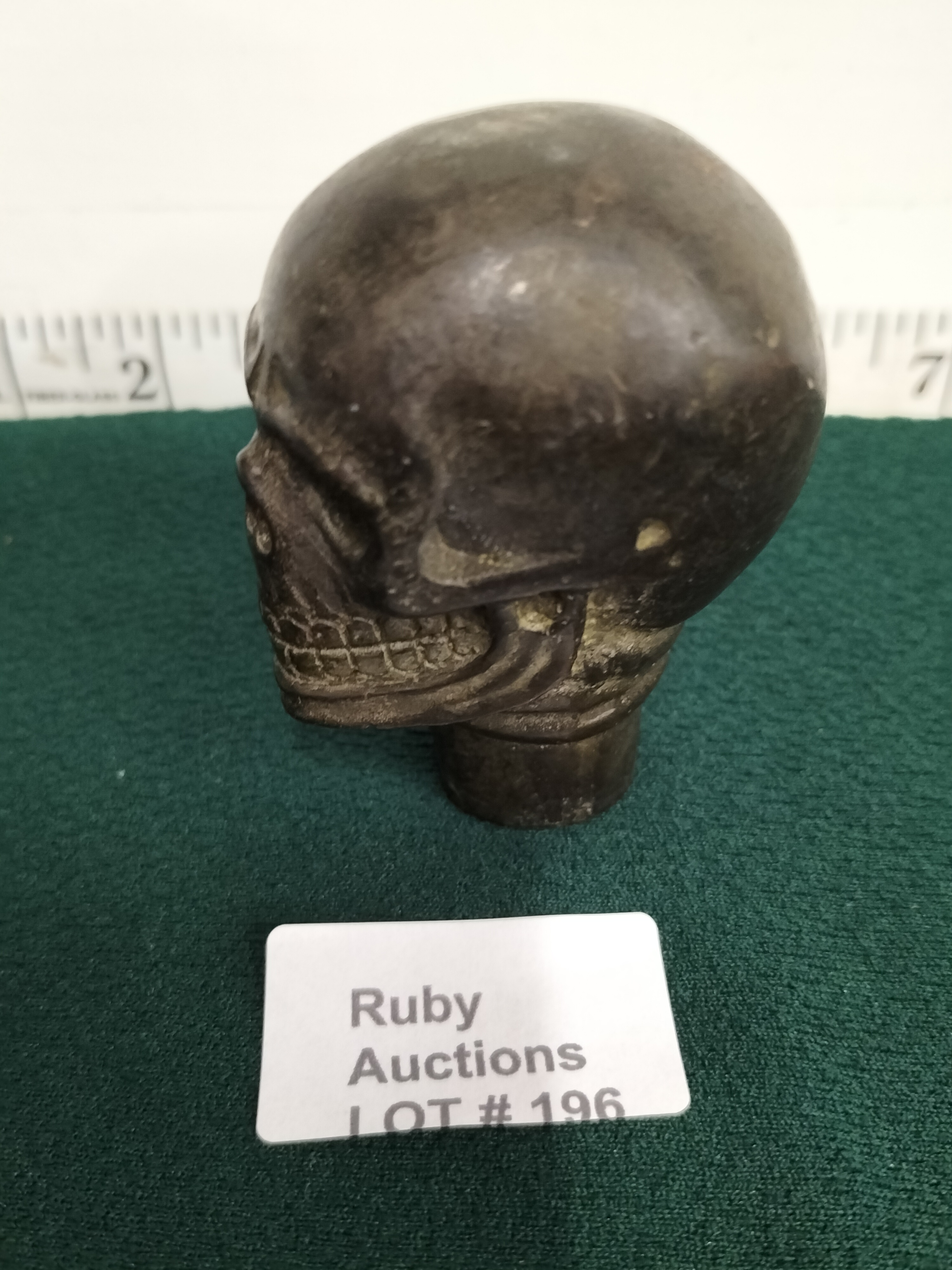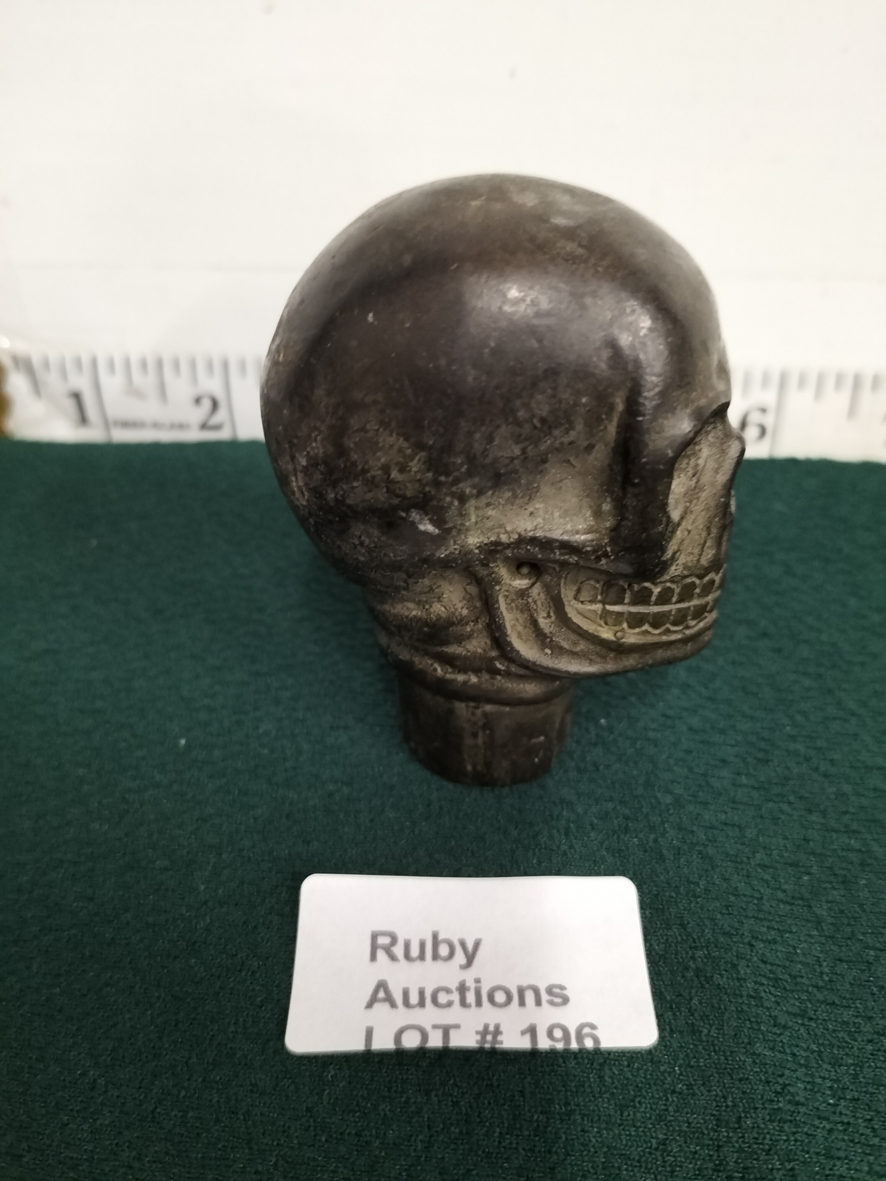 A dark grey sculptural piece in the form of a human skull, possibly a finial or cane topper, measuring approximately 3 inches in height.