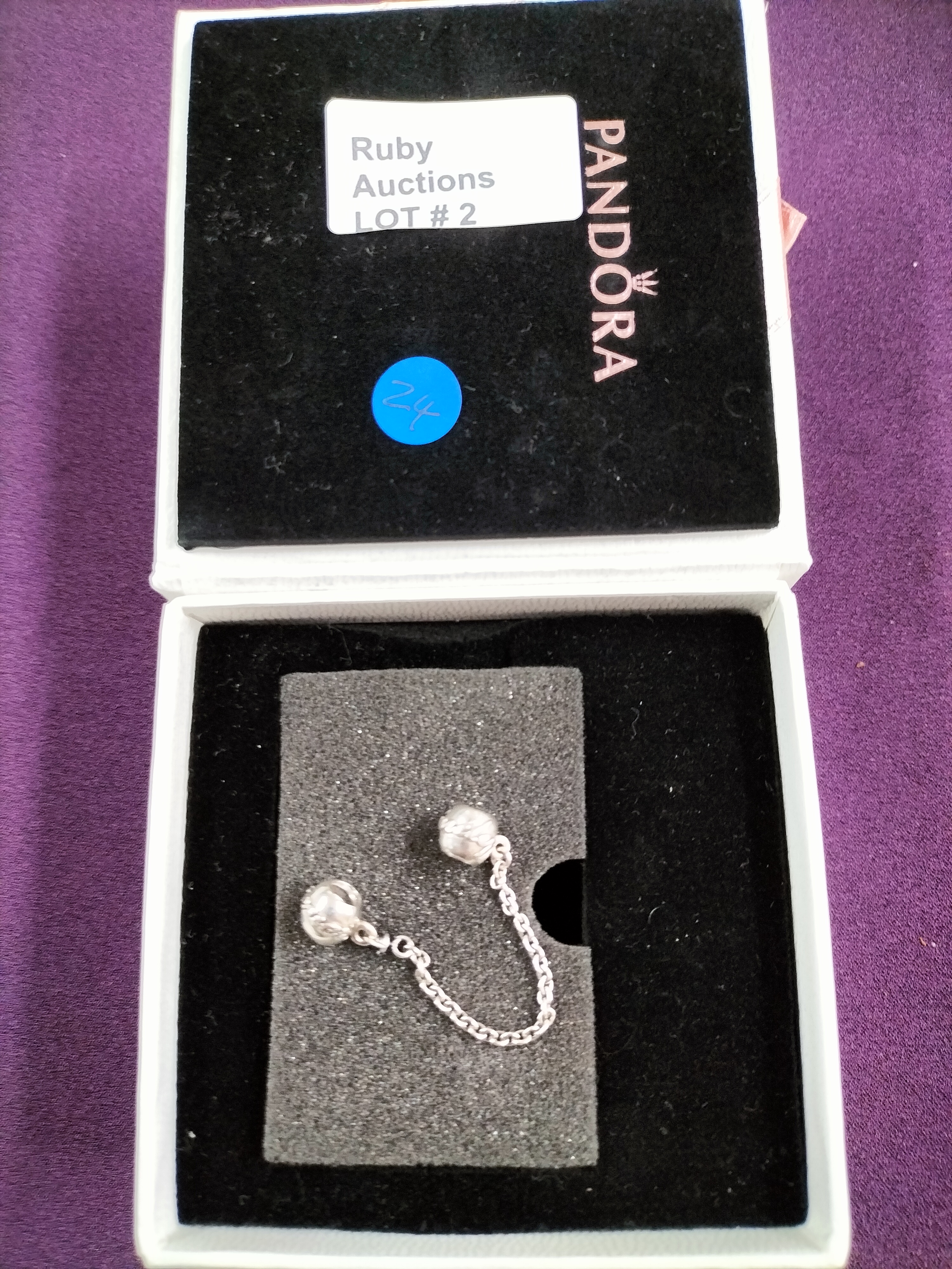 A silver safety chain featuring two decorative charms presented in a branded Pandora box.