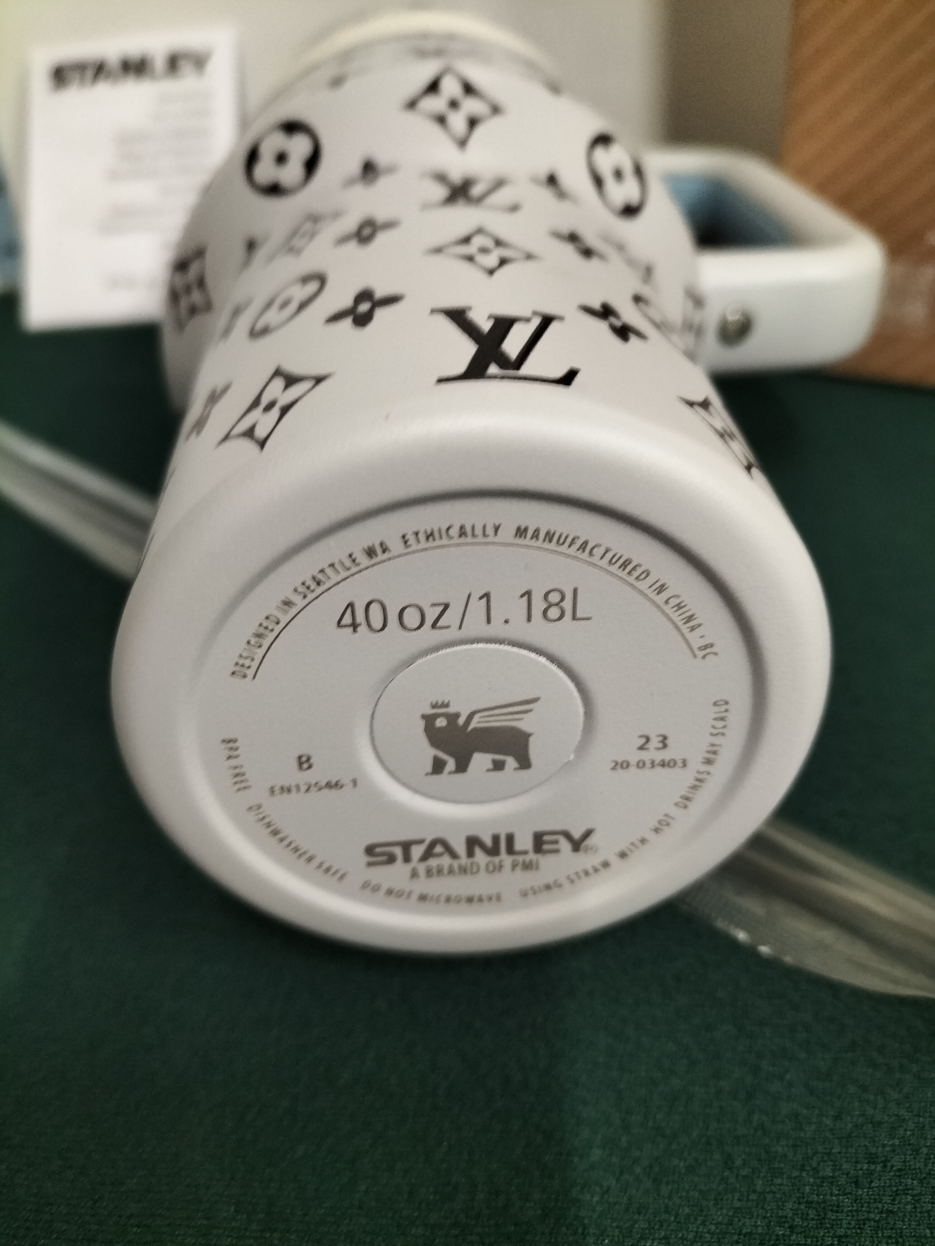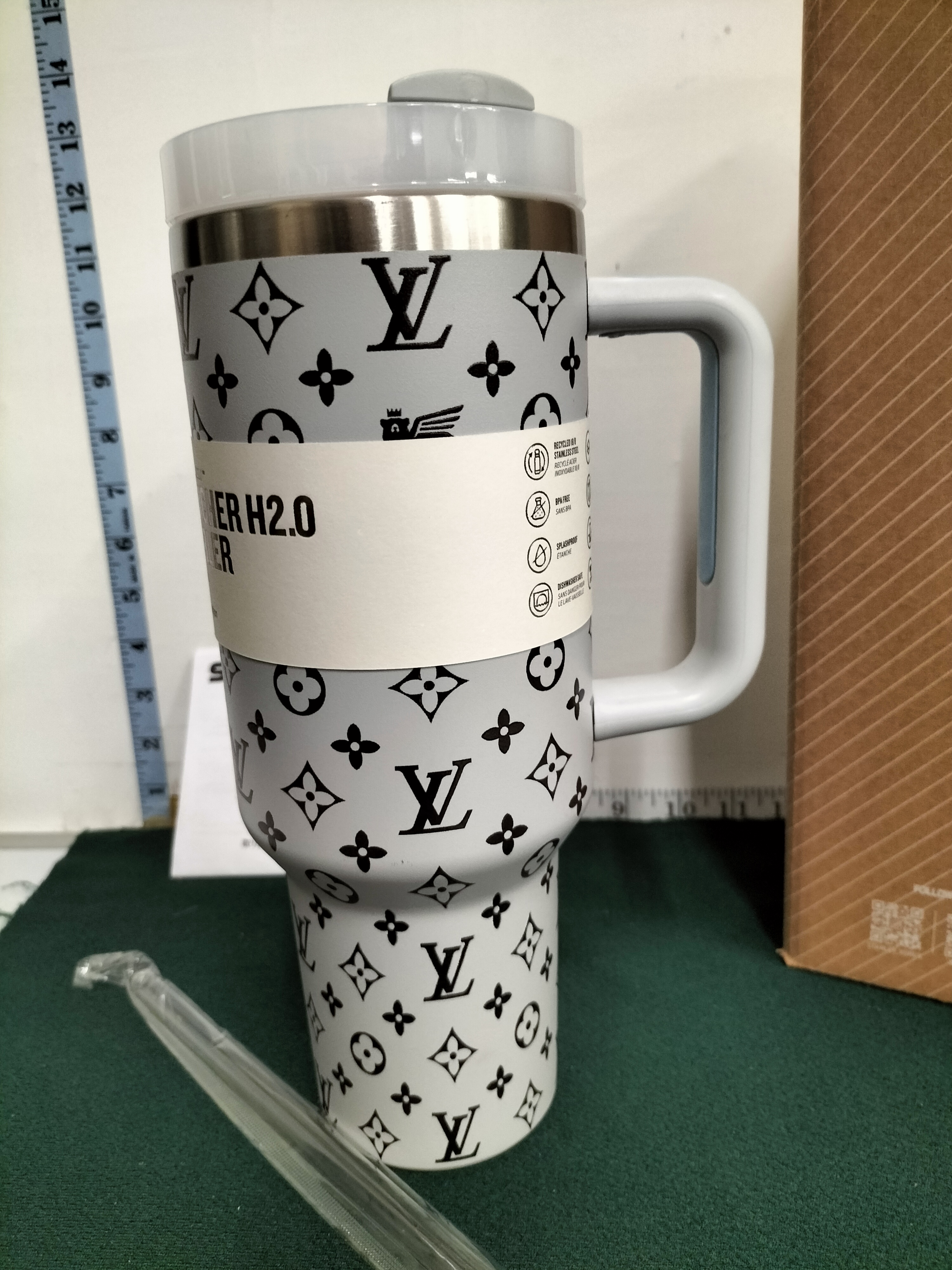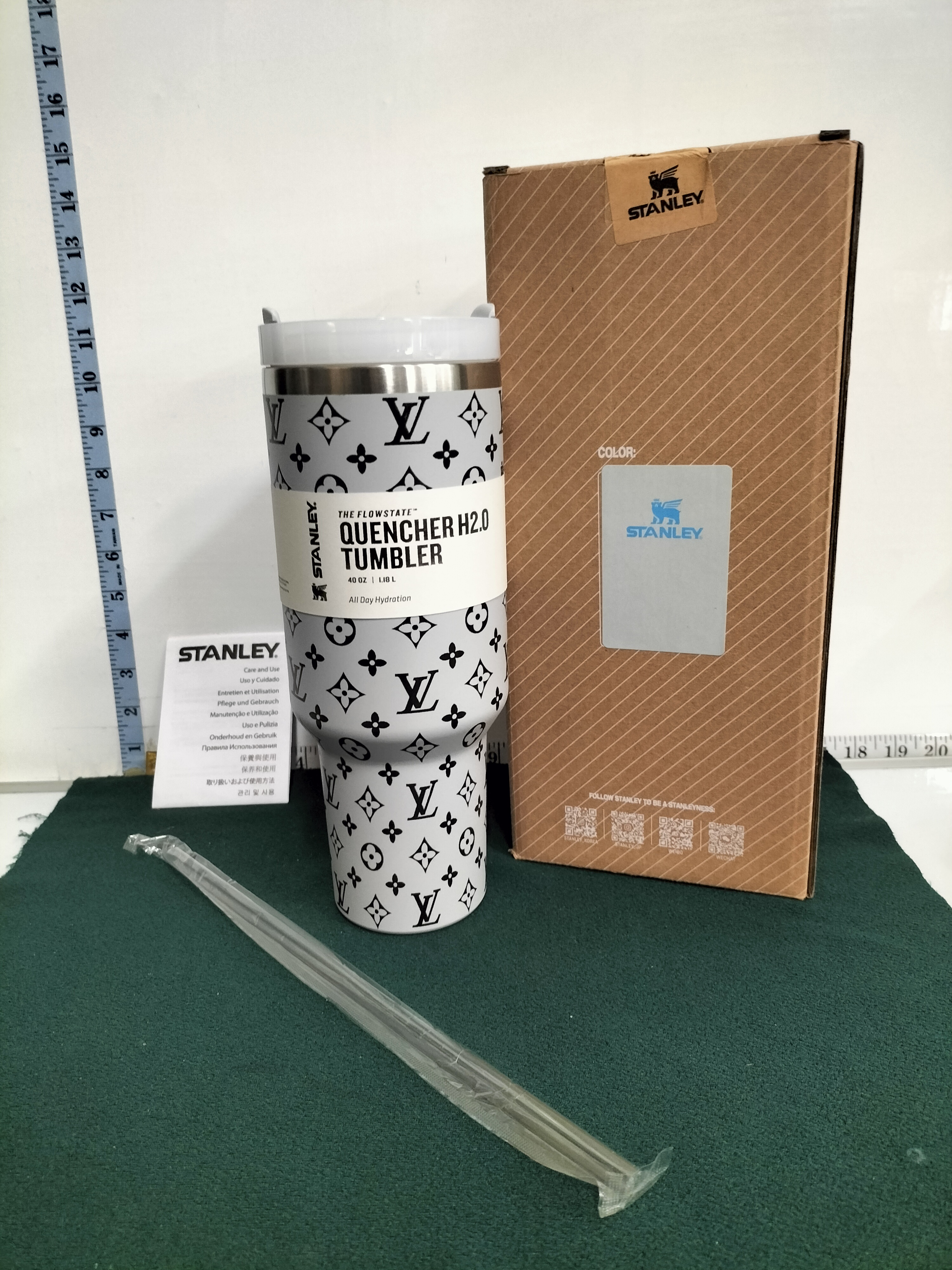 A light grey and black 40 oz Stanley Quencher H2.0 tumbler decorated with a Louis Vuitton monogram pattern, accompanied by its original retail box, straw, and care guide, measuring approximately 26.5 cm in height.