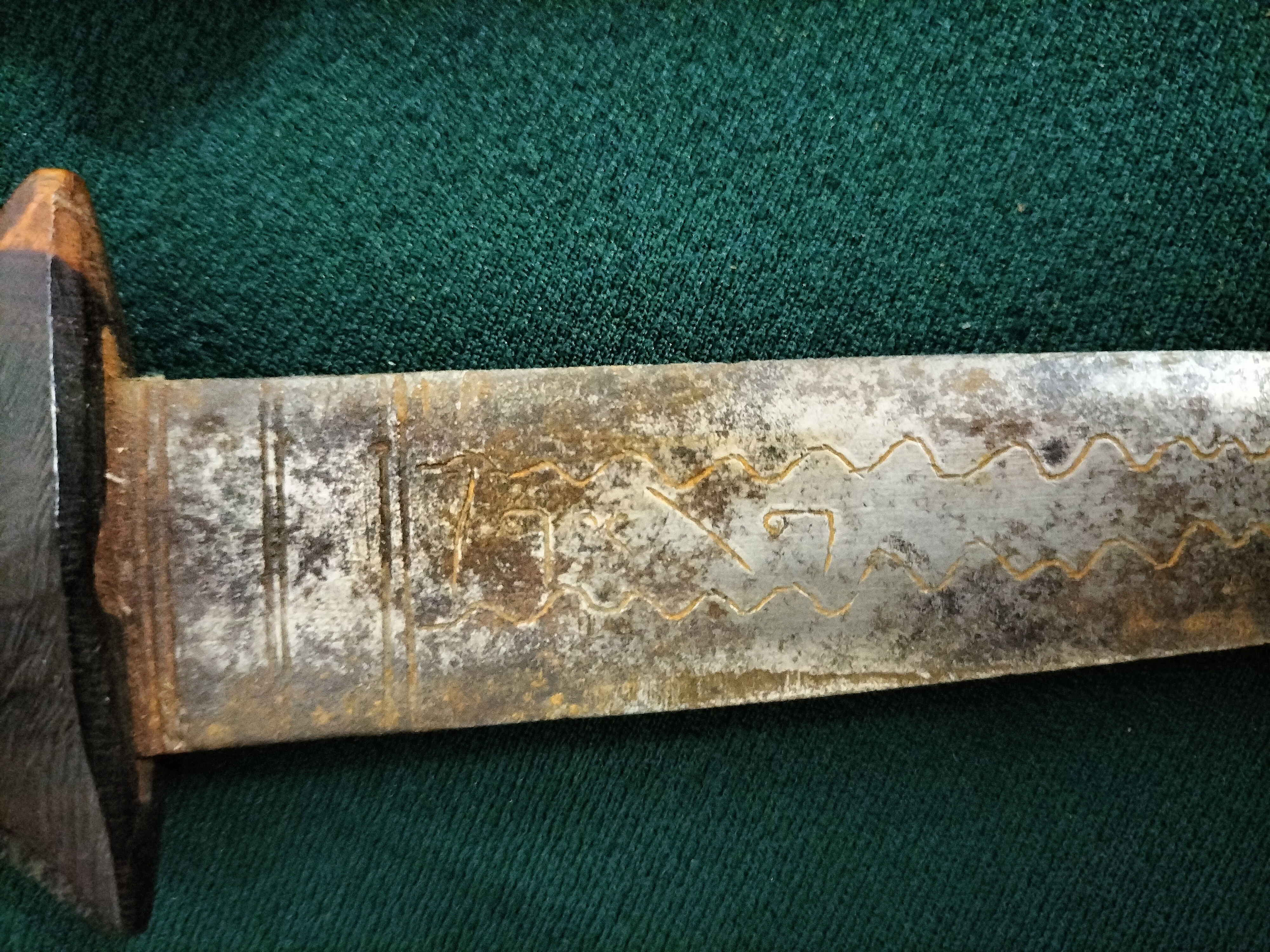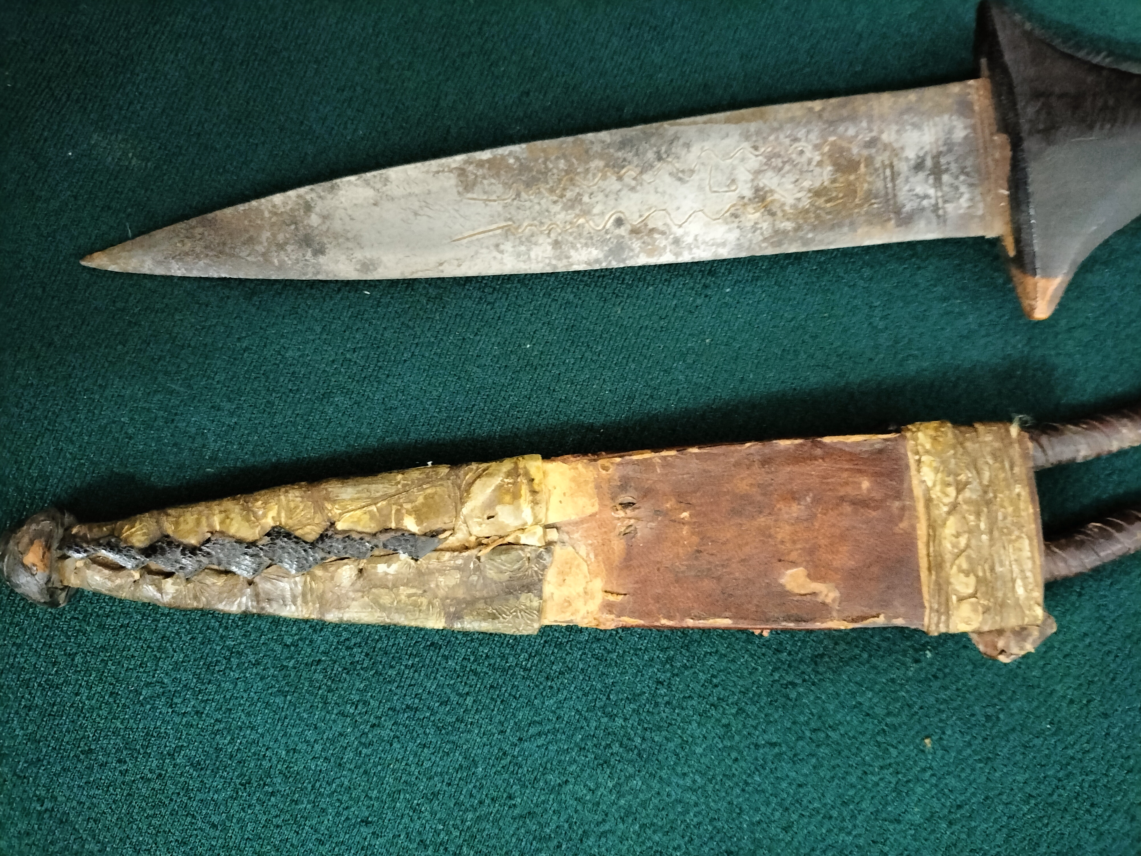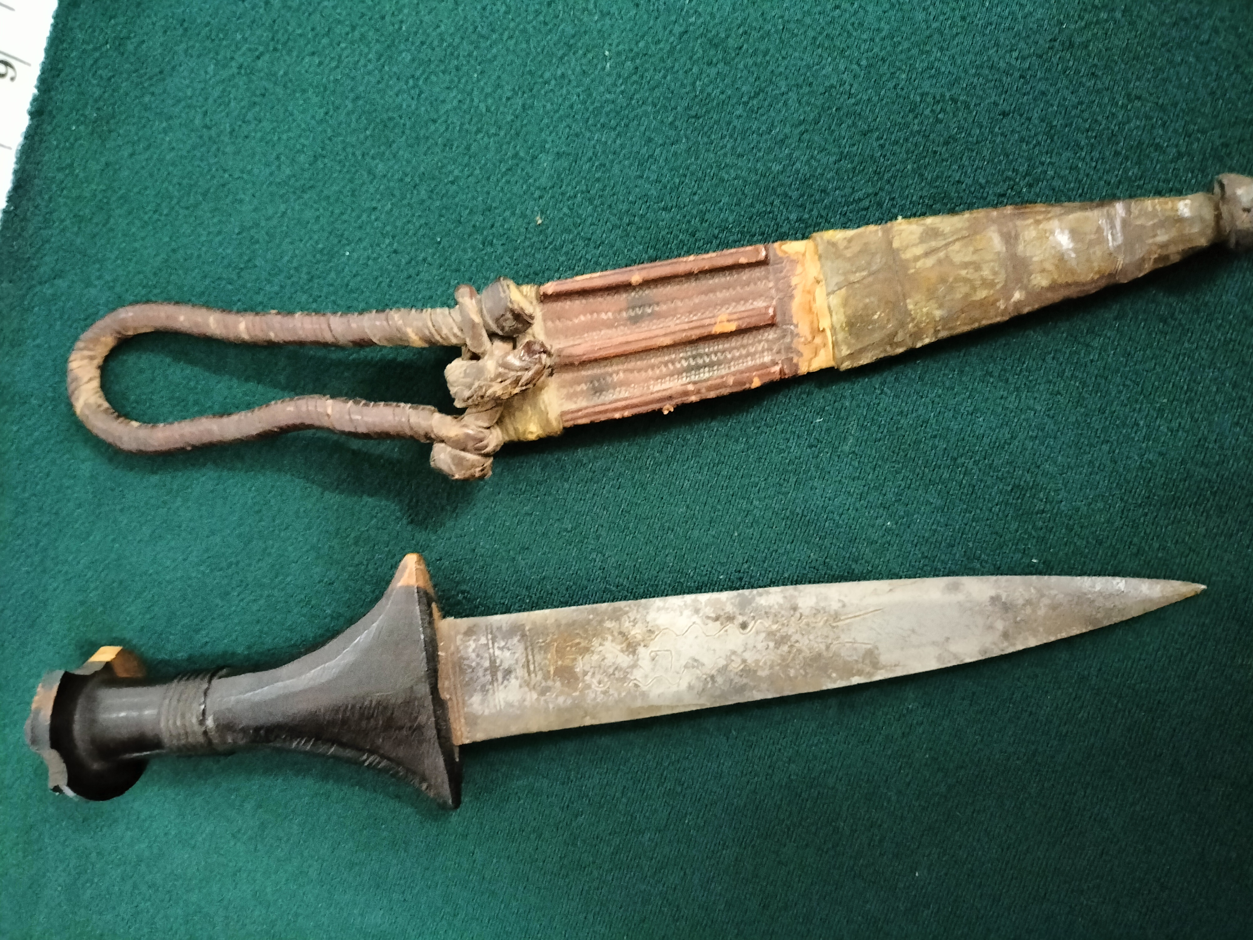 A Sudanese arm dagger featuring an etched metal blade and dark hilt, complete with a leather and animal skin sheath.