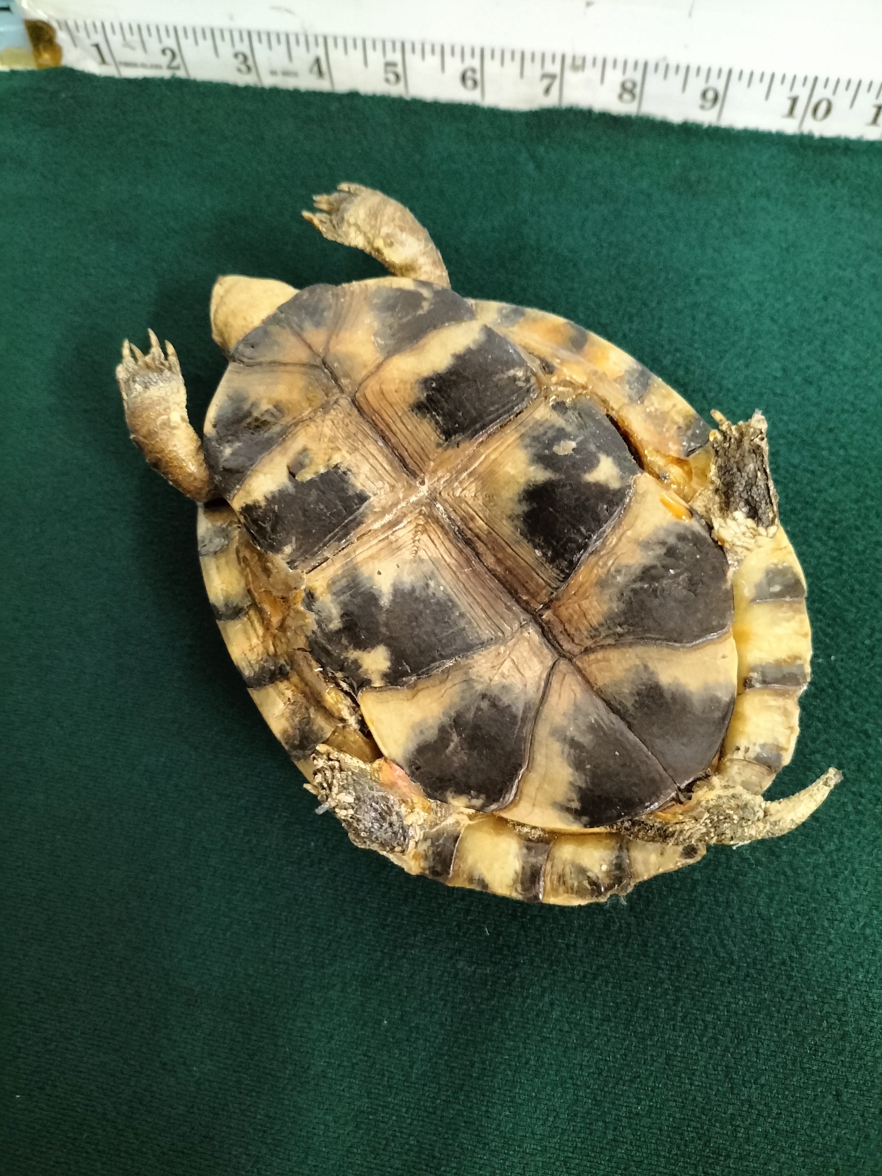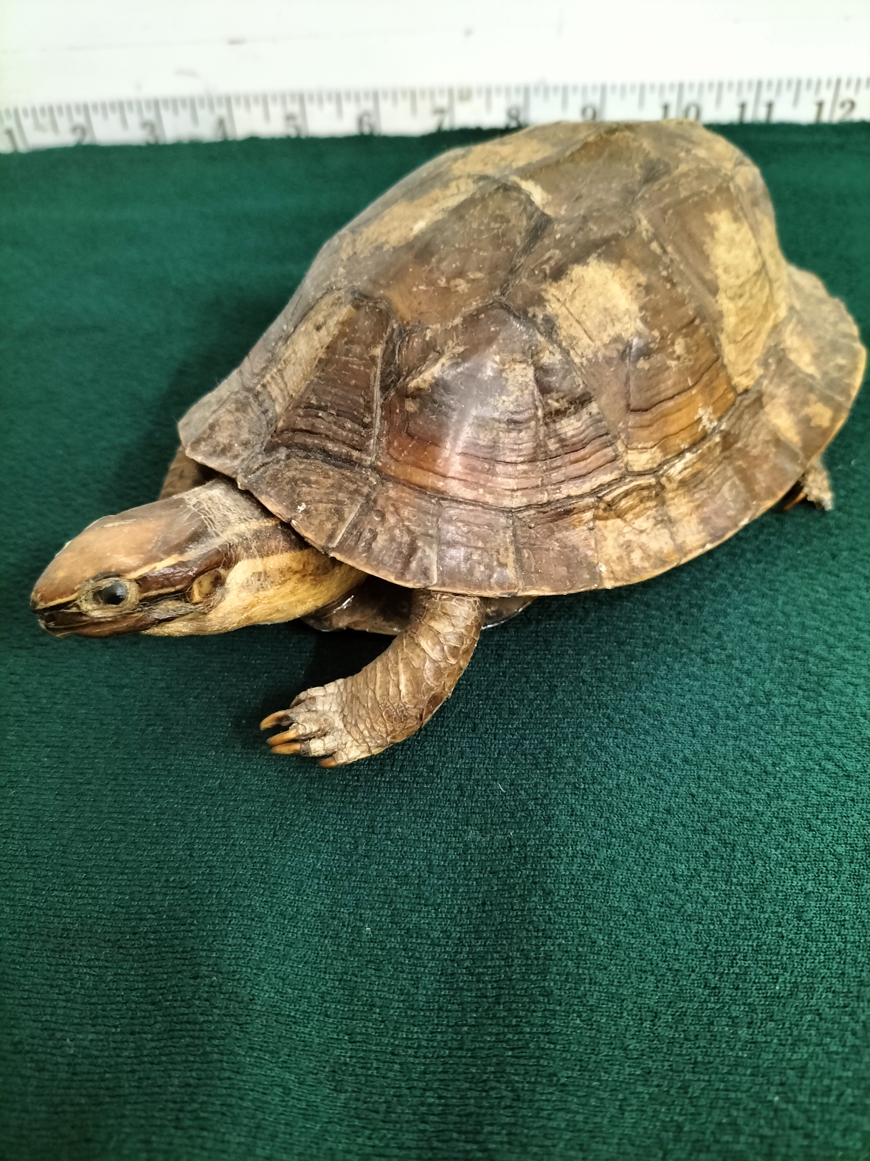 A taxidermy pond turtle with a brown and tan shell and dark markings to the underside, measuring approximately 8 inches in length.