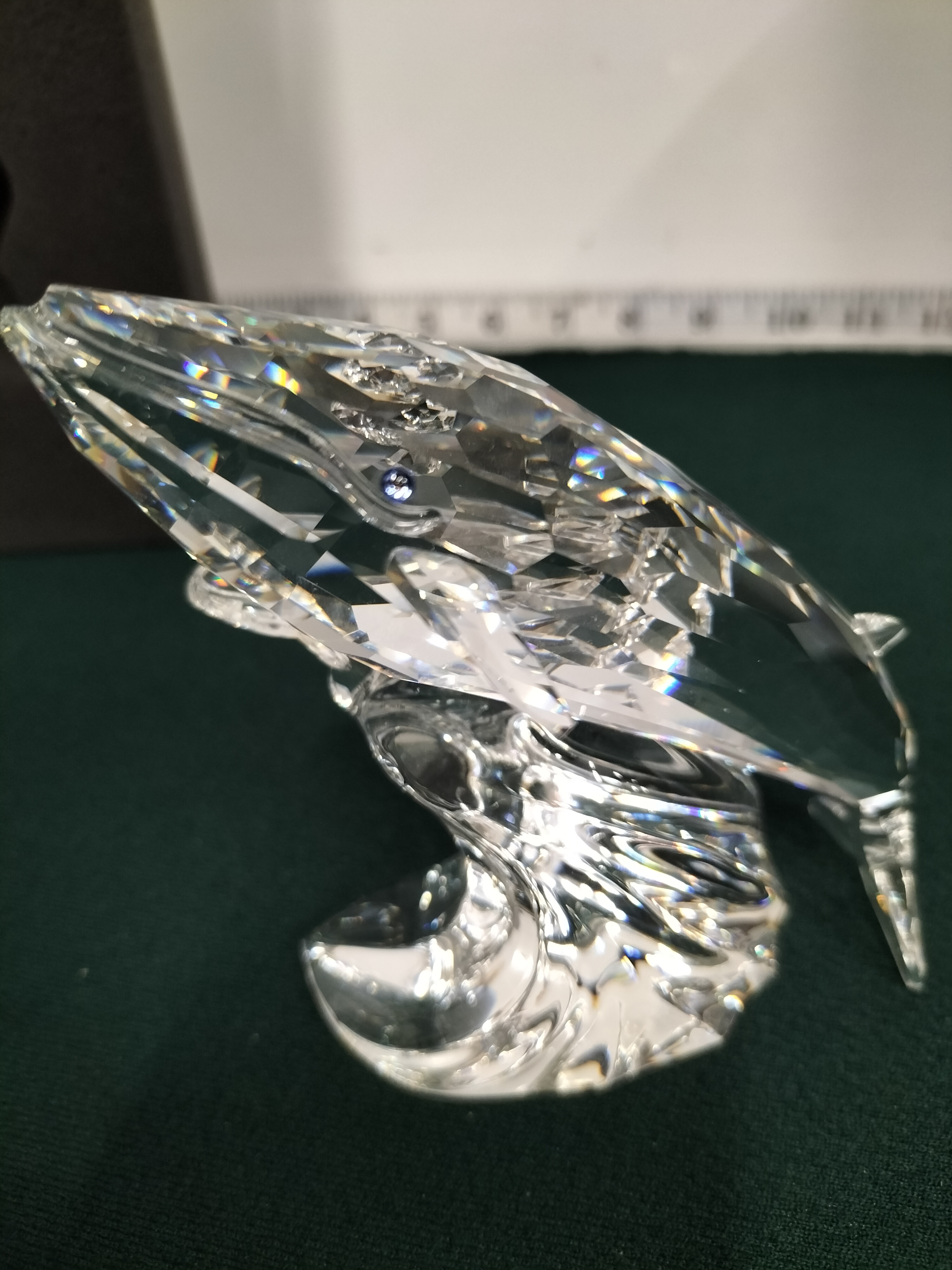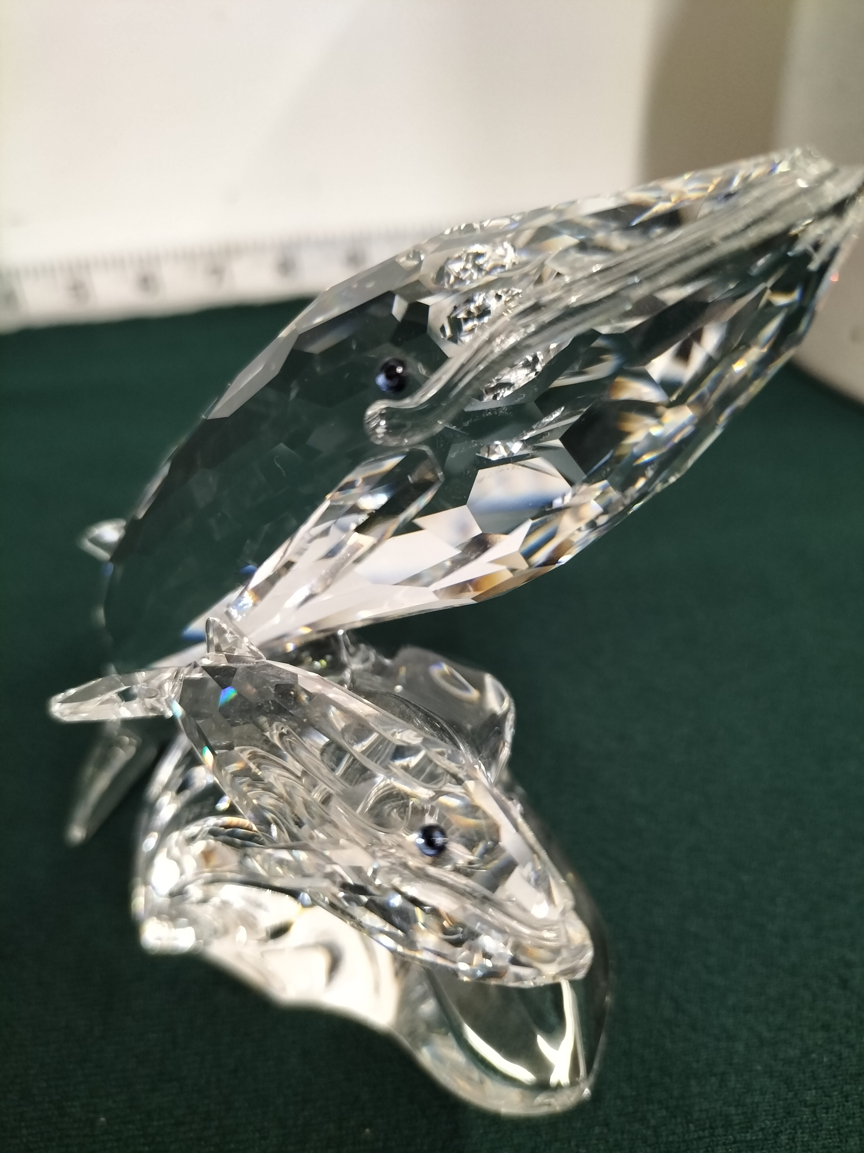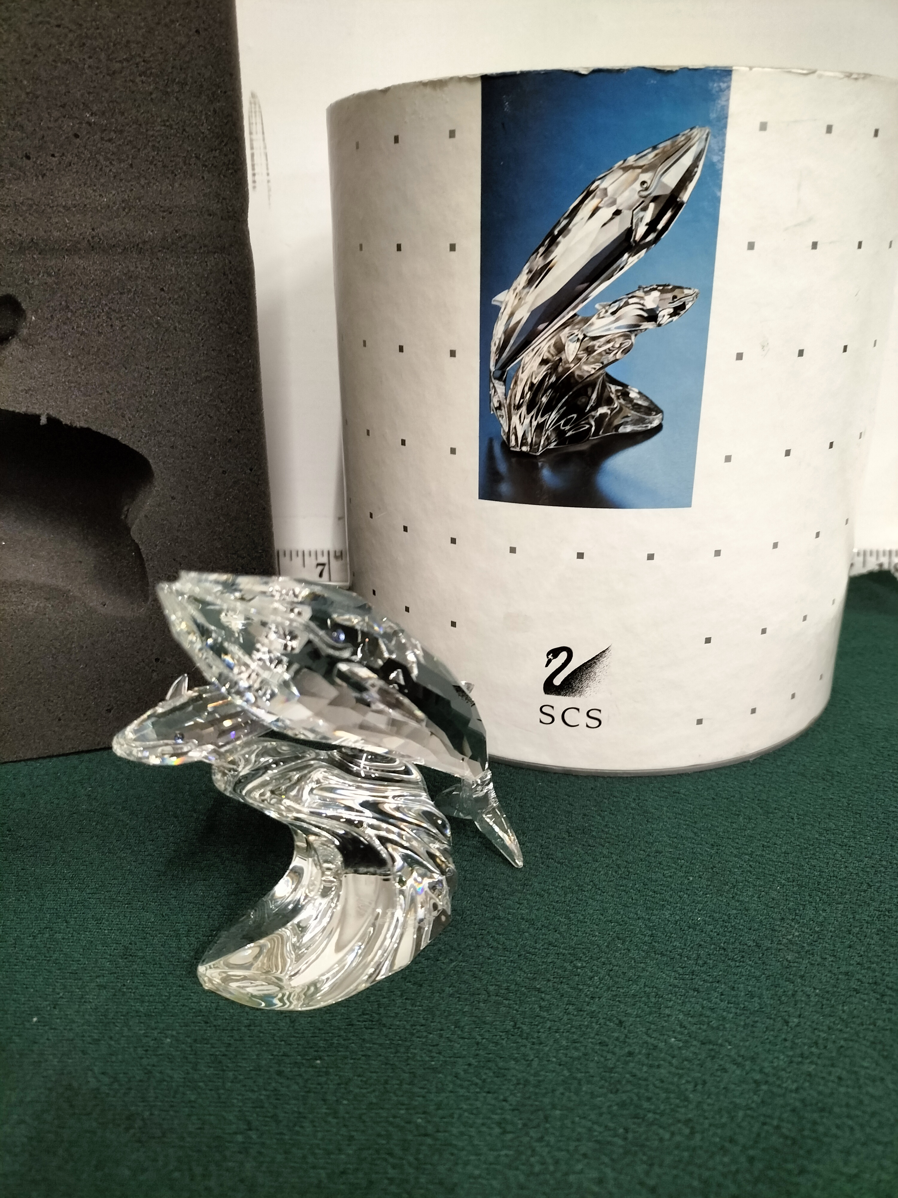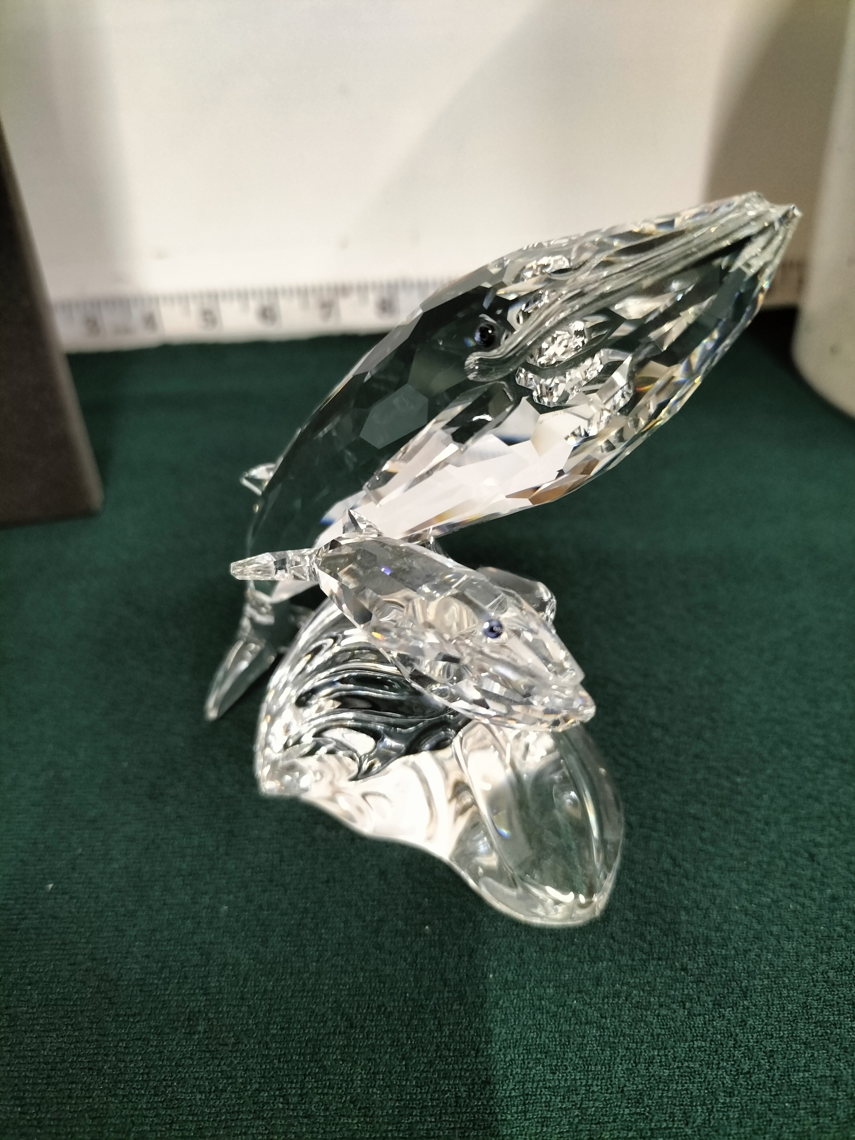 A clear faceted Swarovski crystal figurine depicting two whales breaching on a wave, accompanied by its original cylindrical SCS box.