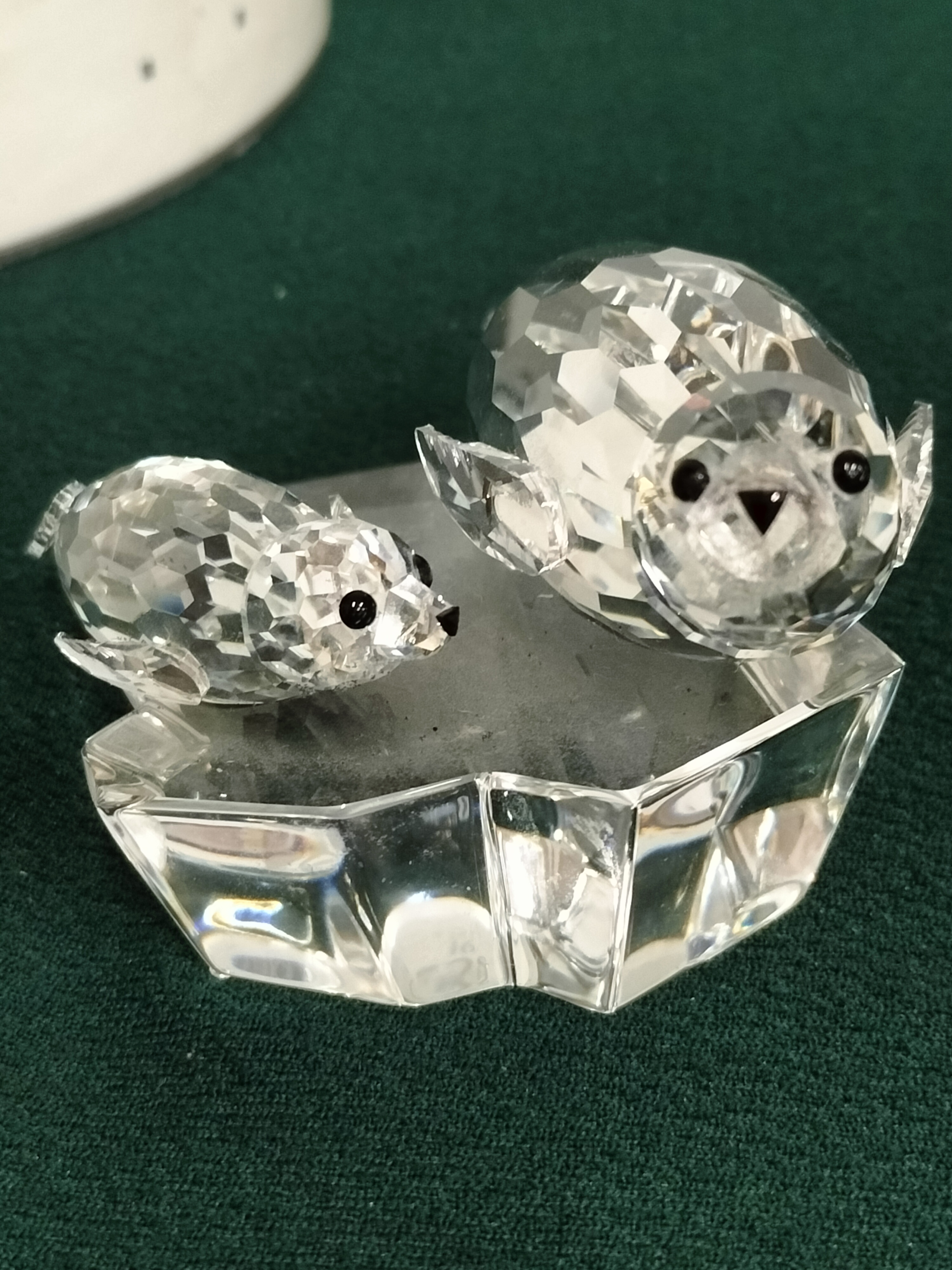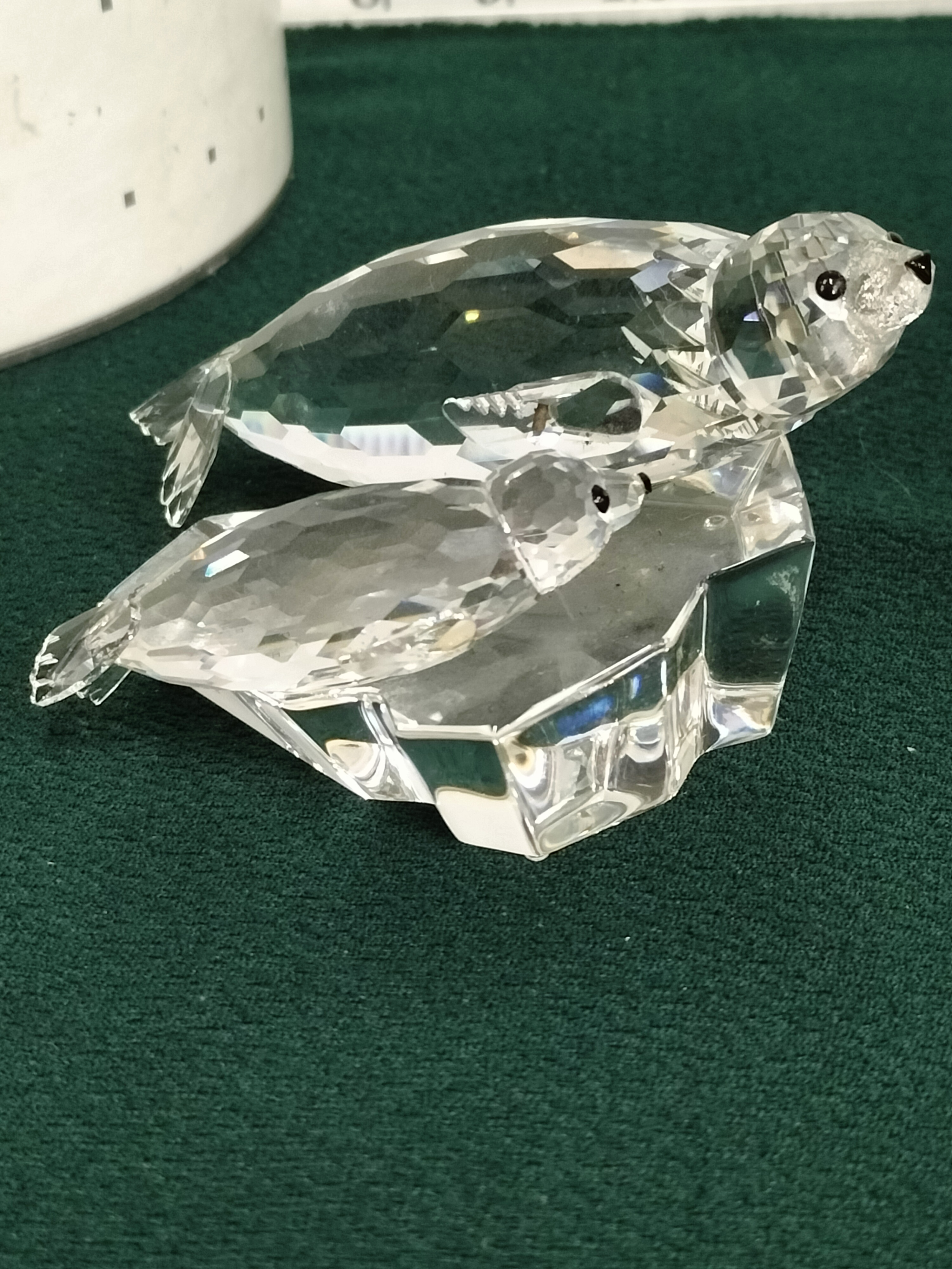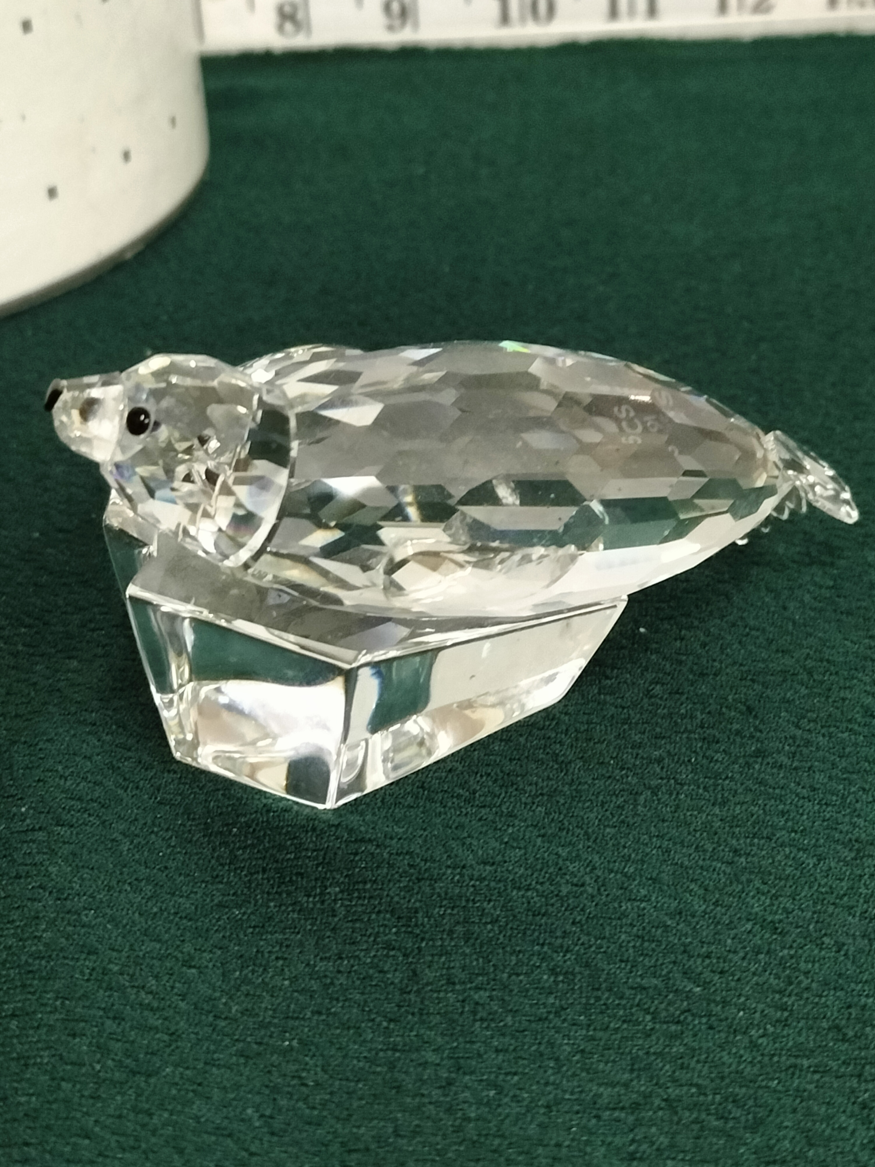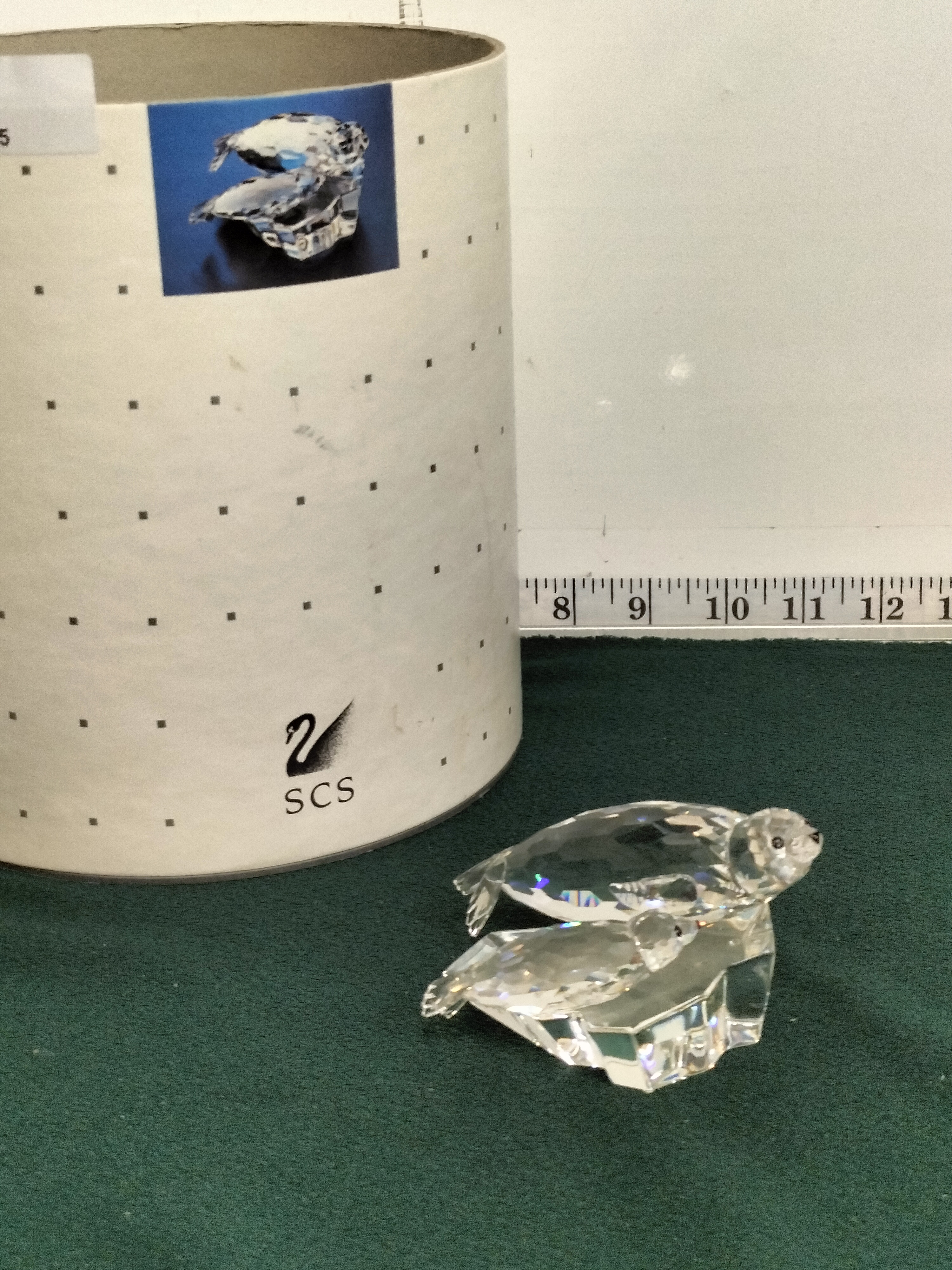 A clear faceted crystal figurine depicting two seals on an ice block, etched SCS 91, with original cylindrical packaging.
