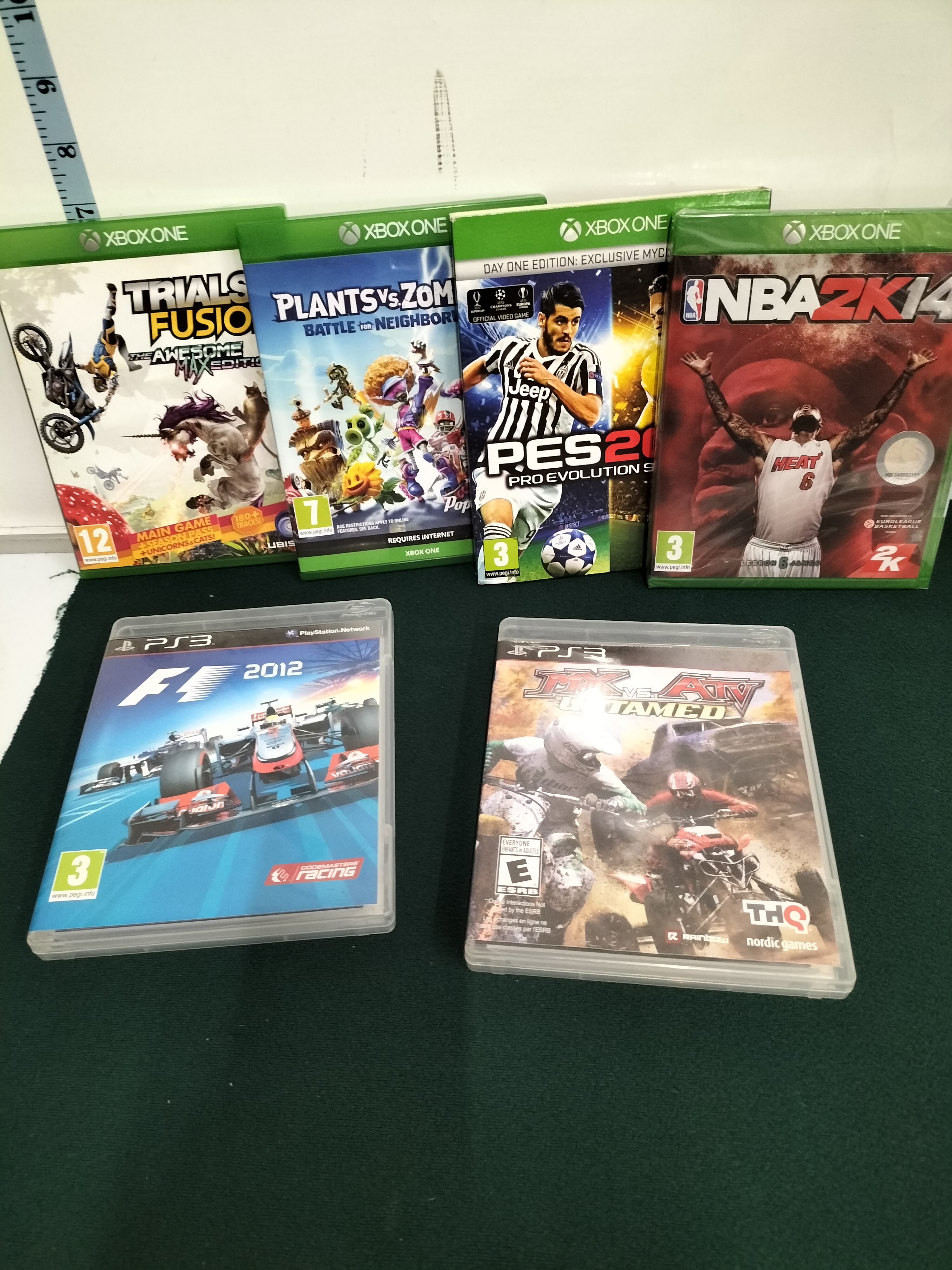 A collection of multicoloured video games for Xbox One and PlayStation 3 featuring titles from publishers including Ubisoft, EA, Konami, 2K, Codemasters, and THQ Nordic.