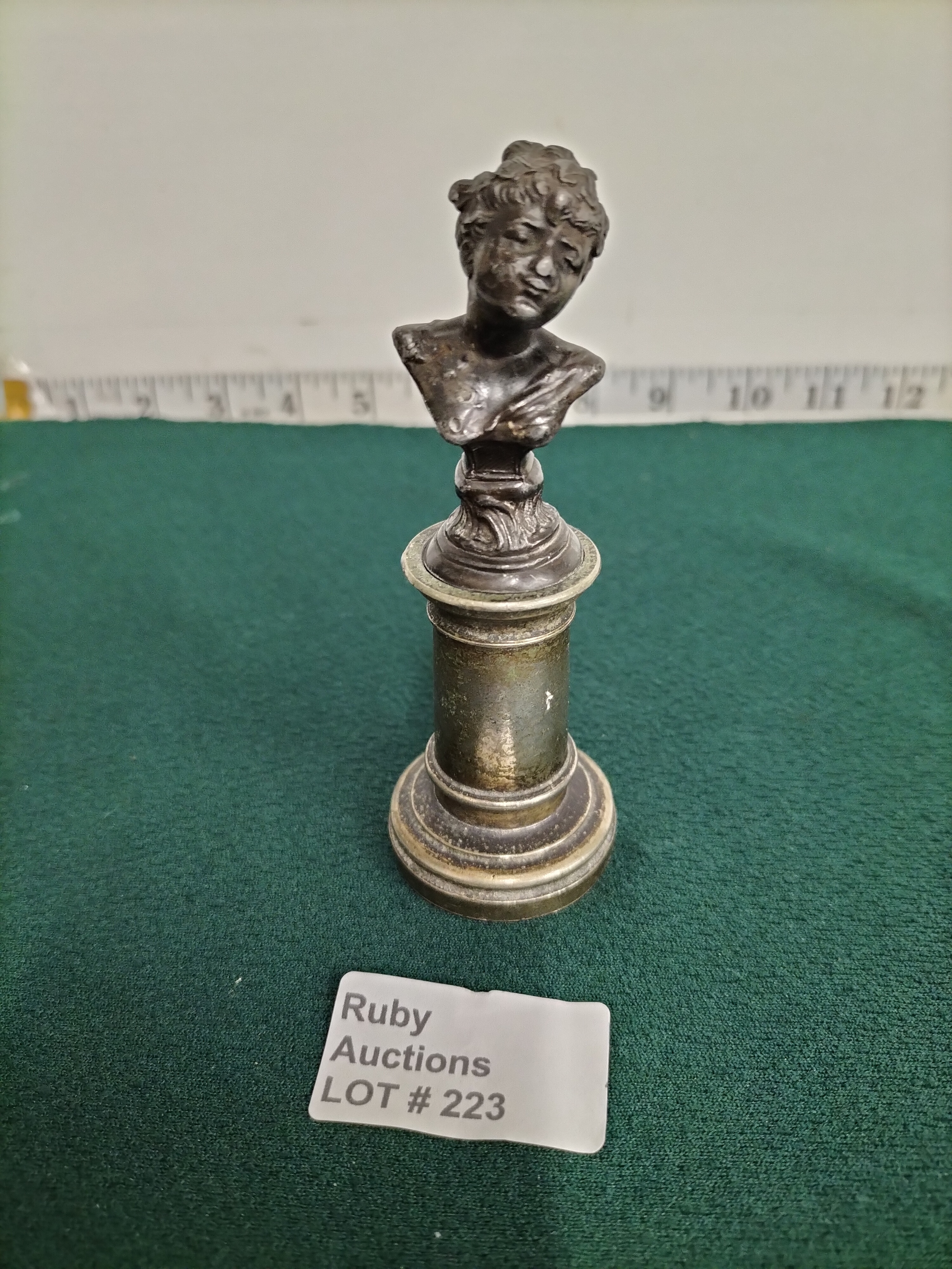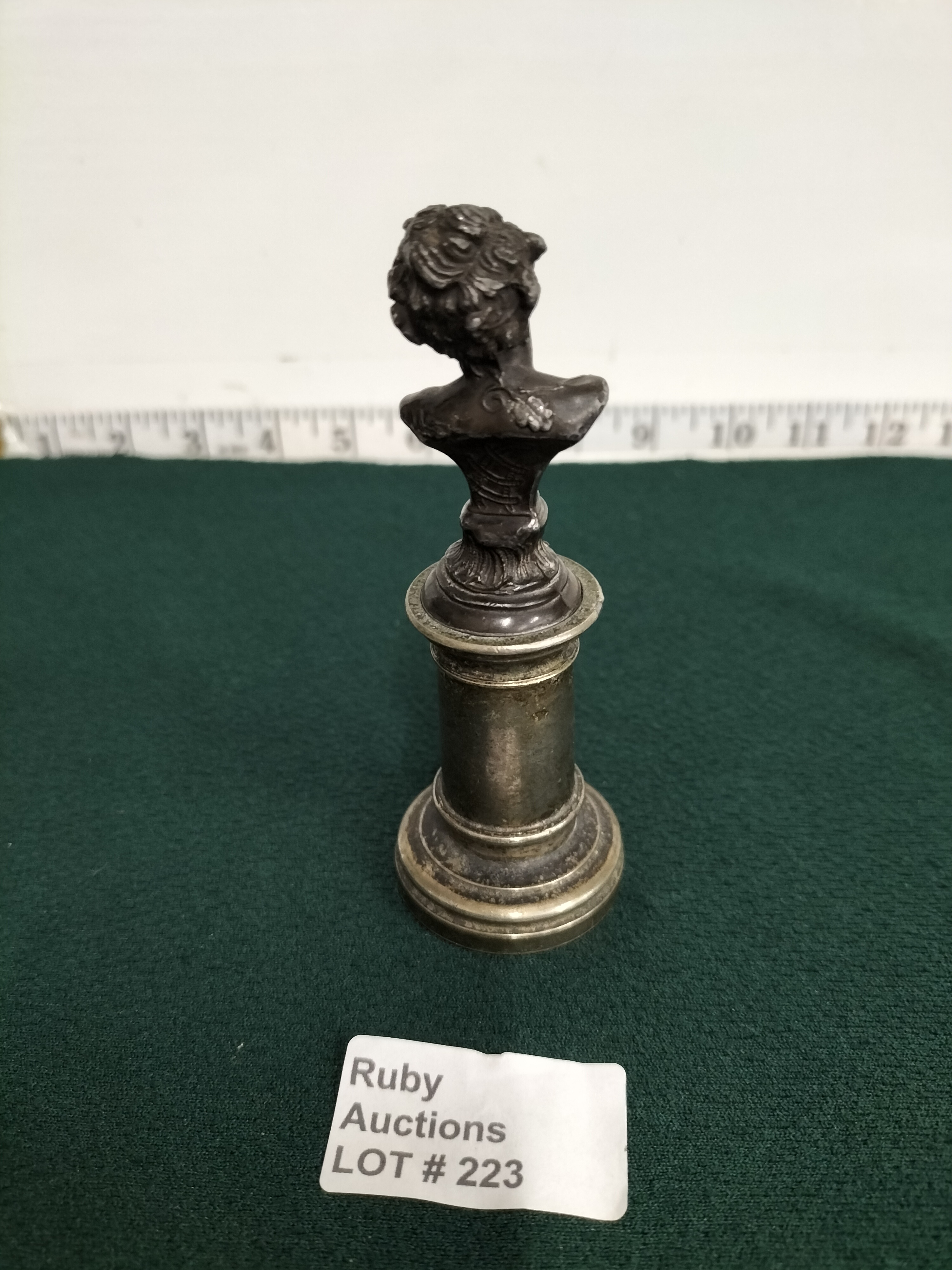 A small patinated Grand Tour cast iron bust of a woman in the French style, mounted on a cylindrical pedestal base, measuring approximately 6 inches in height.