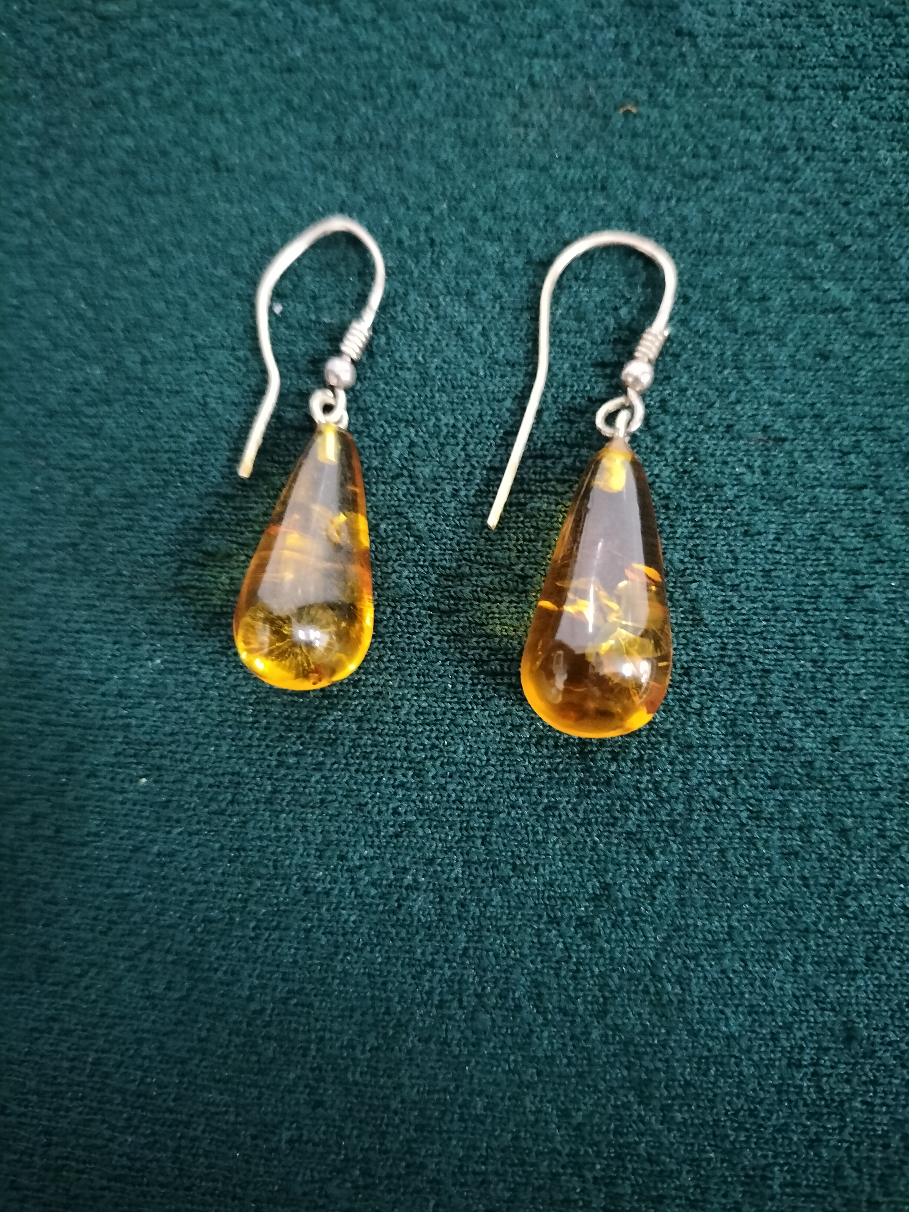 A pair of teardrop-shaped translucent honey-yellow amber earrings suspended from silver-toned metal hooks.