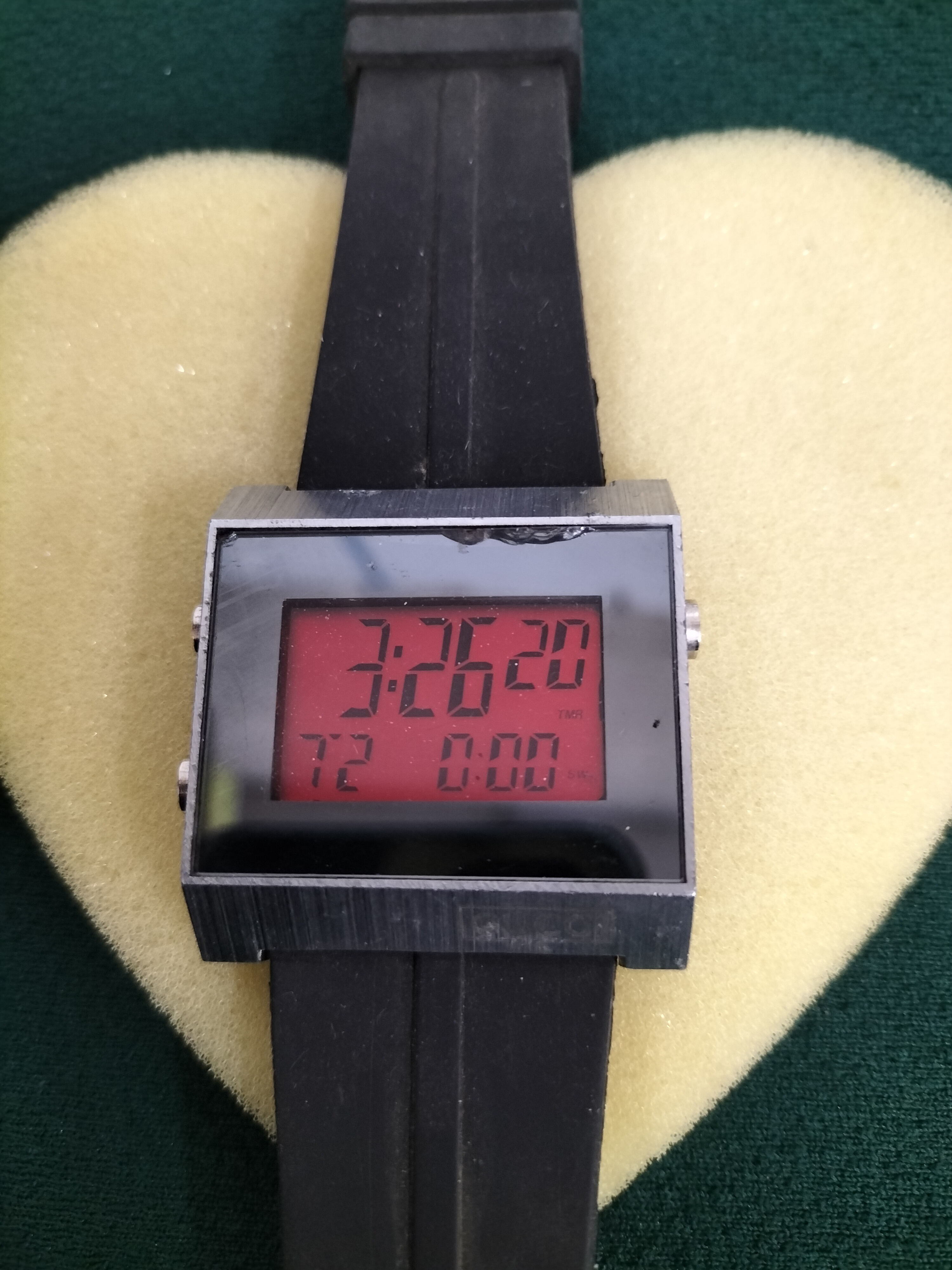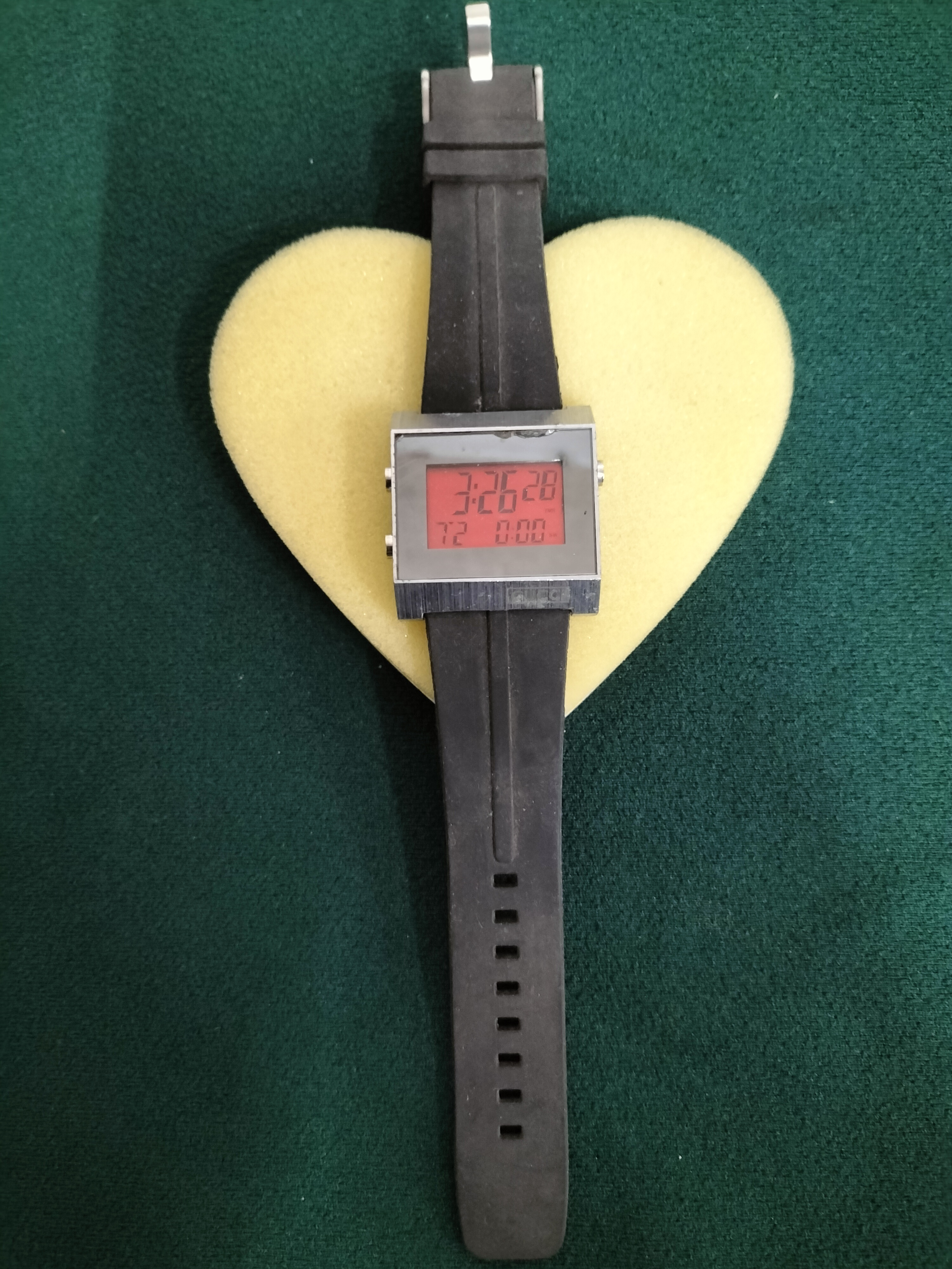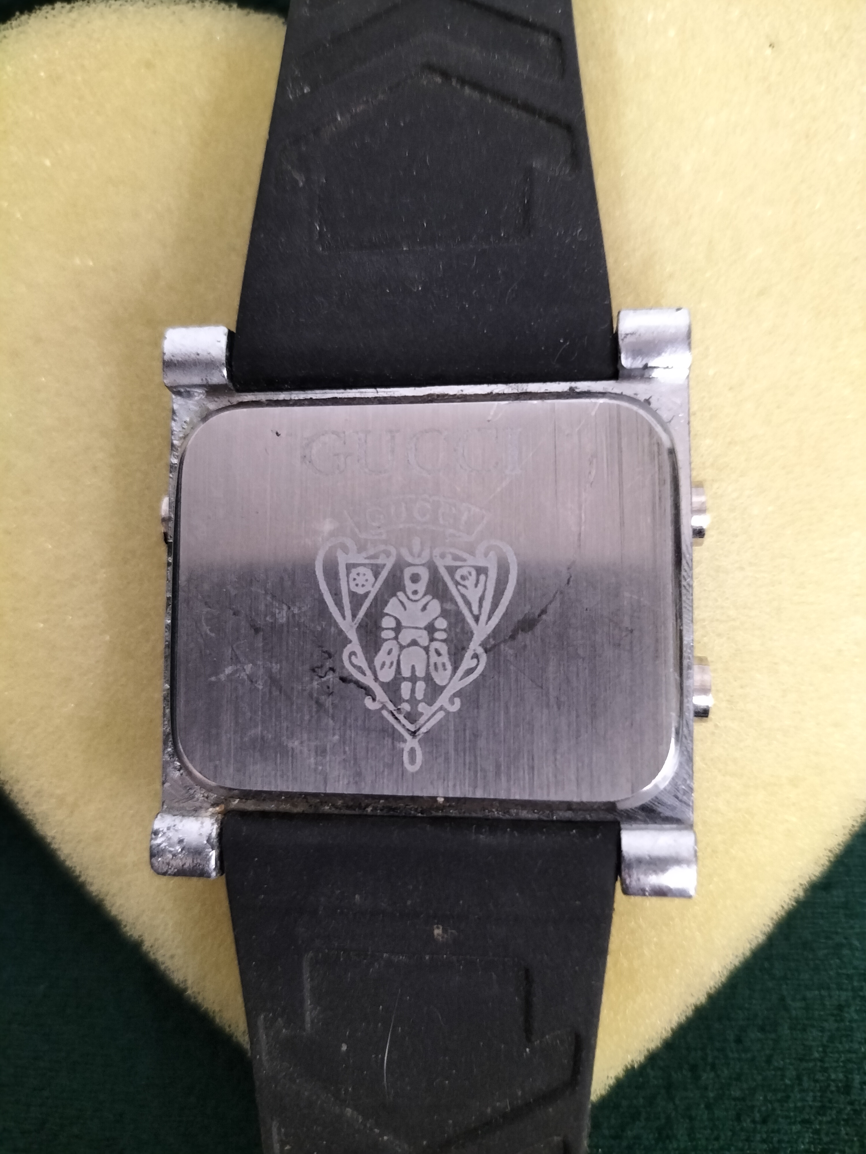 A Genuine Gucci digital watch featuring a square silver-toned case with a red LCD display and a black strap, showing the brand crest engraved on the reverse.