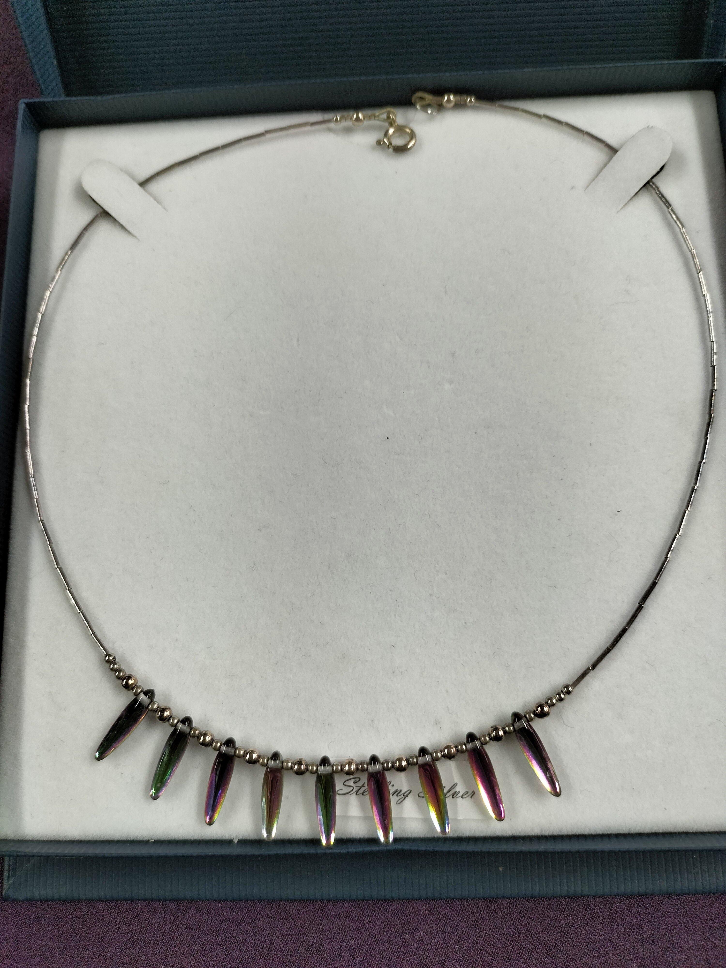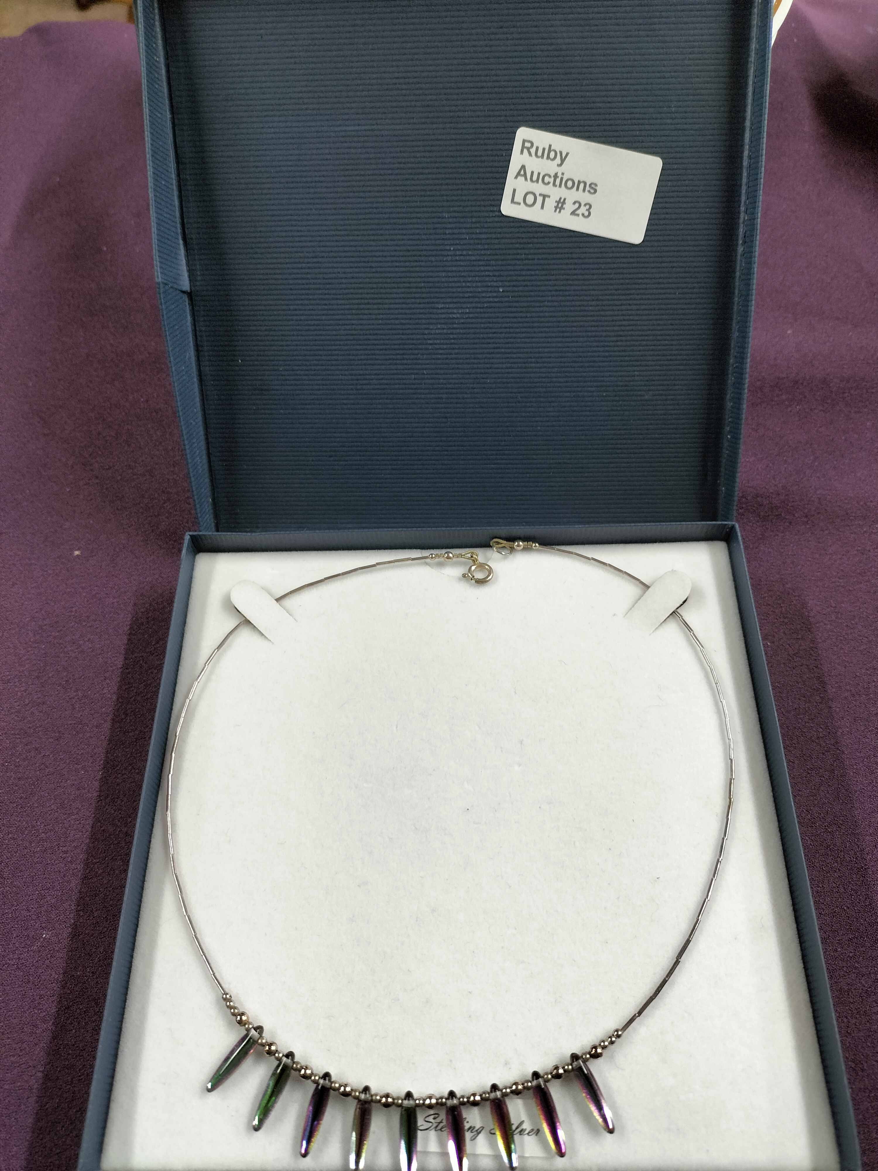 A sterling silver necklace featuring multiple iridescent pendants in shades of purple, green, and gold, presented in a blue box inscribed Sterling Silver.