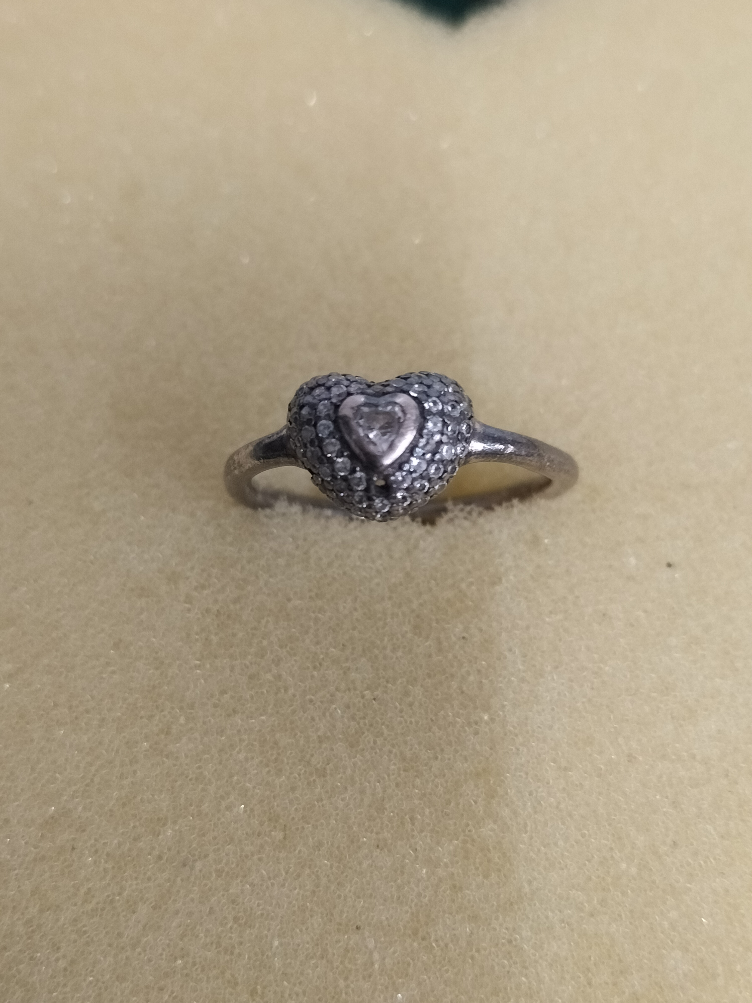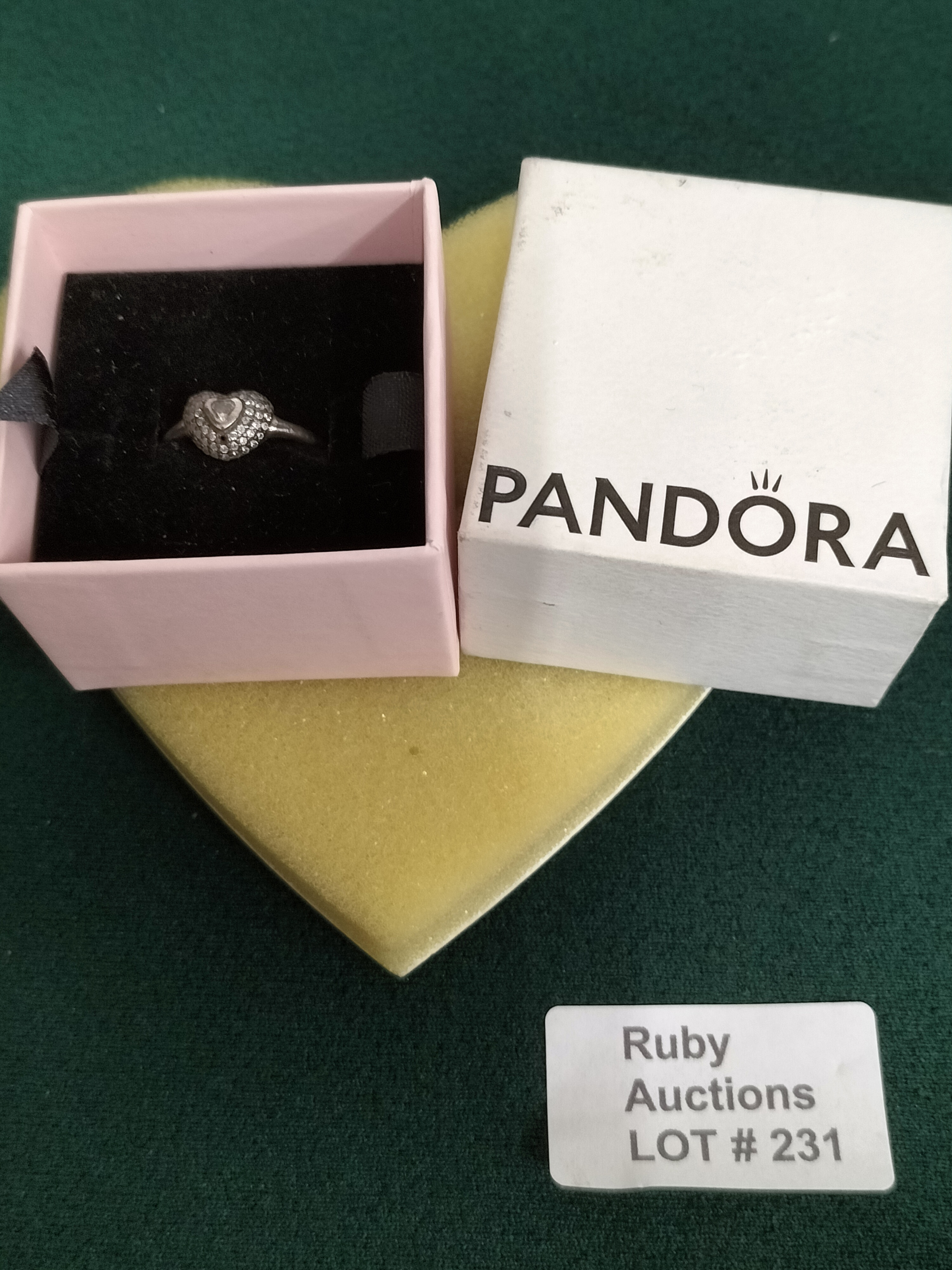 A silver-toned ring featuring a heart-shaped cluster set with clear stones, presented in a branded Pandora jewellery box.