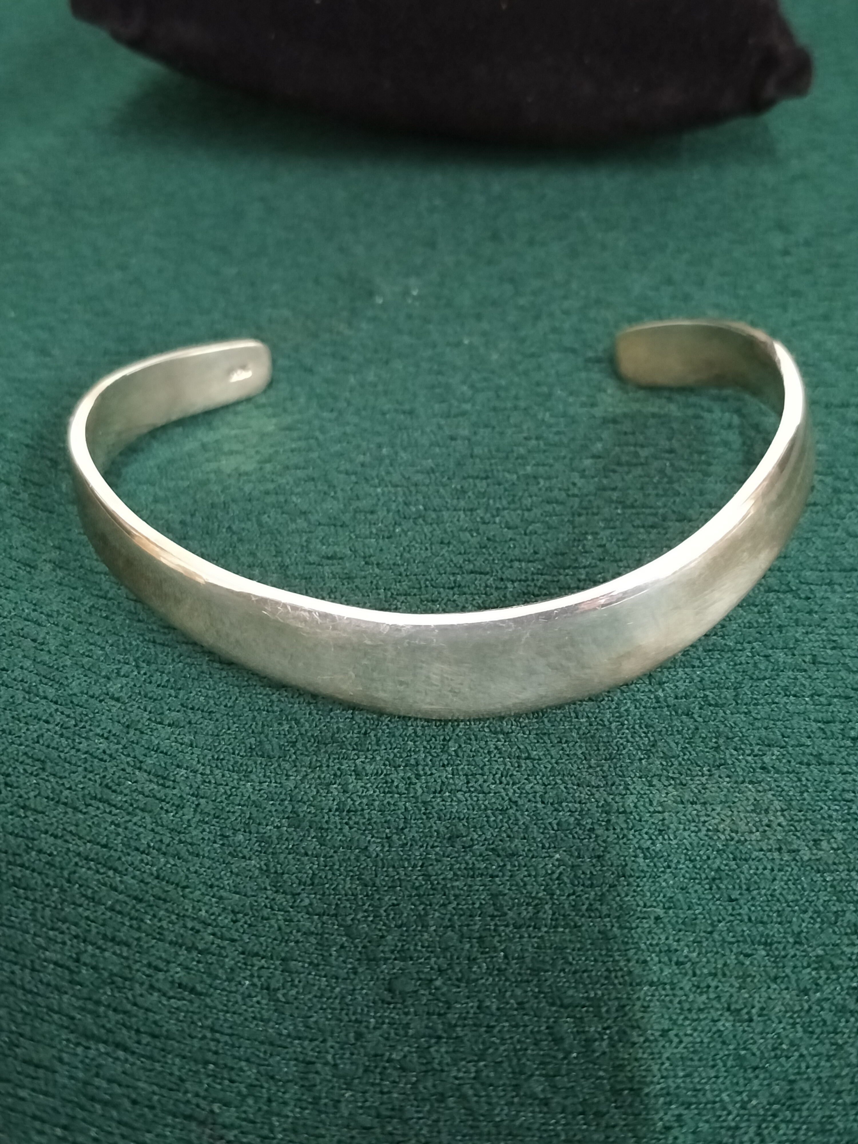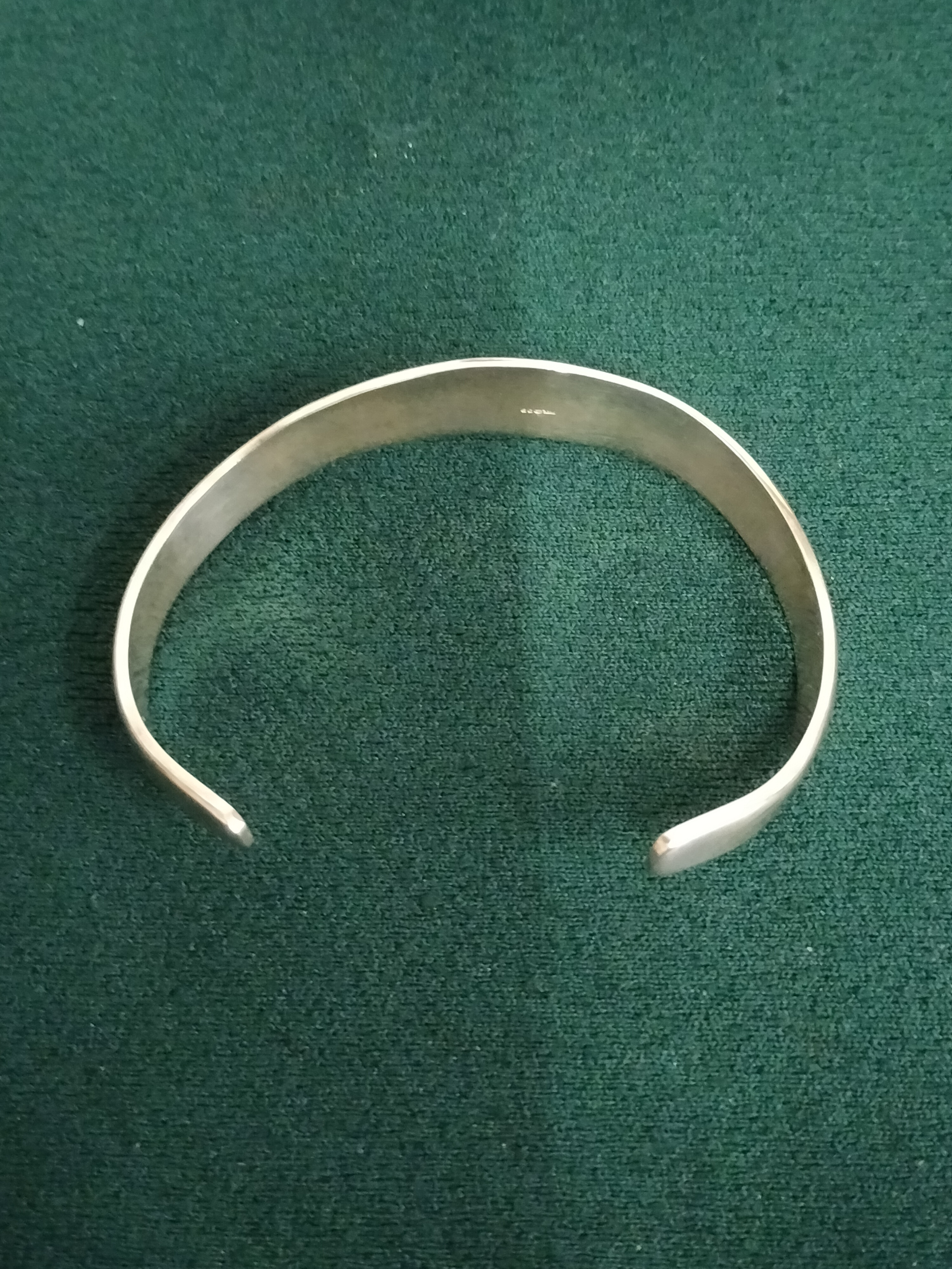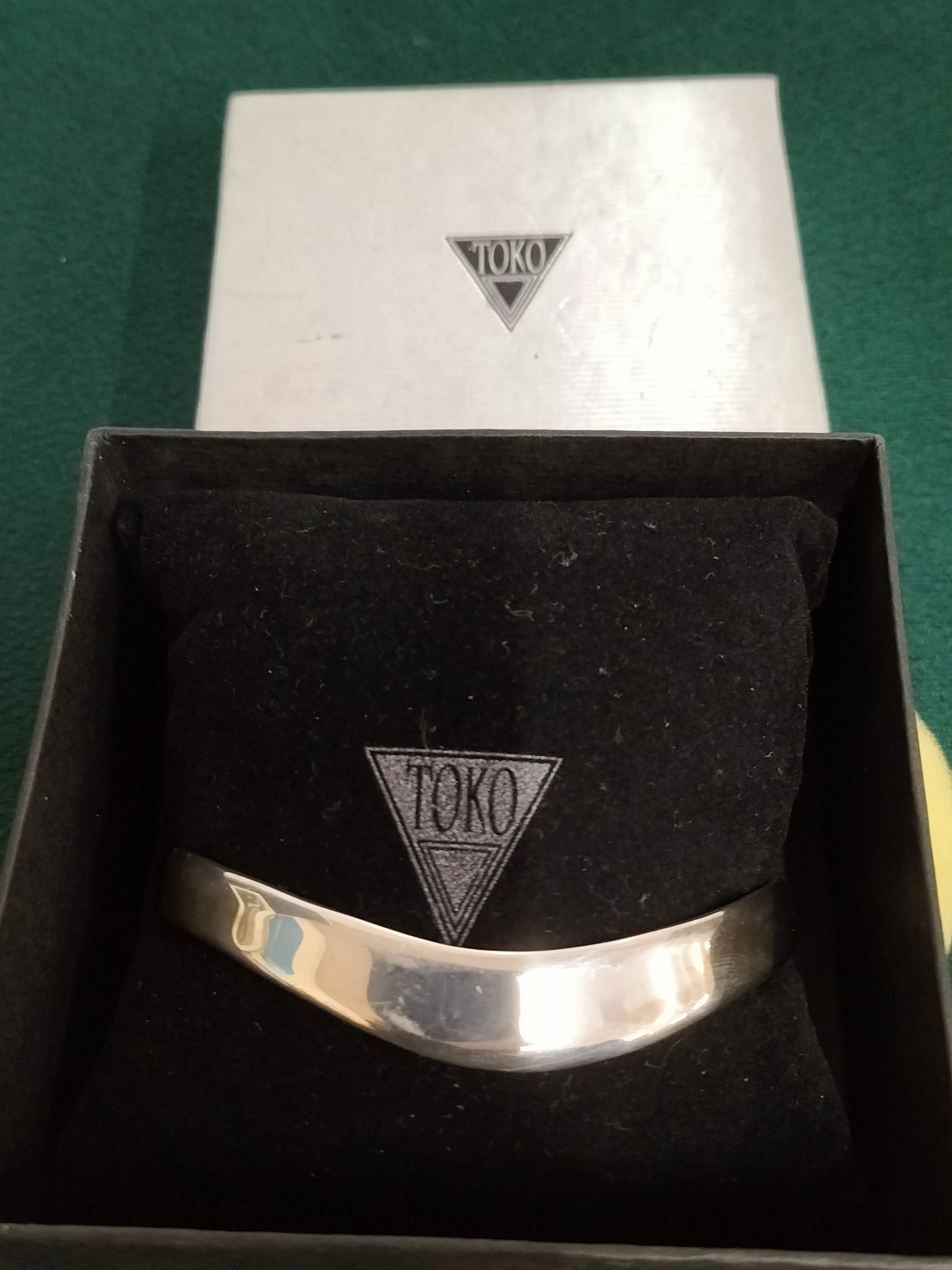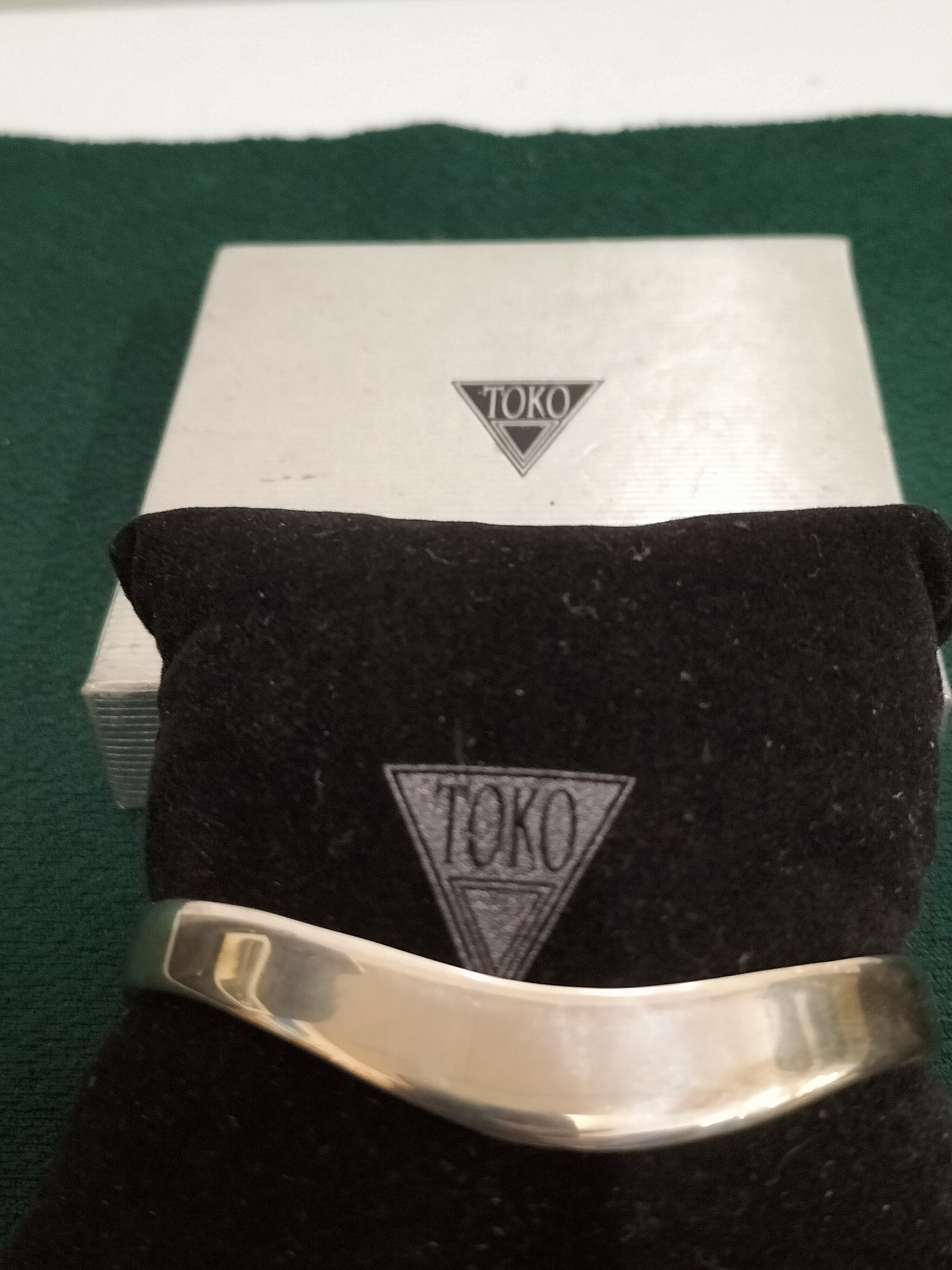 A silver Torque cuff bracelet featuring a polished finish and a slight curve, accompanied by its original TOKO branded box and display cushion.