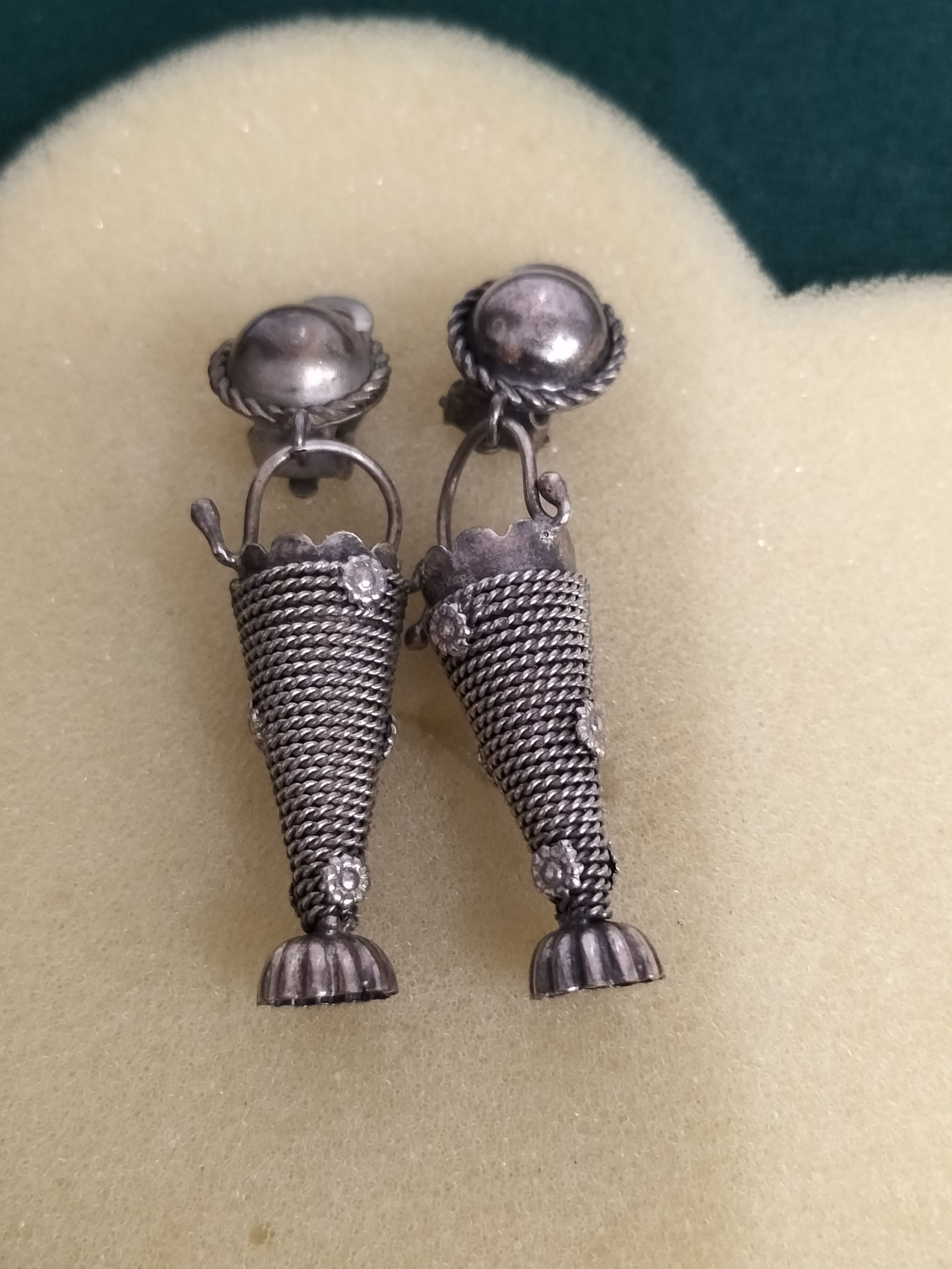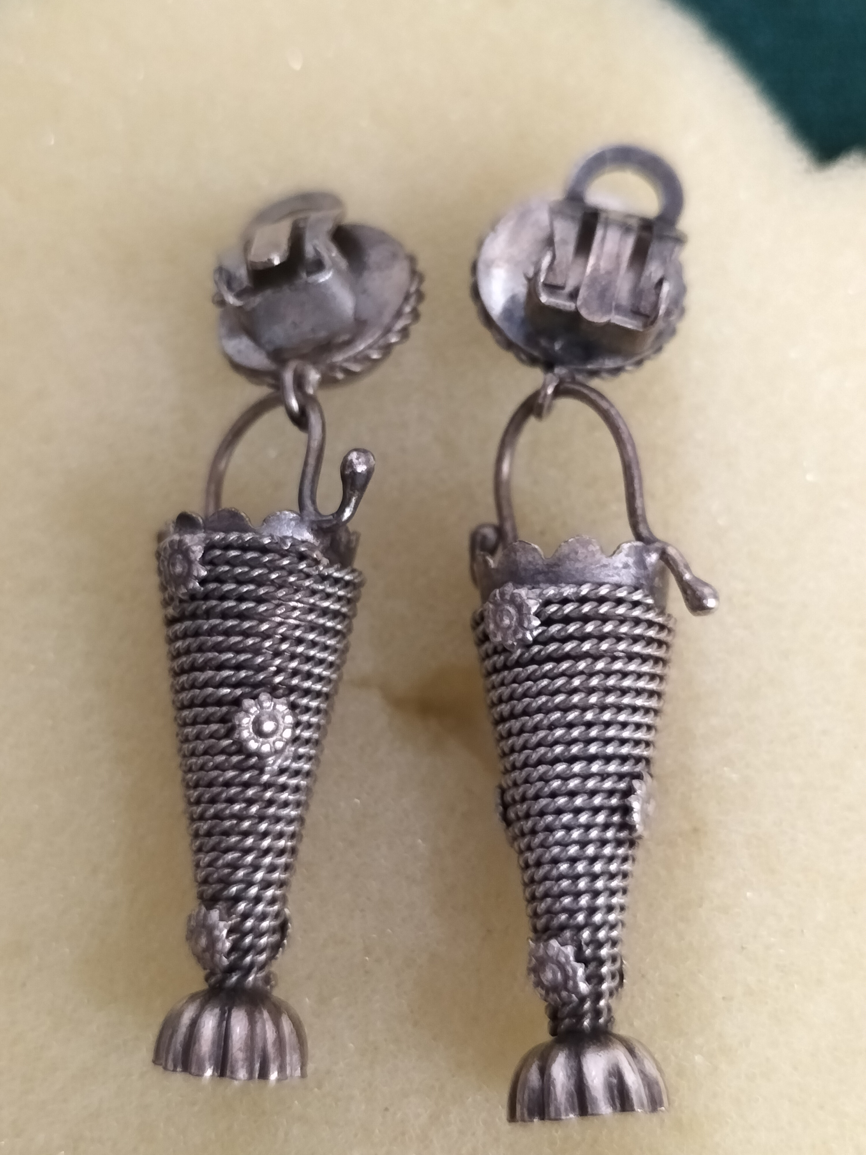 A pair of silver-toned clip-on earrings featuring a tapered wire-wrapped cone design with decorative floral accents.
