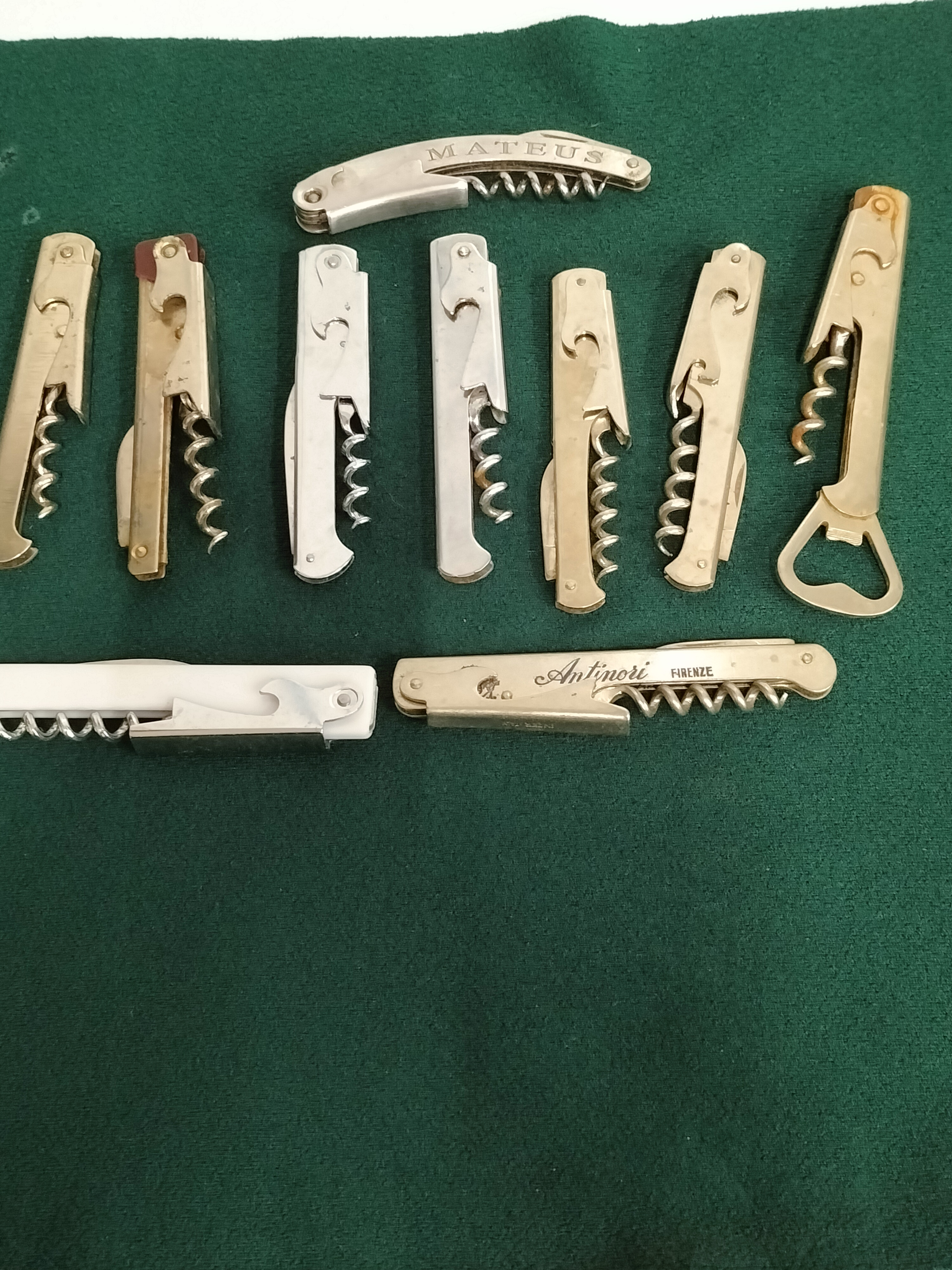 A collection of silver and gold-toned metal waiter style corkscrews including examples inscribed Mateus and Antinori Firenze.