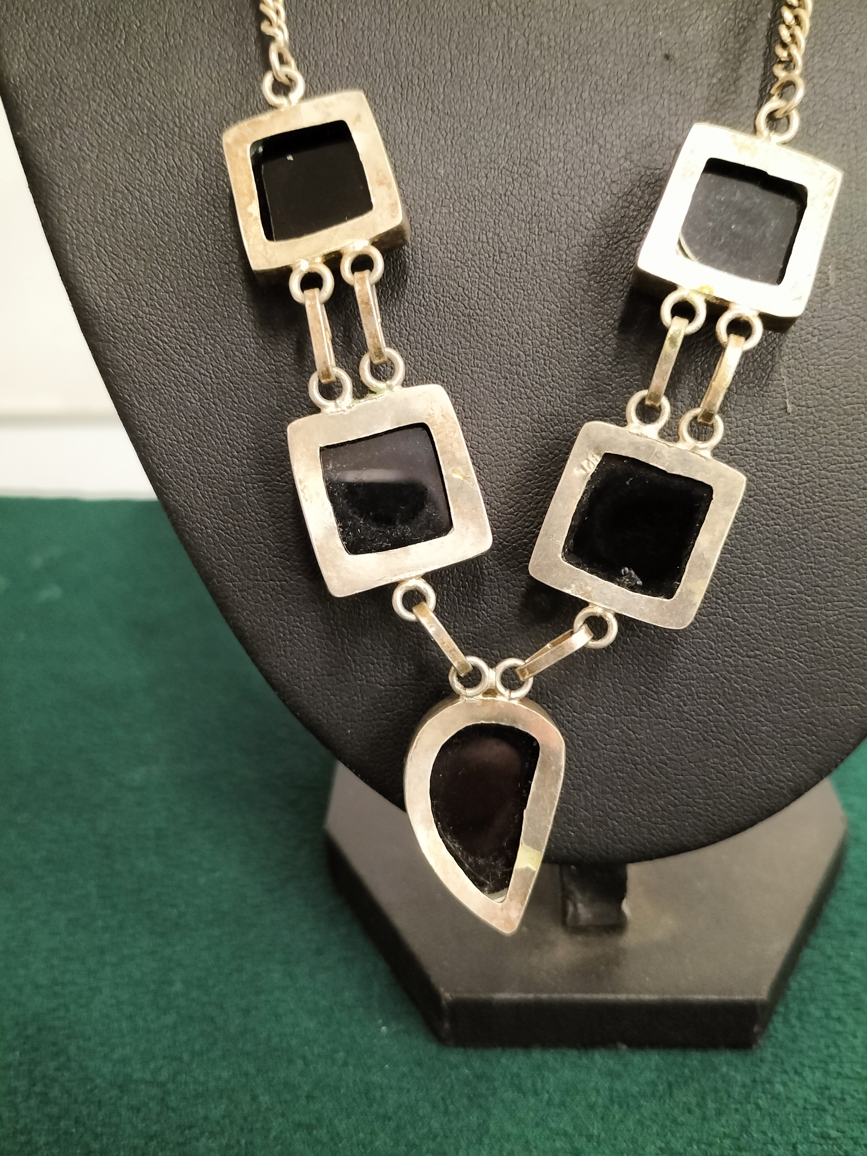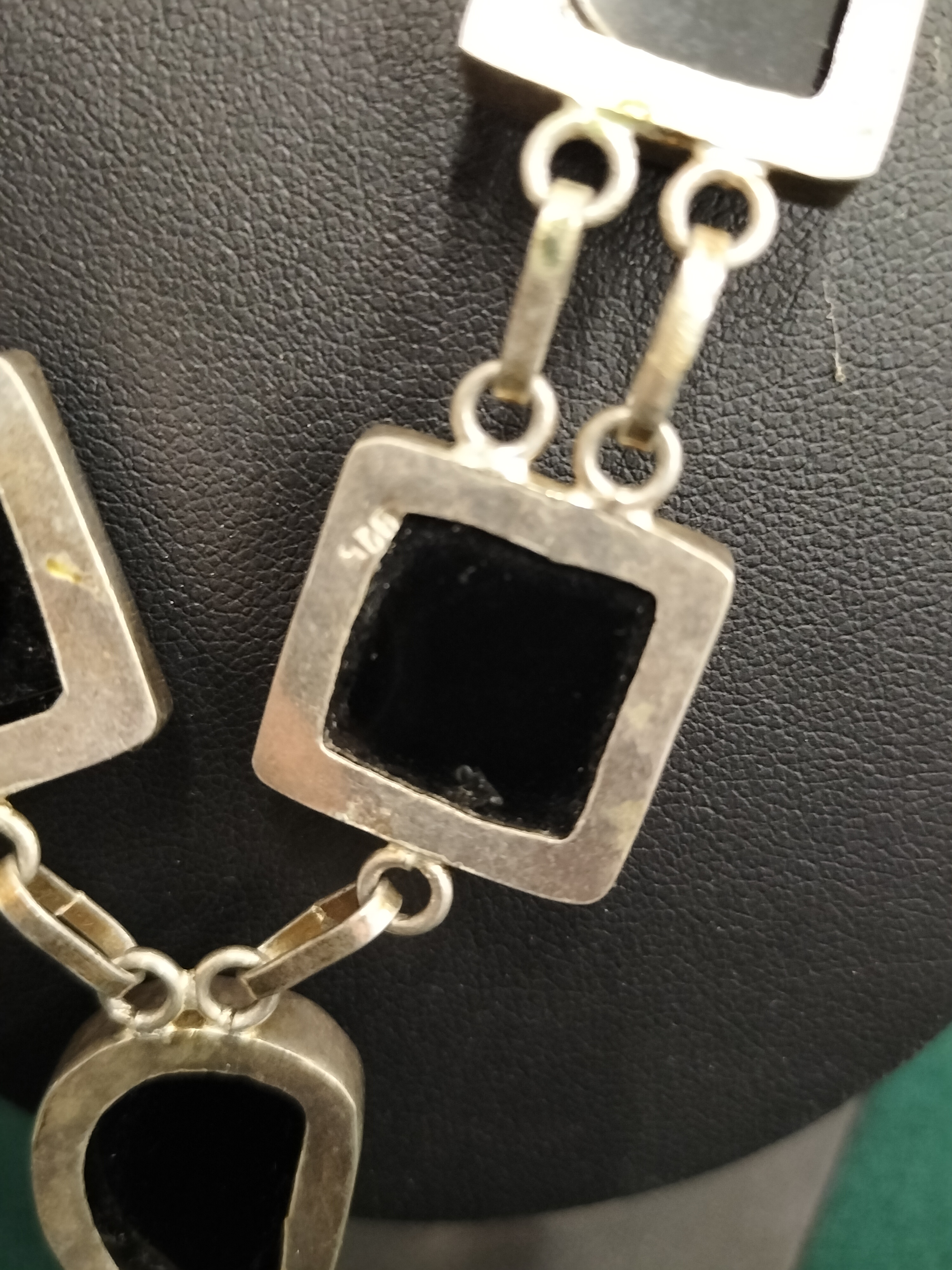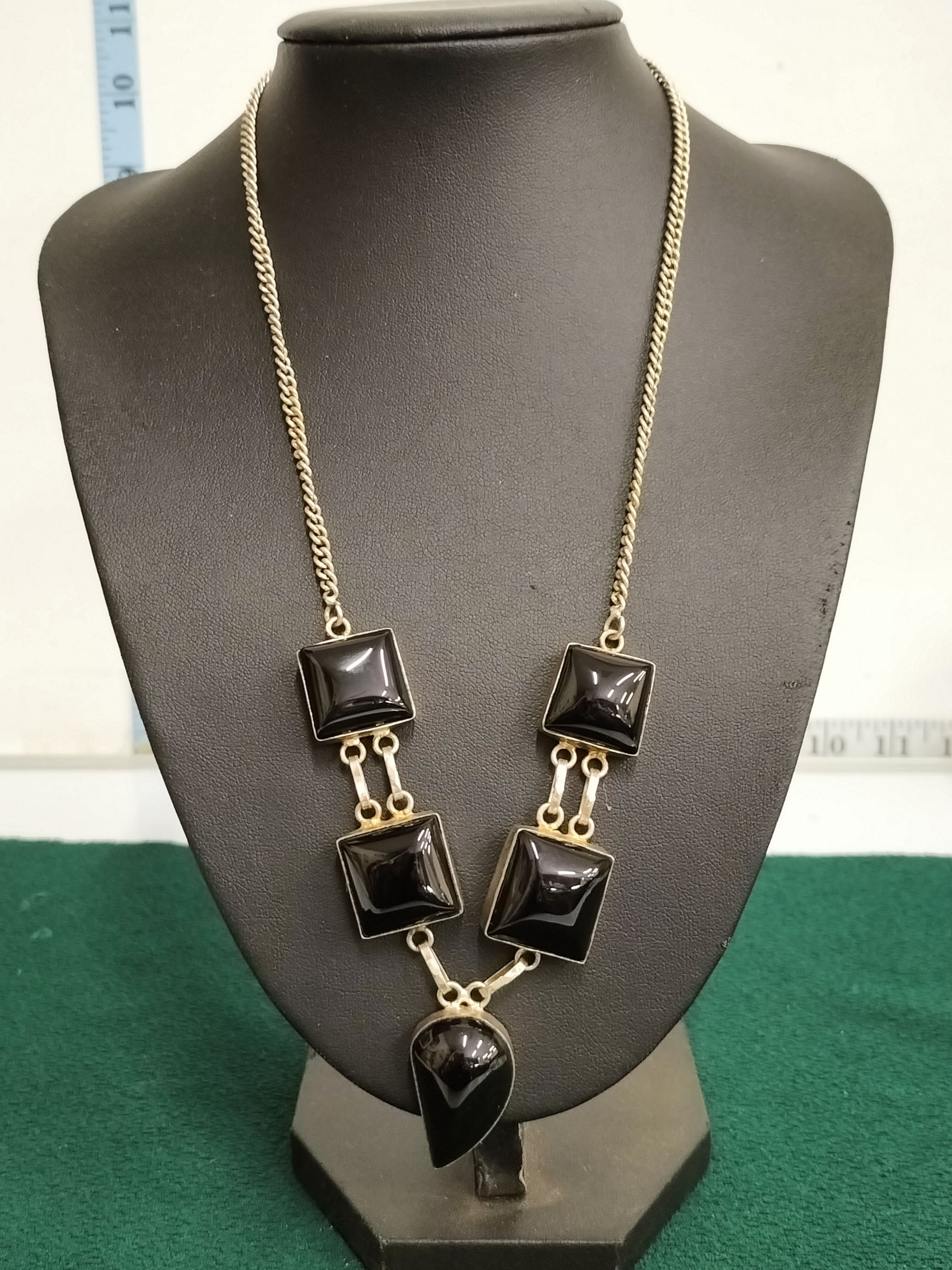 A sterling silver necklace featuring four square and one teardrop-shaped black onyx cabochon stones, marked 925 to the reverse.