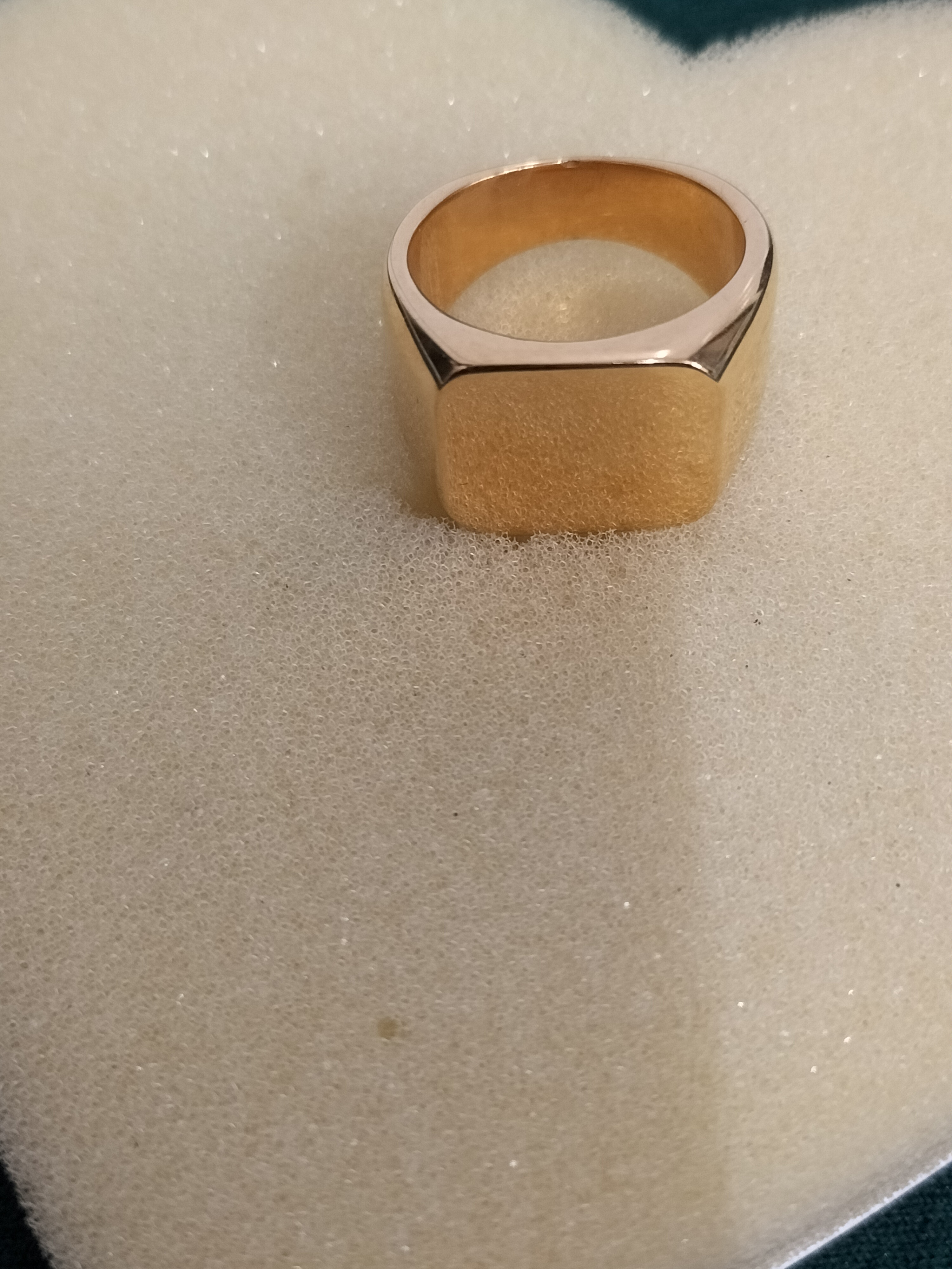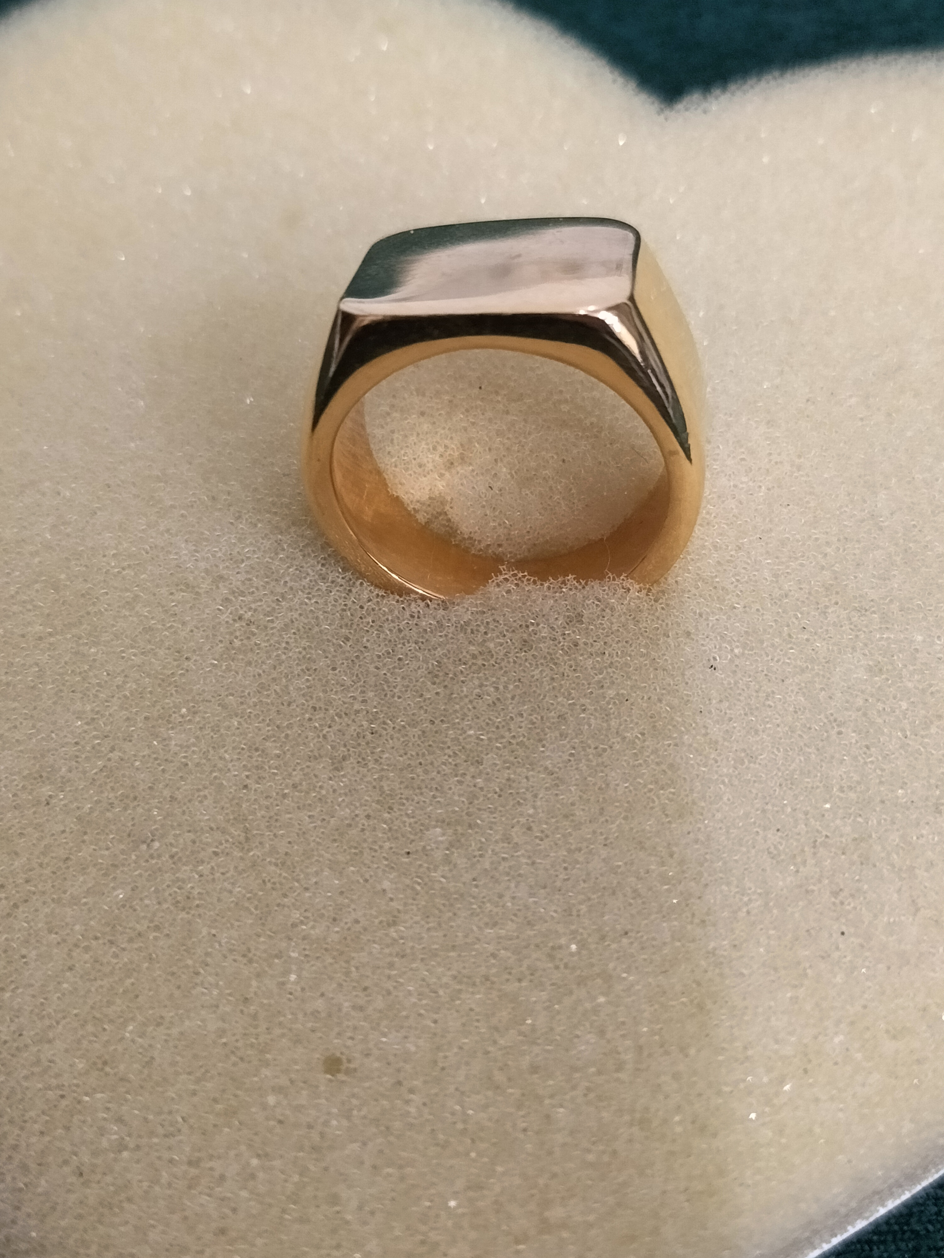 A gold toned signet ring featuring a polished rectangular face and a plain band with no visible markings.