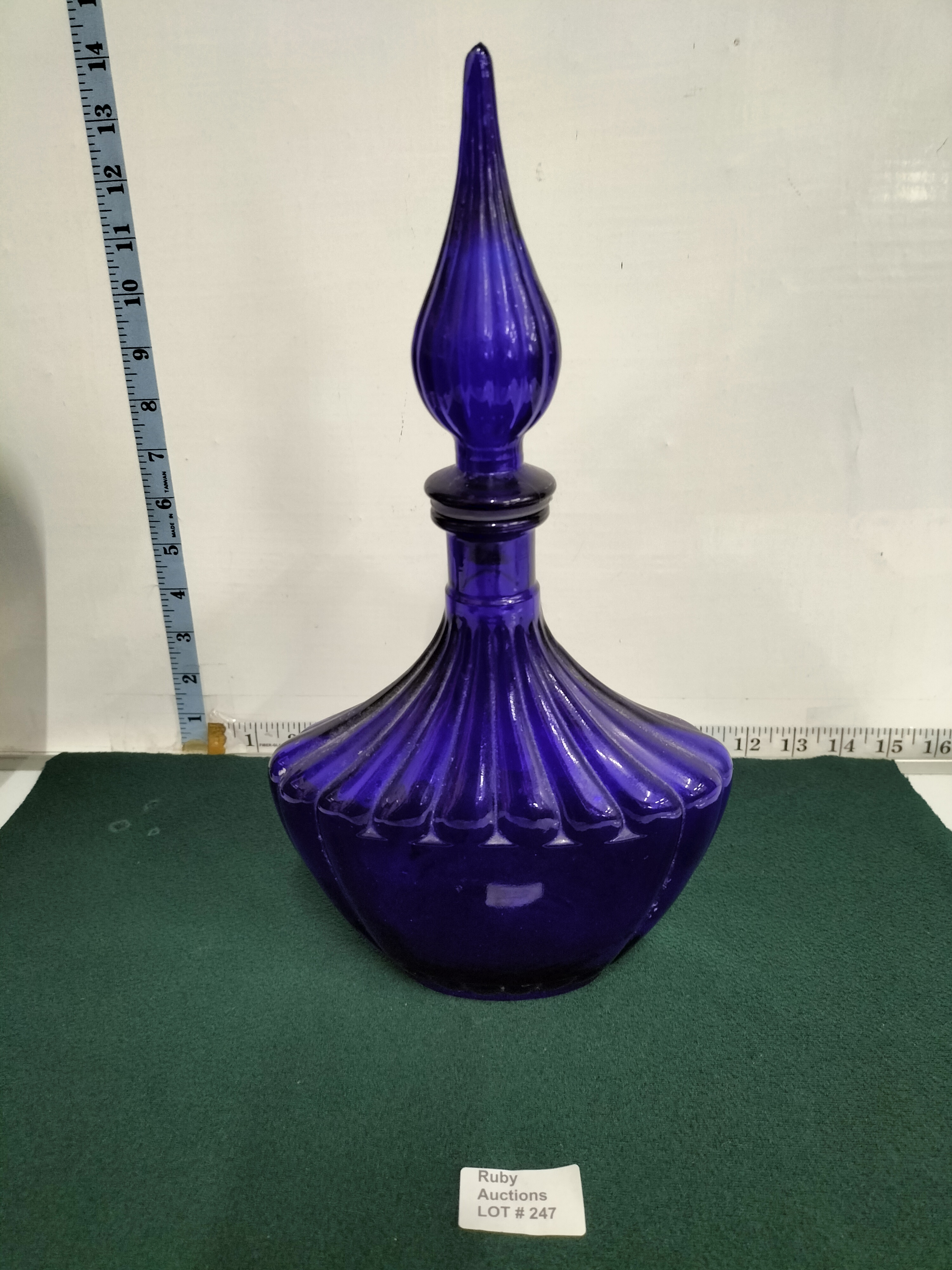 A cobalt blue glass decanter with a ribbed texture and a tall pointed stopper, measuring approximately 14 inches in height.