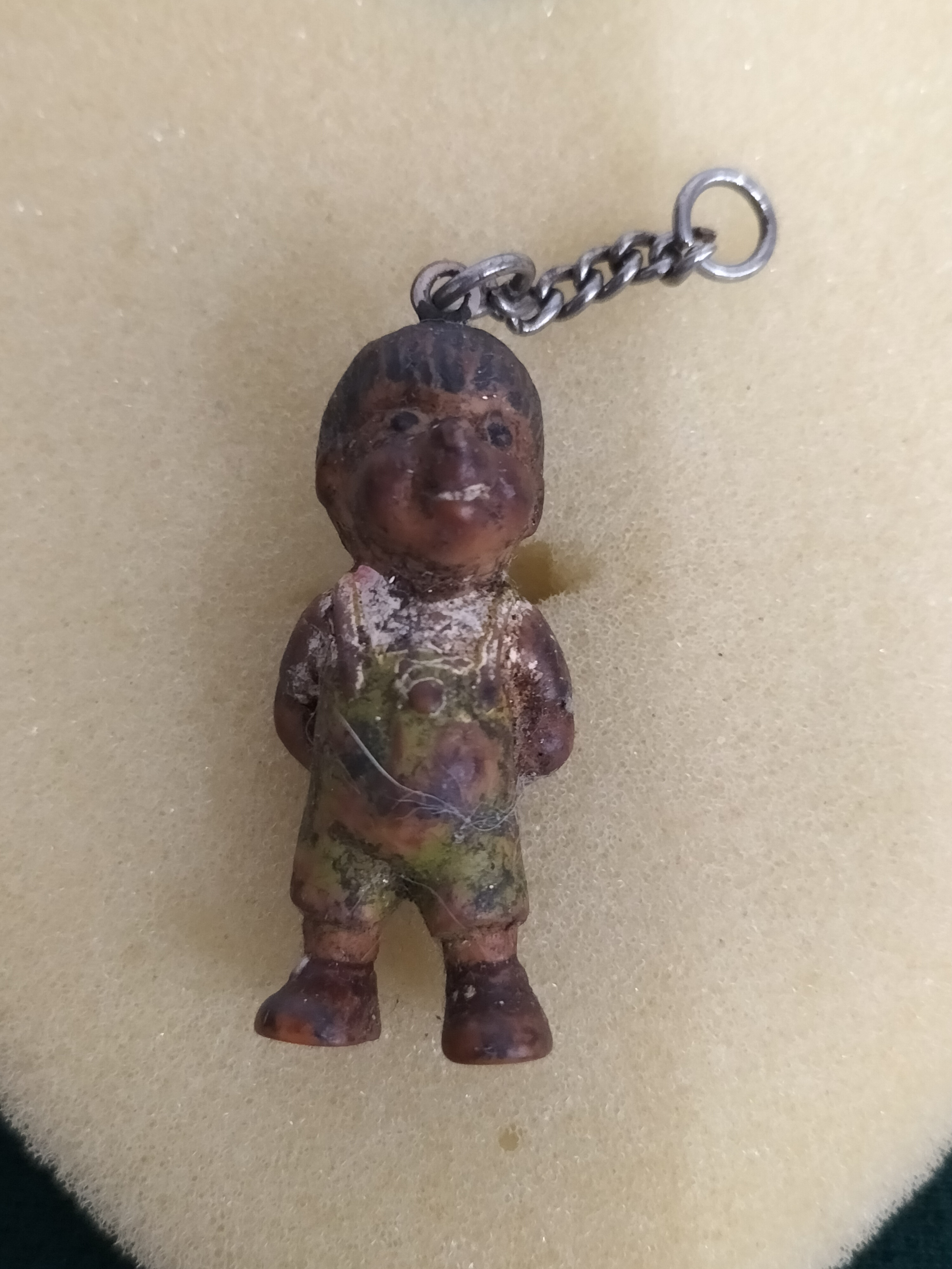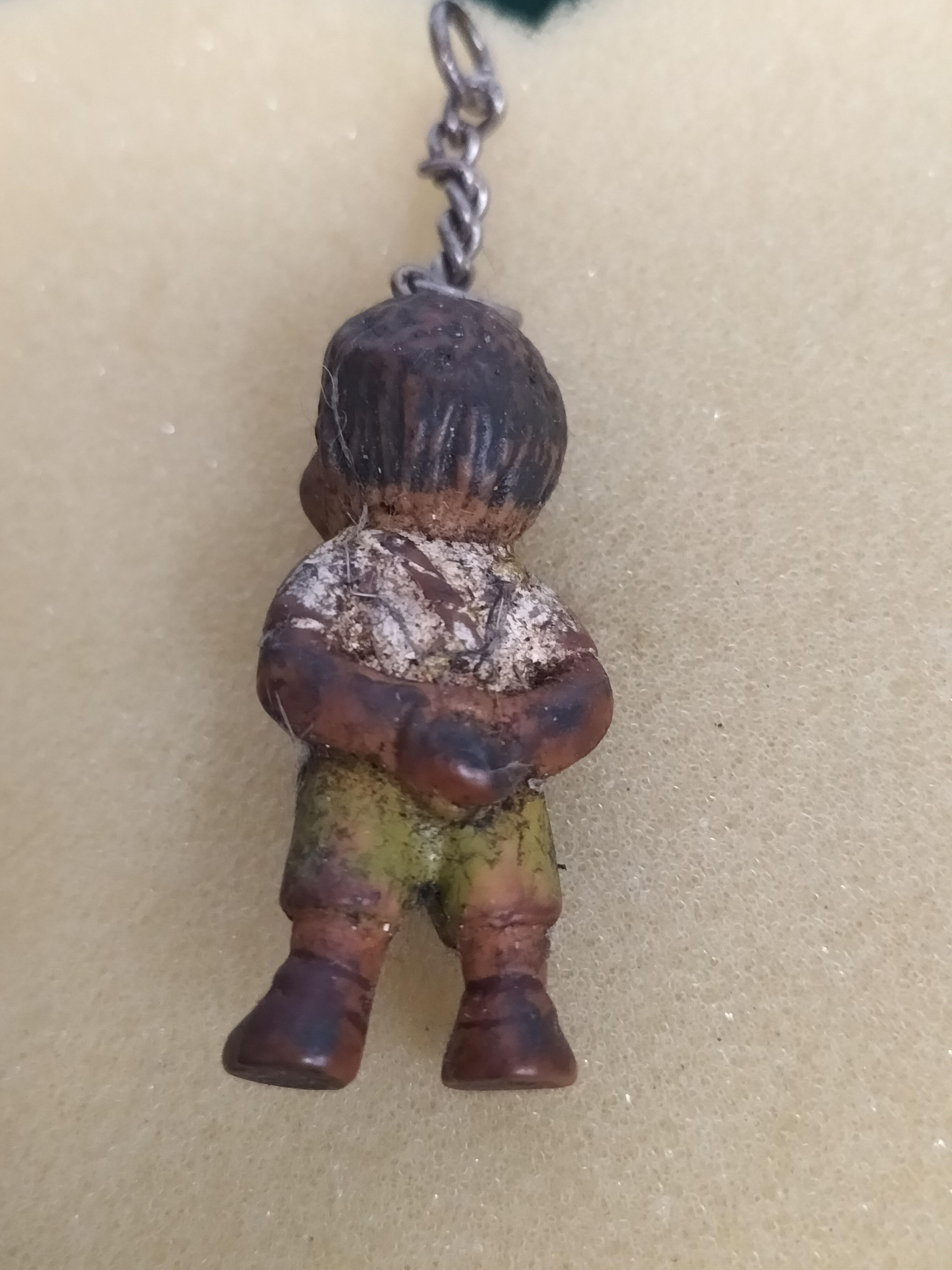 Rare Stieff figurine charm of a boy with hands behind his back, featuring brown and tan tones with green and white clothing accents and an attached metal chain.