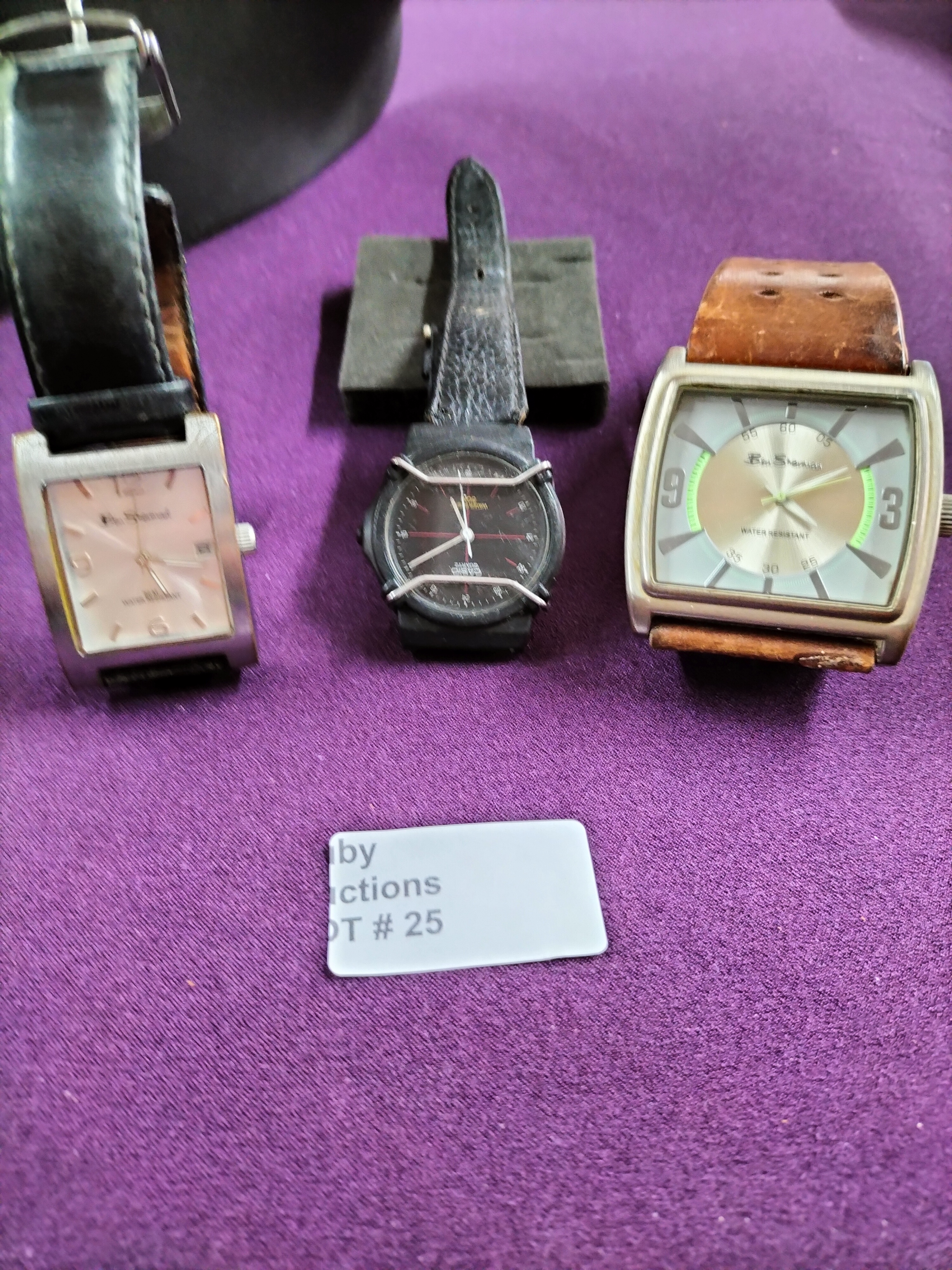A trio of gents quartz wristwatches featuring two Ben Sherman models with leather straps and one Casio Quartz model with a black strap and protective bars.