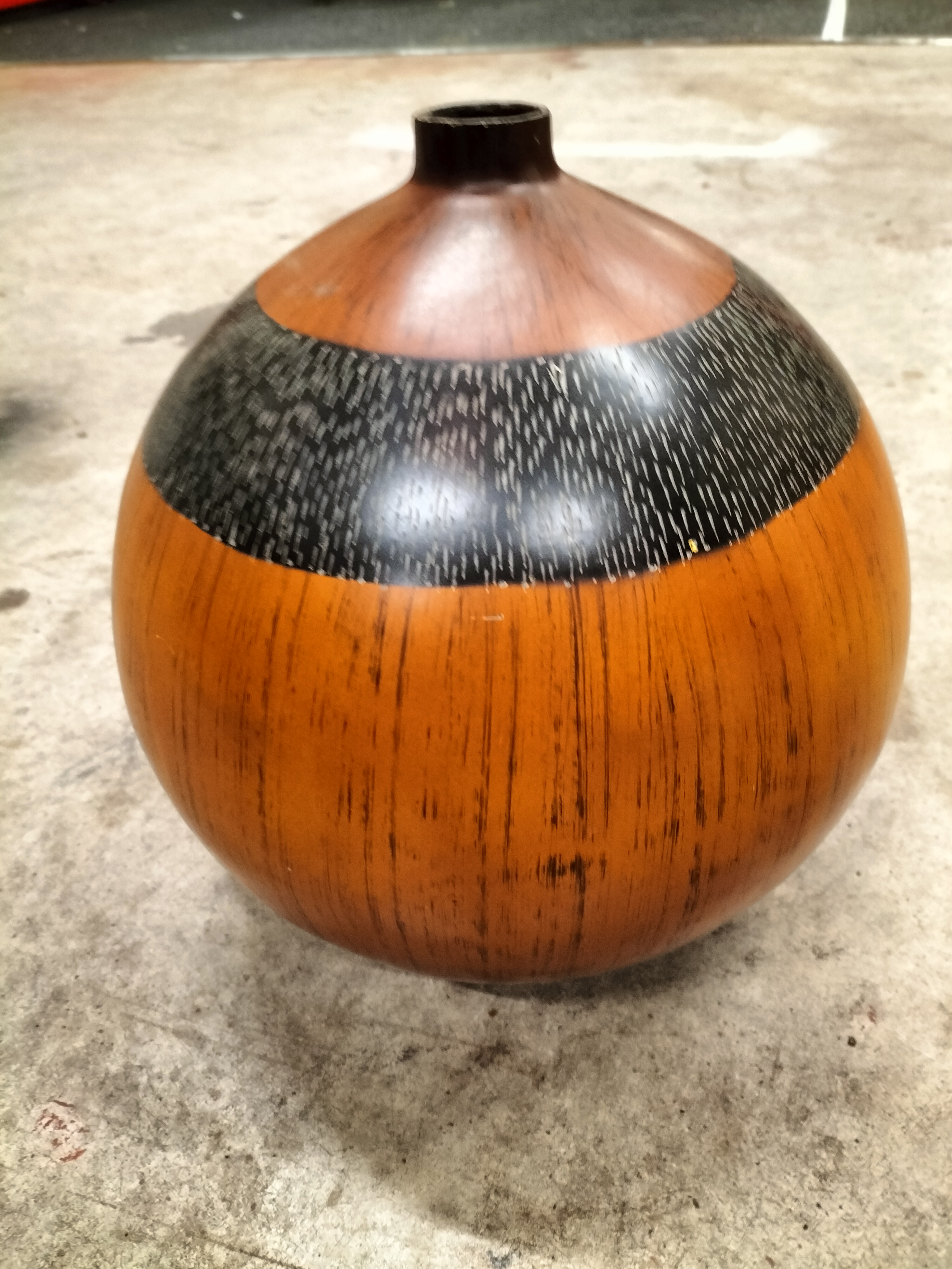 A spherical wooden vase in shades of brown and orange featuring a wide textured black decorative band around the upper portion.