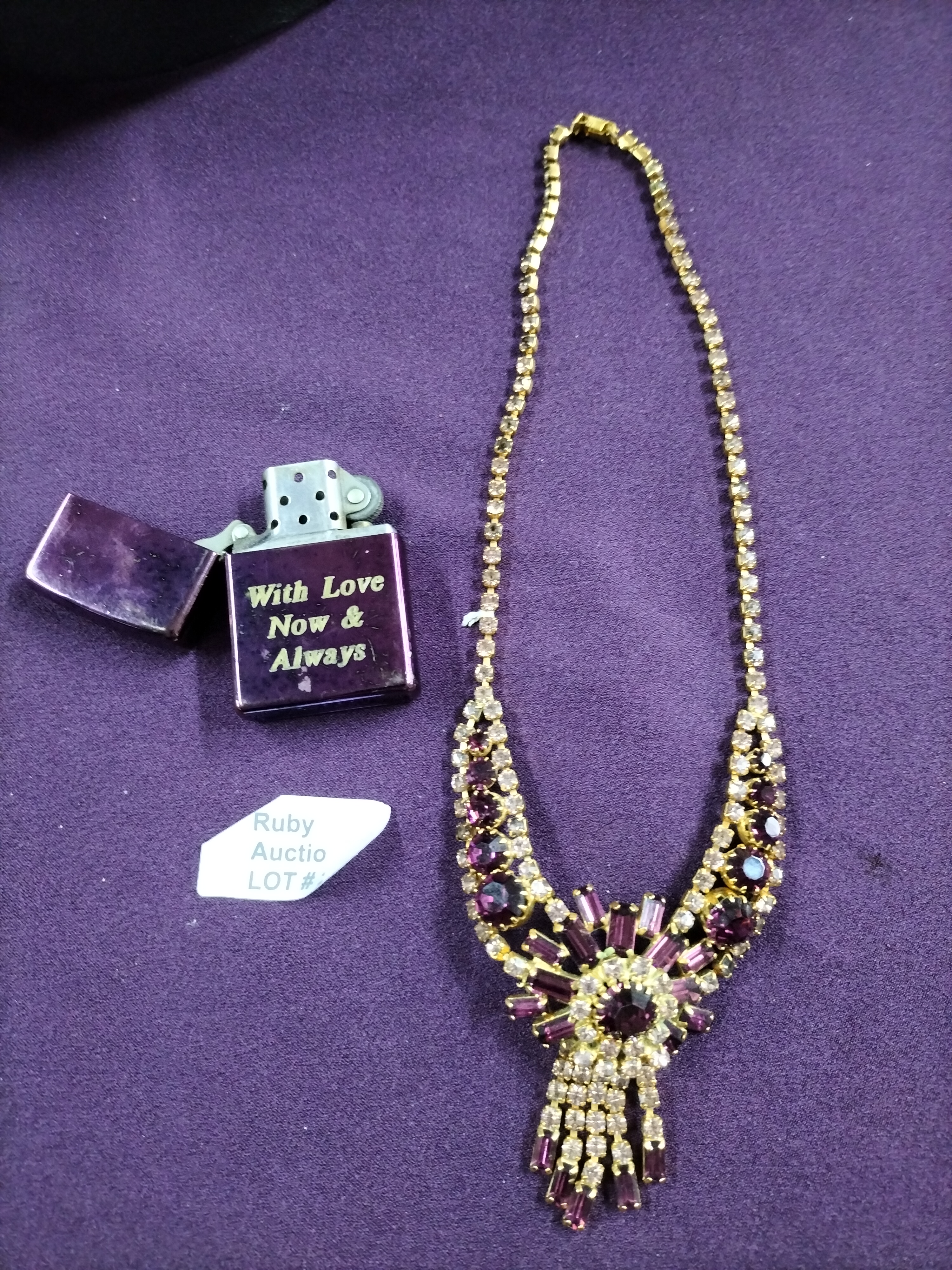 A purple flip-top lighter inscribed With Love Now & Always and a gold-tone necklace accented with purple and clear rhinestones.