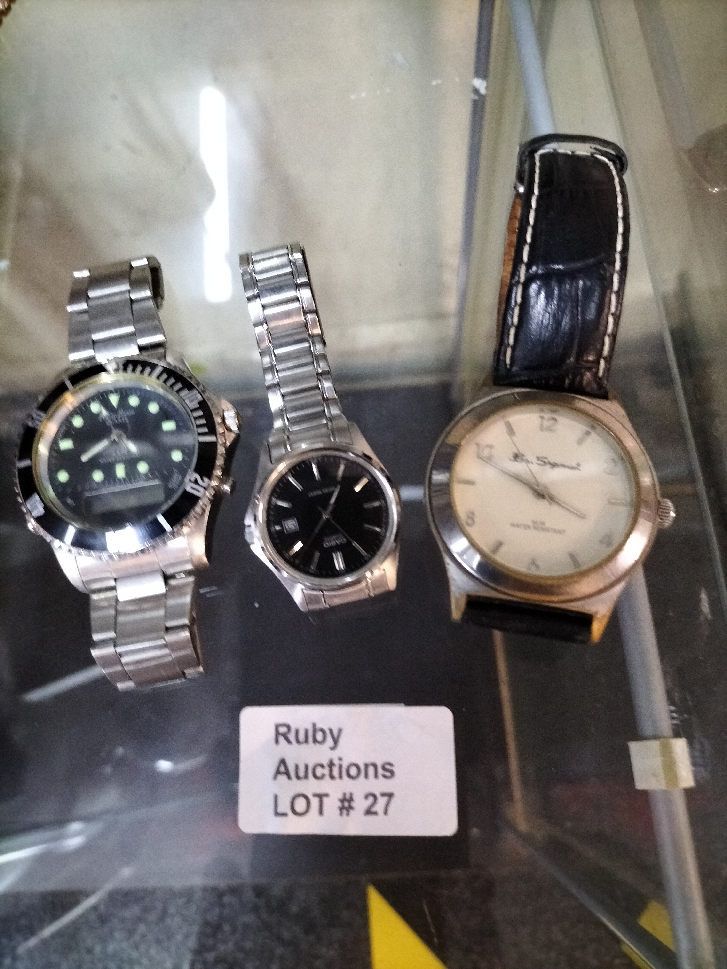 Three silver-toned wristwatches by Casio, Ben Sherman, and Adventure featuring black and white dials with metal and leather straps.