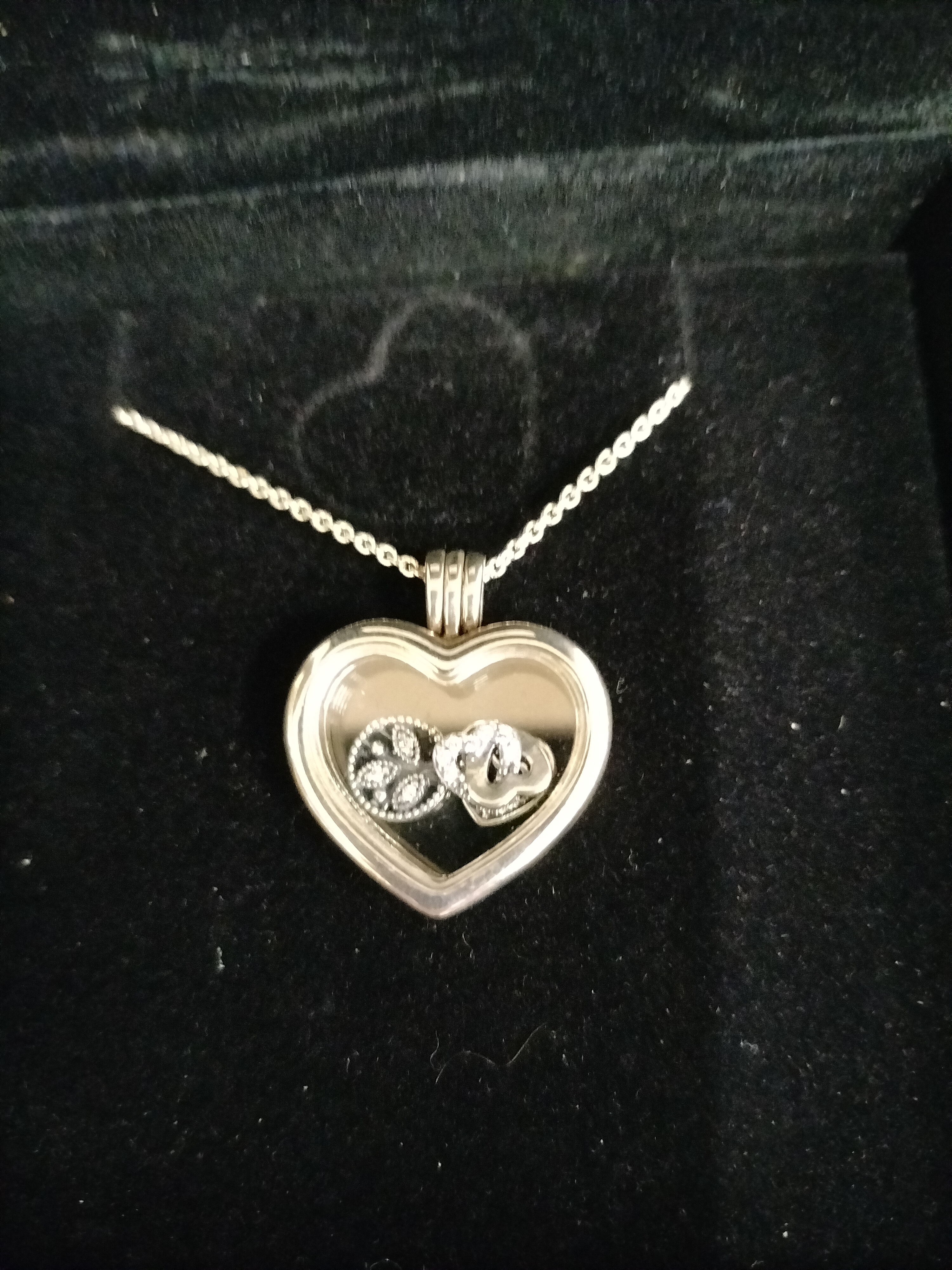 A silver Pandora necklace featuring a heart shaped floating locket pendant containing two small decorative charms, presented in a white display box with a black velvet interior.