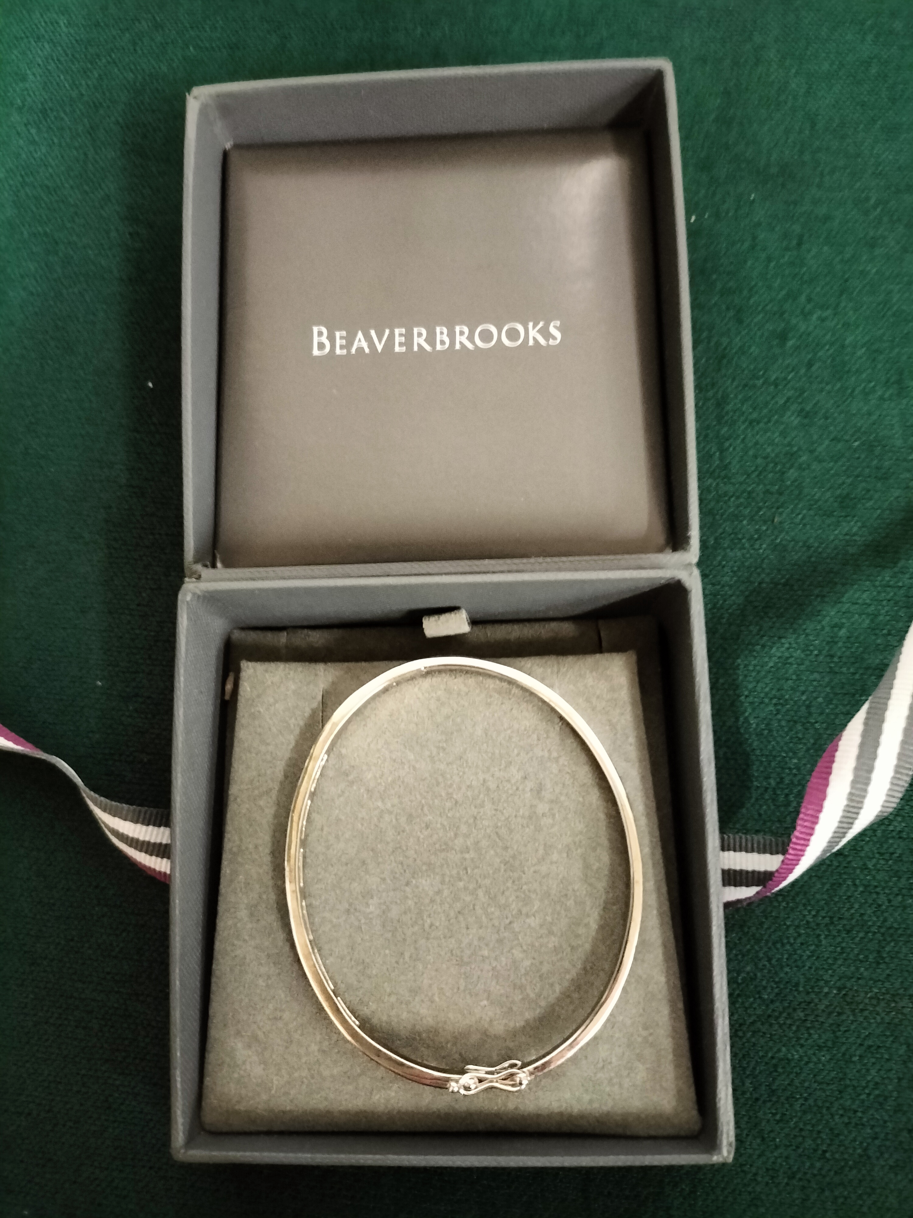 A silver metal hinged bangle with a safety clasp presented in a grey Beaverbrooks jewellery box.