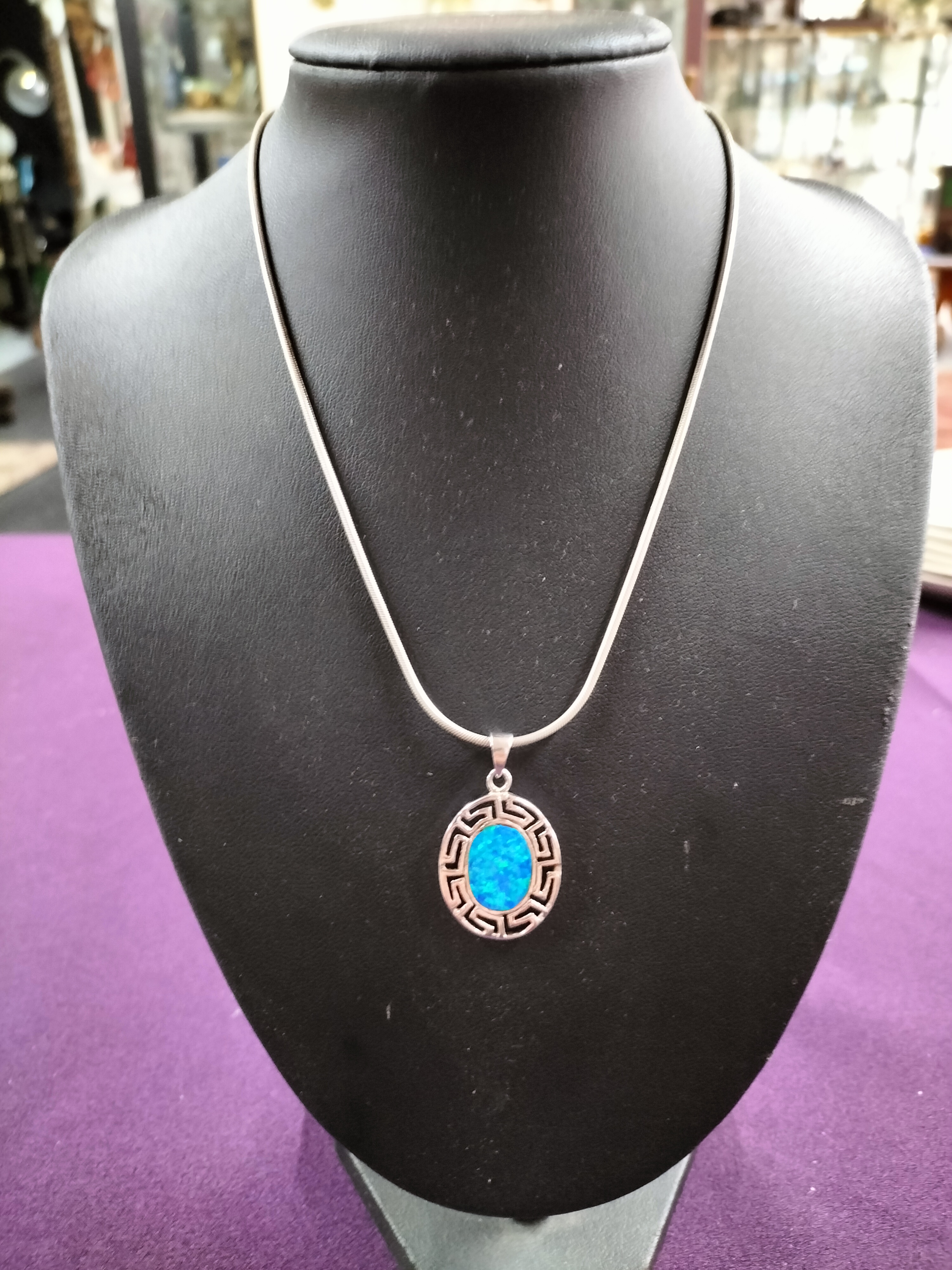 A silver necklace featuring an oval pendant set with a blue iridescent stone within a Greek key border.